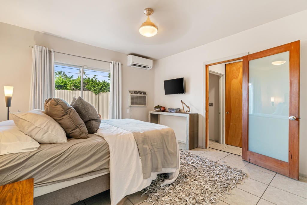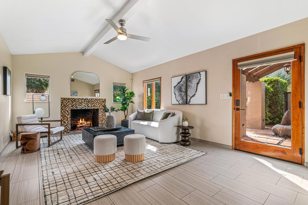 Unit A (vacant) is a thoughtfully designed bungalow style 1-bedroom, 2-bath residence with a versatile den featuring a Murphy bed for guests. The spacious living room opens to the pool with sweeping mountain views and has a cozy gas fireplace creating a warm gathering space on cooler evenings. Updated porcelain tile flooring throughout. Gourmet kitchen with chef's island, stainless steel appliances (Viking gas range), wine cooler, and brand-new washer/dryer. Primary bedroom with ensuite bathroom. Private front yard with desert landscaping. Dedicated parking spaces with remote access gate. Unit B (vacant) is an impressive 2-bedroom, 2-bath unit that spans two levels with soaring ceilings and celestial windows for abundant natural light. A cozy second-floor bedroom includes a walk-in closet and balcony with room for seating to enjoy spectacular mountain views. Spacious kitchen with walk-in pantry, dual refrigerators, and newer appliances. Main-level primary bedroom with private patio and bath with step-in tub. Open concept living room with sliders on both sides for light and airflow. Private side yard with mountain views. Dedicated parking spaces with remote access gate. Property includes heated PebbleTec pool and spa with outdoor shower and patios for each unit. Separate electric, gas and water meters. Laundry in each unit. Corner lot providing maximum privacy and separation between units This is more than a duplex it's a desert retreat with built-in income potential. Whether you're envisioning a private Palm Springs compound, or a long-term investment, this property adapts to your vision.