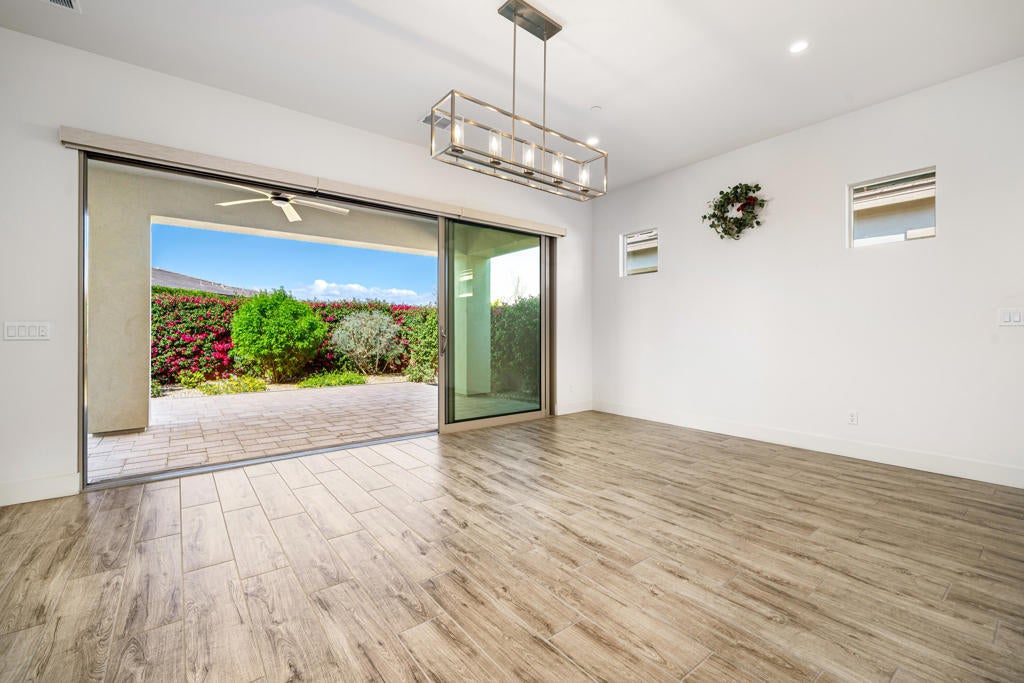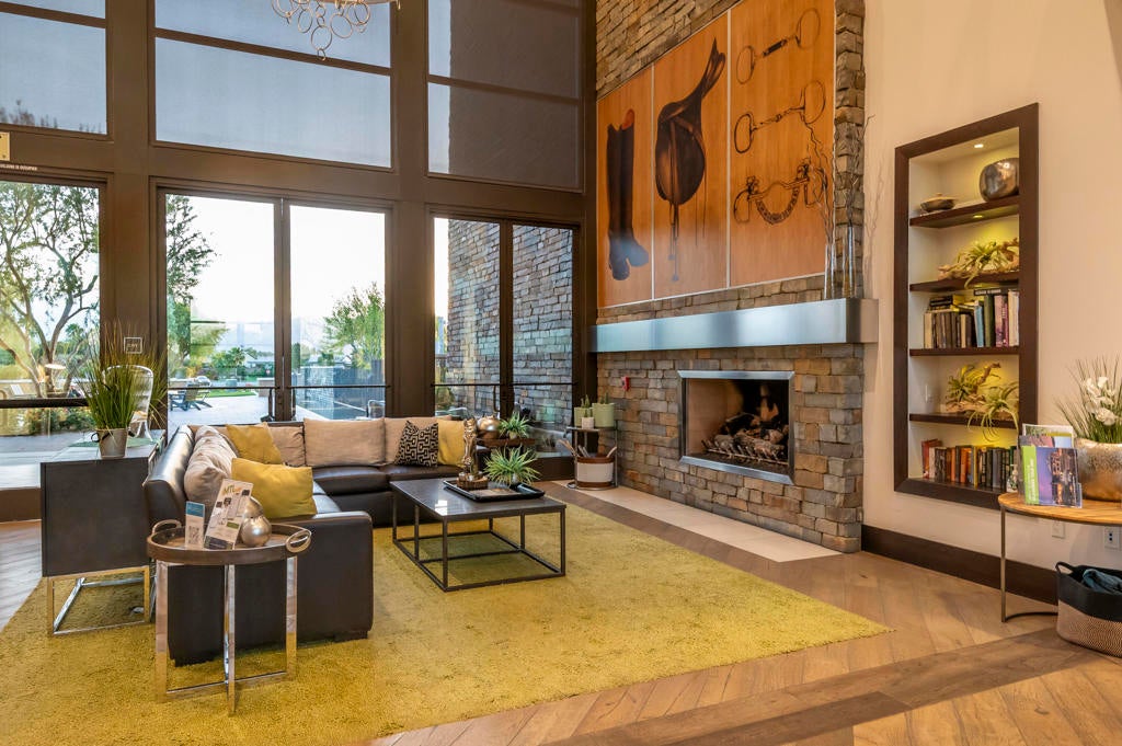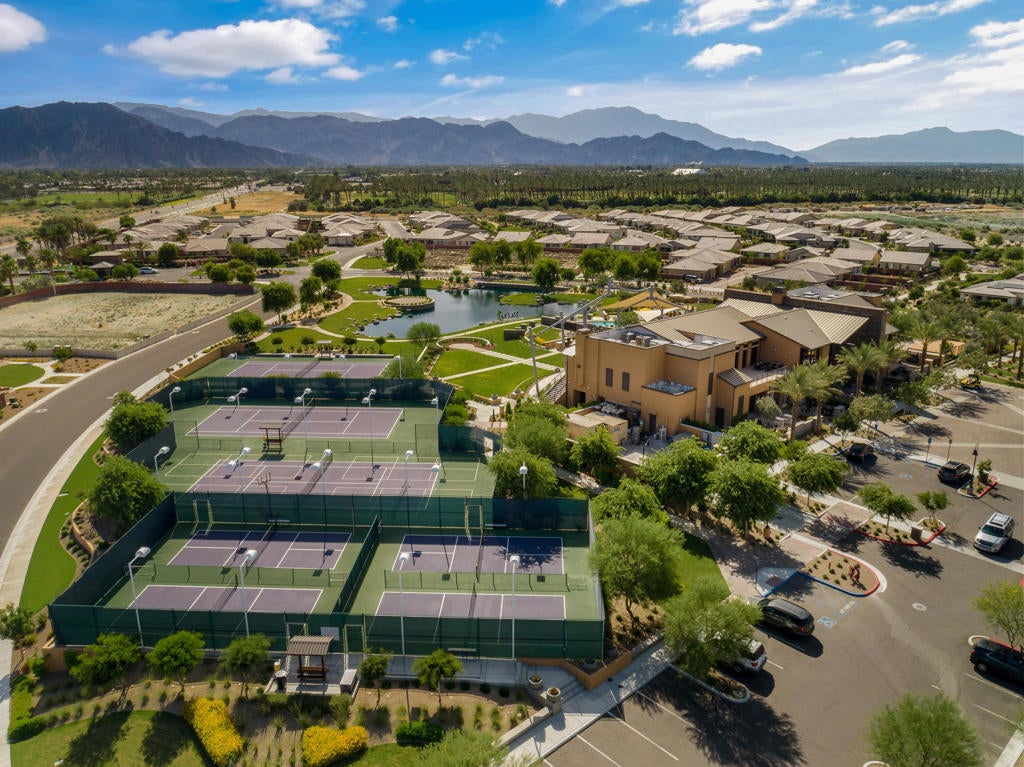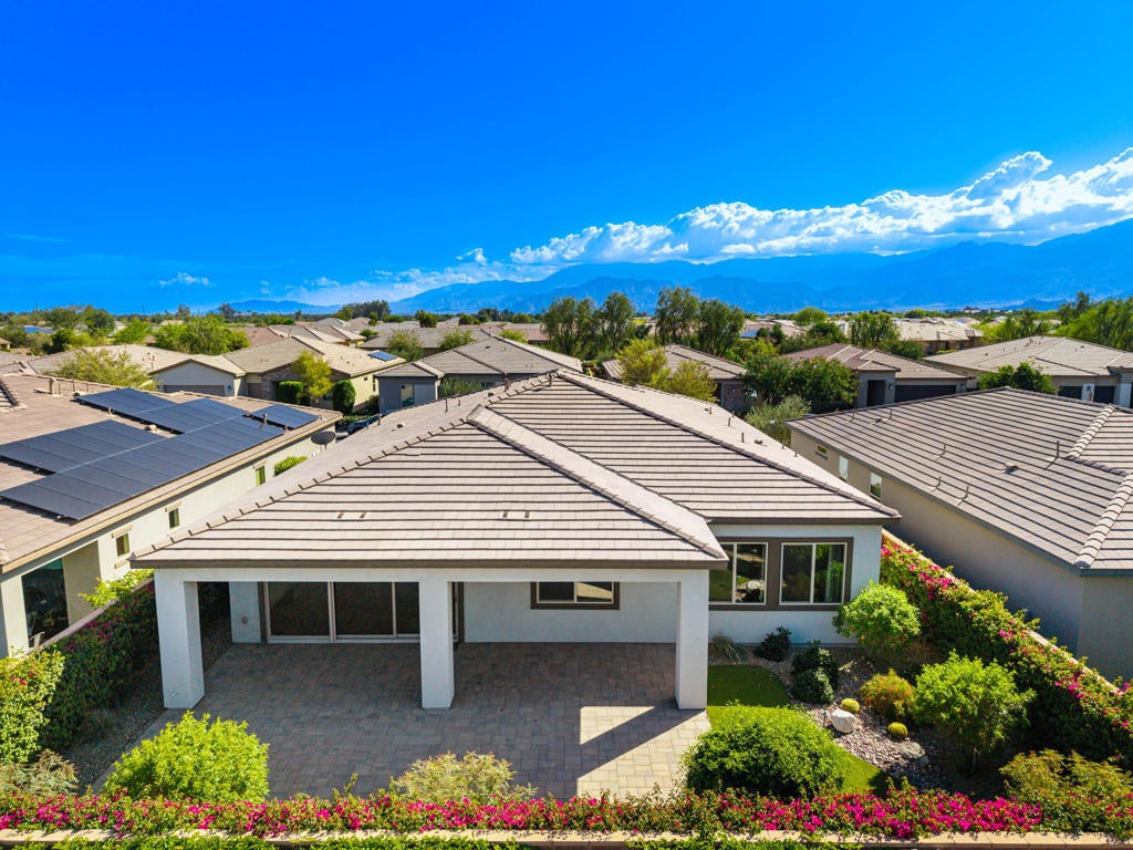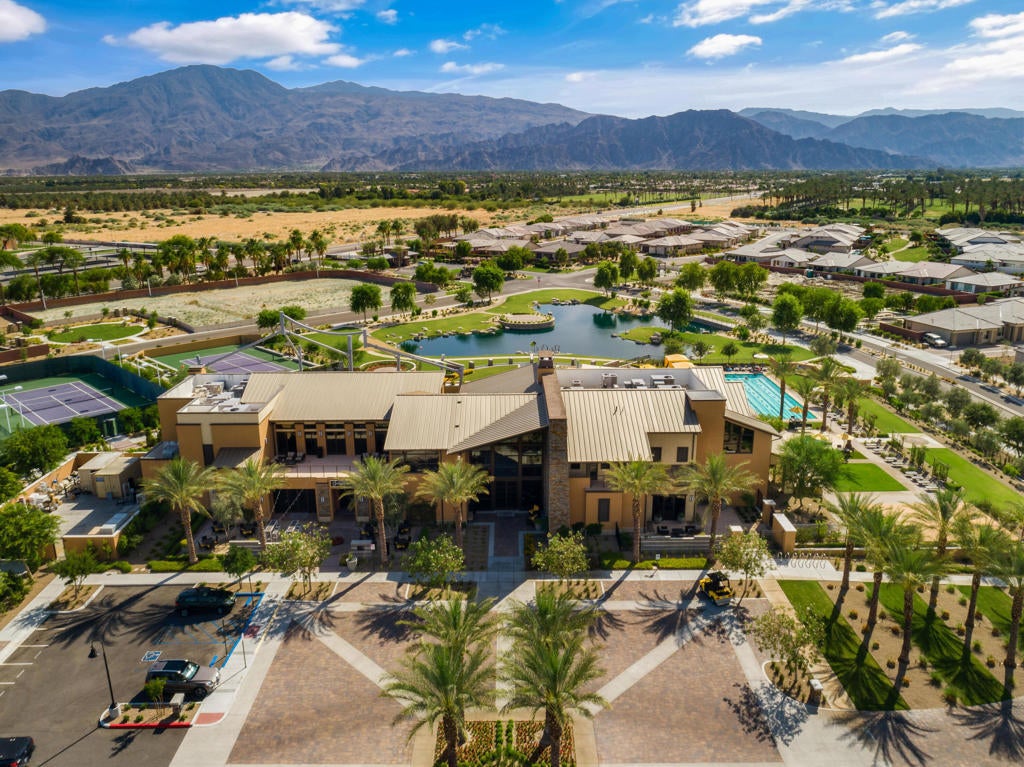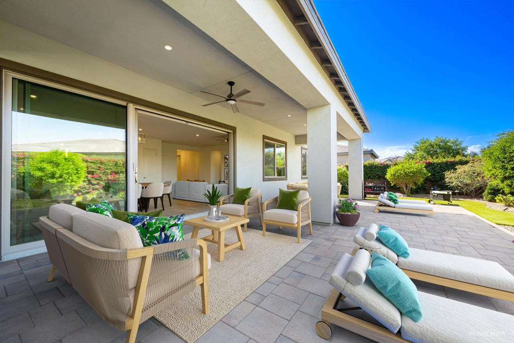 Life at the Trilogy Polo Club is among the finest in the Coachella Valley. This stunning contemporary Liberty model 2,357 square foot, 3-bedroom, 3-full baths home with office, is upgraded to the max. The quality and artful design of the home and natural beauty of the Polo Club resort makes every day living extraordinary. Once inside your greeted by 10 ft. ceilings, sparkling custom lighting, and inviting wide-plank tile floors. Off the hallway is an executive-sized room with tall custom glass doors perfect as an office, study or game room. The great room with a large linear fireplace, 70'' big screen TV against a wall of marble is a great place to relax, read, and stream your favorite shows. The windows feature custom electric shades, and a 5-ton Lennox gas heating and cooling system with UV sterilization and whole house attic air filter keep air quality and temperature perfect year-round. A wall of triple glass sliding doors provides a seamless flow between indoor and outdoor living and entertaining. The beautifully landscaped private backyard with covered patio and ceiling fan is a peaceful place to enjoy by day. By night, watch the brilliant colors of the sunset and the landscape light up against the dark night sky. The gourmet kitchen is inspiring with an abundance of custom white shaker cabinets, radiant quartz countertops against a custom glass subway tile backsplash and grand center island with pendant lighting. Upgraded professional stainless appliances include a six-burner gas cooktop and custom range hood, new refrigerator, oven, microwave, and dishwasher. The generous size and pantry make it easy to keep all your cooking appliances neatly tucked away. The spacious primary bedroom is a luxury retreat, with a built-in linear fireplace and above and opening for a 70'' TV. The sumptuous bath radiates luxury with quartz counters and a large walk-in shower with custom tiles to the ceiling. The walk-in closet is thoughtful in design with custom built-ins to accommodate even the most prolific shoppers. Two comfortable additional guest bedrooms are located away from the primary bedroom. One is an ensuite with a full bath and walk-in closet while the third guest bedroom with an adjacent full bath, could double as an office with built-in cabinets and shelves plus a closet. The laundry room is oversized with white shaker cabinets, washer, dryer and deep sink. The 2-car plus extra golf cart garage has an epoxy flooring and built-in tool chest and storage.