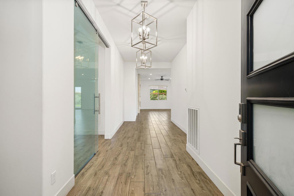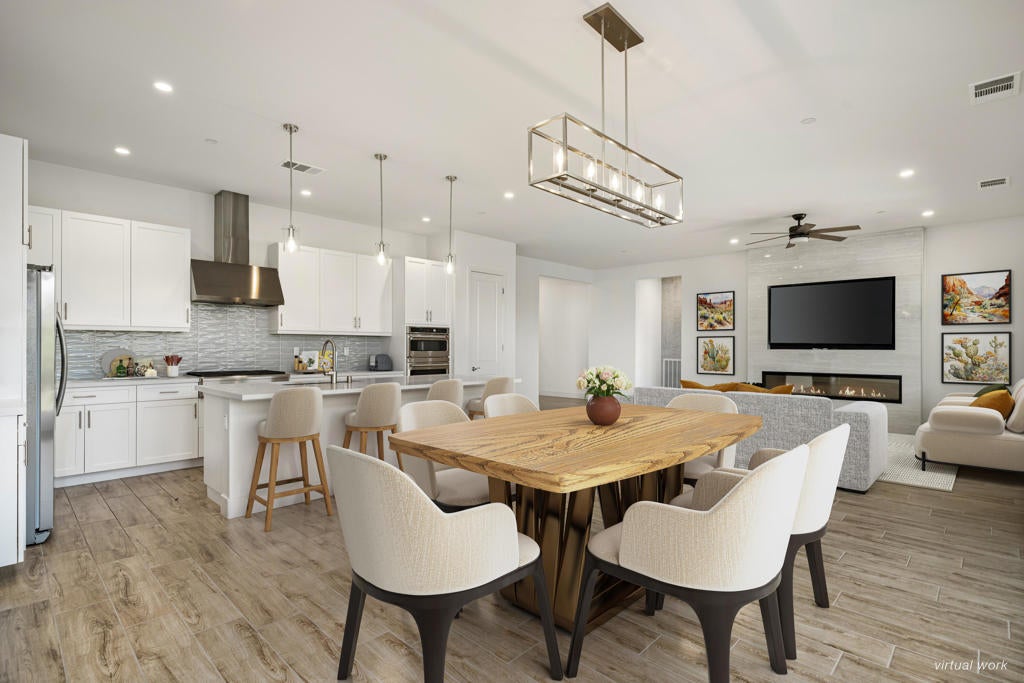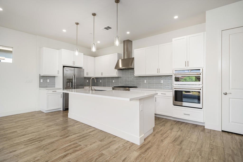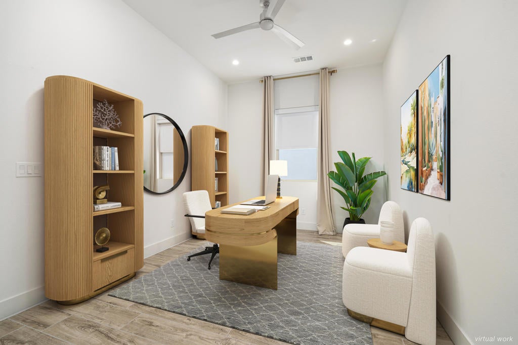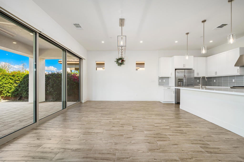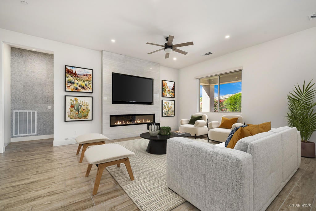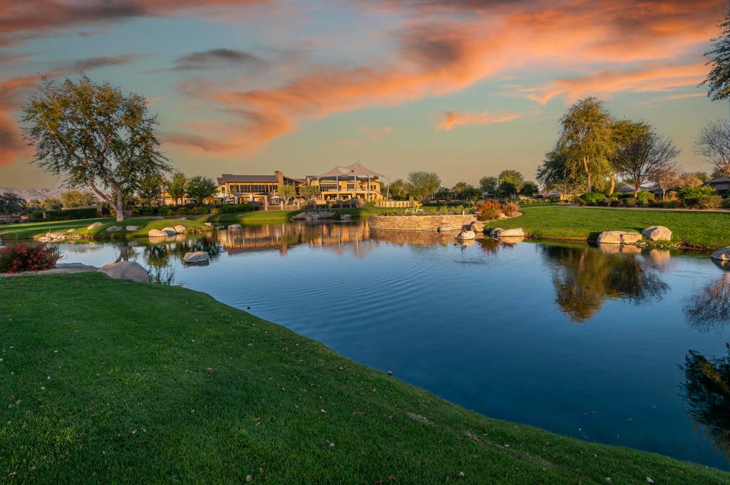 Life at the Trilogy Polo Club is among the finest in the Coachella Valley. This stunning contemporary Liberty model 2,357 square foot, 3-bedroom, 3-full baths home with office, is upgraded to the max. The quality and artful design of the home and natural beauty of the Polo Club resort makes every day living extraordinary. Once inside your greeted by 10 ft. ceilings, sparkling custom lighting, and inviting wide-plank tile floors. Off the hallway is an executive-sized room with tall custom glass doors perfect as an office, study or game room. The great room with a large linear fireplace, 70'' big screen TV against a wall of marble is a great place to relax, read, and stream your favorite shows. The windows feature custom electric shades, and a 5-ton Lennox gas heating and cooling system with UV sterilization and whole house attic air filter keep air quality and temperature perfect year-round. A wall of triple glass sliding doors provides a seamless flow between indoor and outdoor living and entertaining. The beautifully landscaped private backyard with covered patio and ceiling fan is a peaceful place to enjoy by day. By night, watch the brilliant colors of the sunset and the landscape light up against the dark night sky. The gourmet kitchen is inspiring with an abundance of custom white shaker cabinets, radiant quartz countertops against a custom glass subway tile backsplash and grand center island with pendant lighting. Upgraded professional stainless appliances include a six-burner gas cooktop and custom range hood, new refrigerator, oven, microwave, and dishwasher. The generous size and pantry make it easy to keep all your cooking appliances neatly tucked away. The spacious primary bedroom is a luxury retreat, with a built-in linear fireplace and above and opening for a 70'' TV. The sumptuous bath radiates luxury with quartz counters and a large walk-in shower with custom tiles to the ceiling. The walk-in closet is thoughtful in design with custom built-ins to accommodate even the most prolific shoppers. Two comfortable additional guest bedrooms are located away from the primary bedroom. One is an ensuite with a full bath and walk-in closet while the third guest bedroom with an adjacent full bath, could double as an office with built-in cabinets and shelves plus a closet. The laundry room is oversized with white shaker cabinets, washer, dryer and deep sink. The 2-car plus extra golf cart garage has an epoxy flooring and built-in tool chest and storage.