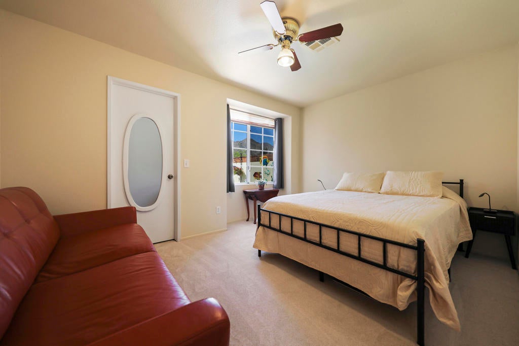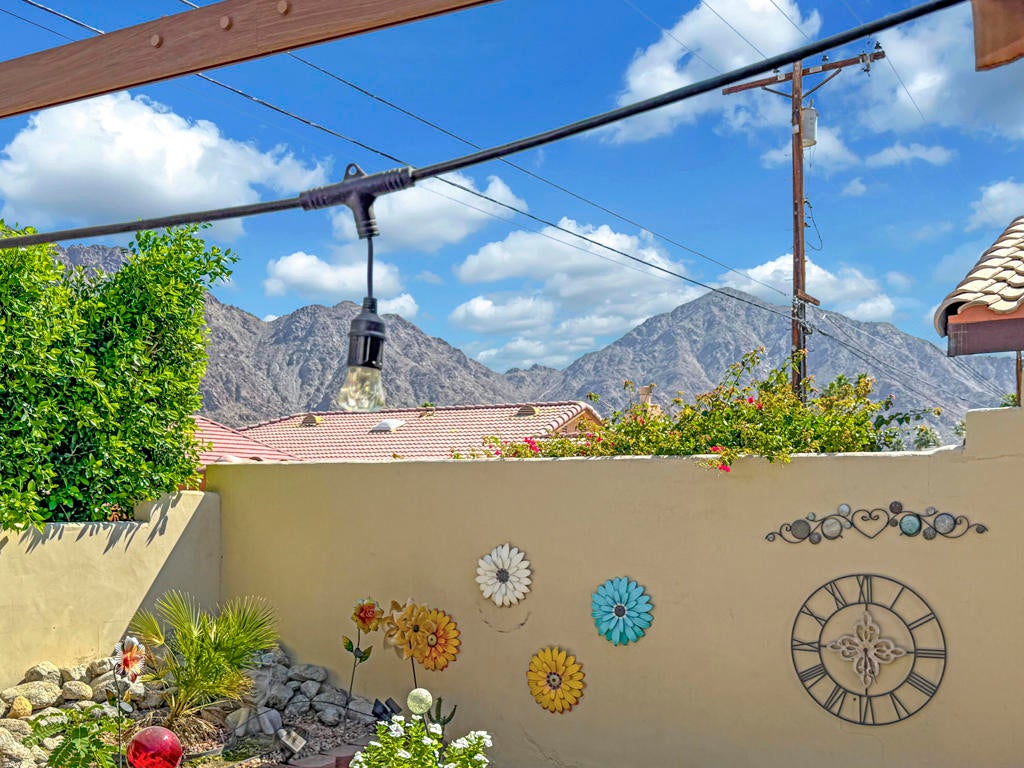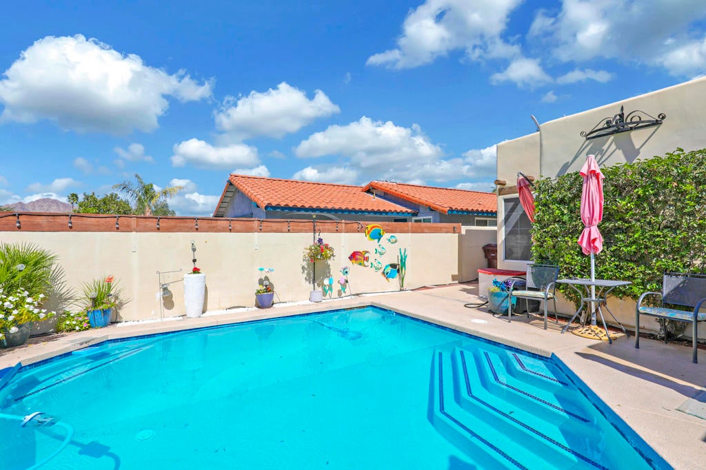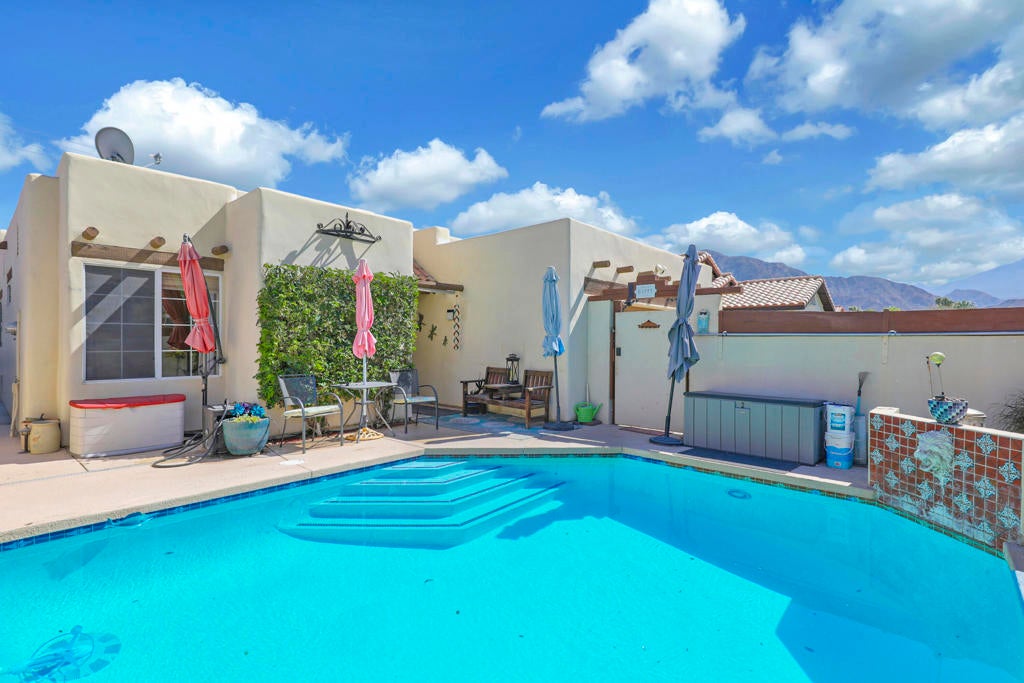 Desert charm meets an unbeatable location in this Santa Fe-inspired home walking distance to the heart of Old Town La Quinta. Featuring original Saltillo tile floors, a front courtyard pool with a water feature, and incredible western sunset views. Ideally positioned just across from Fritz Burns Park, currently undergoing a major renovation and expansion, this home sits in an already desirable neighborhood that continues to grow in appeal. Inside, the residence showcases authentic Southwestern character with original Saltillo tile flooring, uniquely detailed with real coyote footprints--a distinctive feature that reflects the home's heritage and craftsmanship. The inviting living room features high ceilings and a cozy fireplace, creating a warm and welcoming space to gather. The updated primary bathroom offers a beautifully tiled walk-in shower, creating a comfortable and refreshing retreat. The guest bathroom has hand-painted Mexican tile and a decorative sink that adds color, artistry, and personality. Home is also connected to natural gas for everyday convenience and efficiency. Outdoor living is a true highlight. The front courtyard features a private pool with a tranquil water feature and stunning western mountain views--perfect for relaxing or enjoying La Quinta's famous desert sunsets. In the backyard, a covered patio and additional flexible space ideal for entertaining, lounging, or enjoying the indoor-outdoor living the desert is known for. This unique home blends classic Santa Fe charm with a prime location close to parks, dining, shopping, farmers markets, art shows, and the popular Bear Creek Oasis Trail.