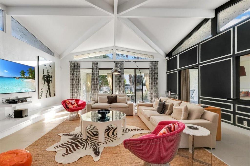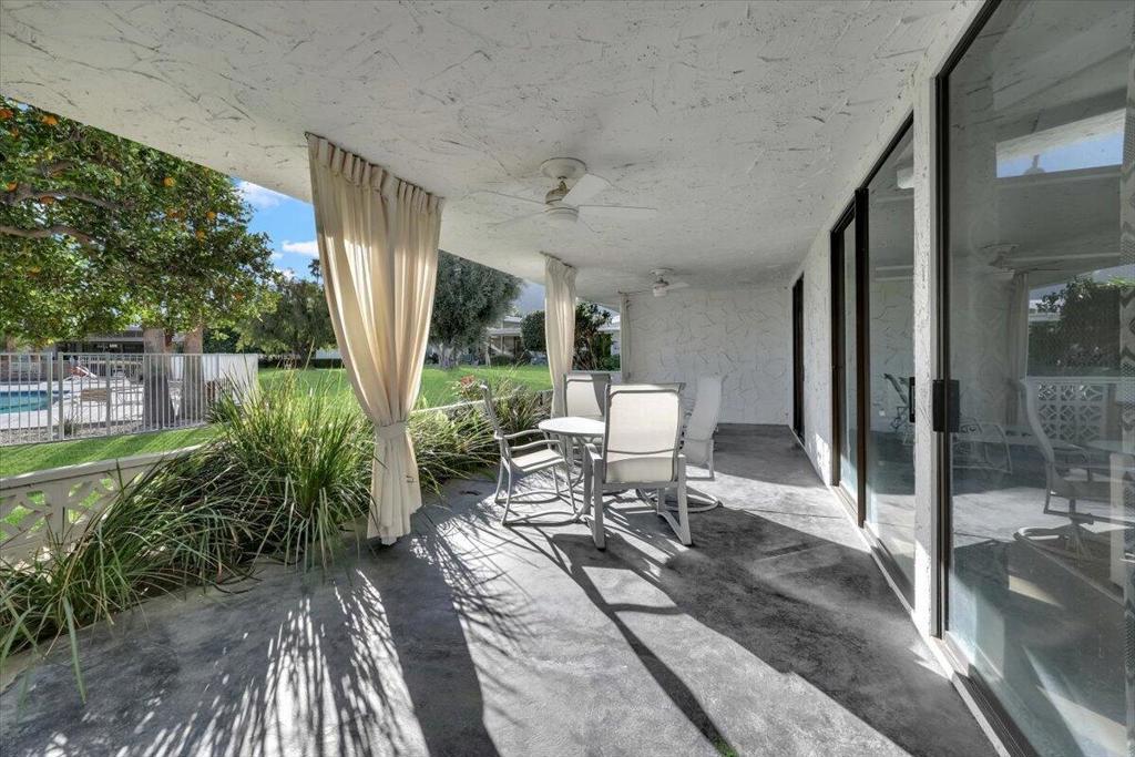 Canyon Estates is renowned internationally for its iconic Charles Du Bois Mid-Century Modern architecture, lush resort grounds and coveted lifestyle in Palm Springs. Enjoy all of this plus an ideal mix of upgrades and original features behind the private, gated entry at this fabulous single-level home, which spans approximately 1,998 square feet and shares only one wall with its neighbor. Double doors open to a formal entry and this floorplan's coveted living room. With its vaulted umbrella-style ceiling, clerestory windows, and two sets of sliding glass doors opening to a large covered patio, all RSVPs will be marked yes when you entertain in this incredible space. The living room flows directly to the dining room, where built-in seating and patio access embellish mealtime, parties and latenight snacking. Illuminated by a skylight, the kitchen reveals a pass-thru to the living room, ample cabinetry including a pantry, polished black countertops, a wet bar, and upgraded stainless steel appliances including a five-burner cooktop. The kitchen is joined by the dining room on one end and a laundry room and attached two-car garage on the other. Two bedrooms and two- and one-half baths make this home an ideal year-round residence or a lux vacation getaway. Both full baths shine with quartz countertops, frameless gloss-black cabinetry, frameless full-wall mirrors, and rain showers with custom tile surrounds. In the spacious primary suite, owners will appreciate direct patio access, a sit-down vanity and a separate soaking tub. Contemporary lighting, designer wallpaper, and an upscale blend of tile, carpet and plank flooring lend an enviable aesthetic. Homeowners enjoy country club-style living at Canyon Estates, where a MCM clubhouse anchored by a massive stone fireplace offers lake and mountain views, event space, a library, fully appointed fitness center and game room. Golf, tennis and pickleball are featured, and the community is convenient to shopping centers, restaurants, museums, nightclubs, hiking trails and Palm Springs International Airport.