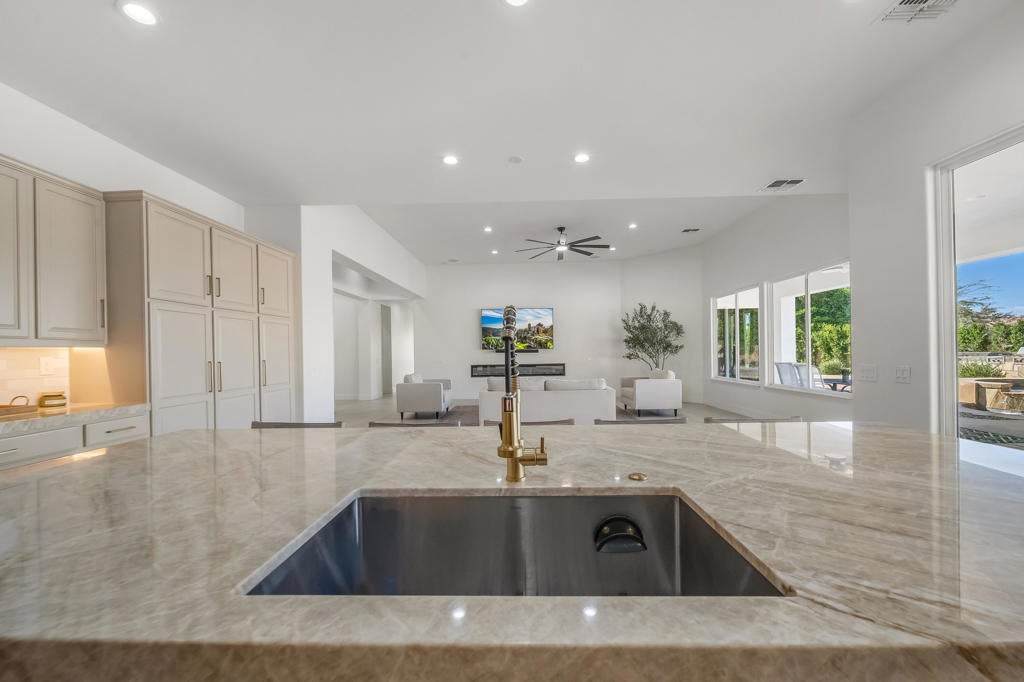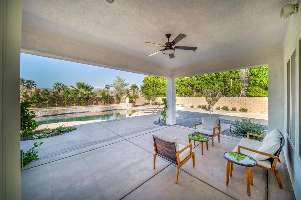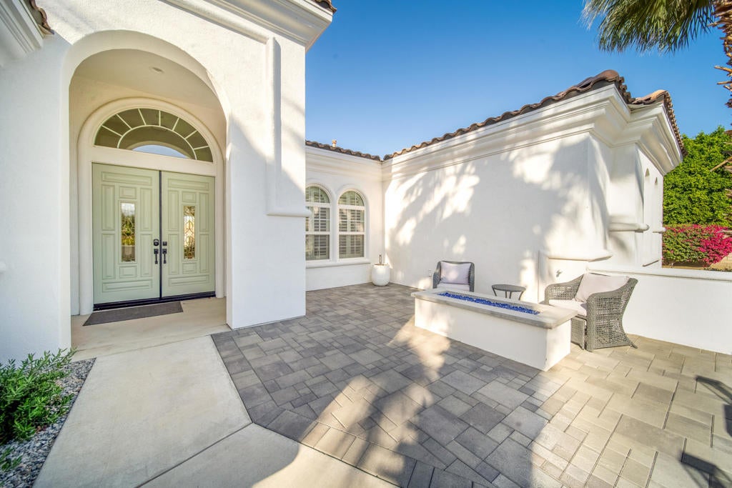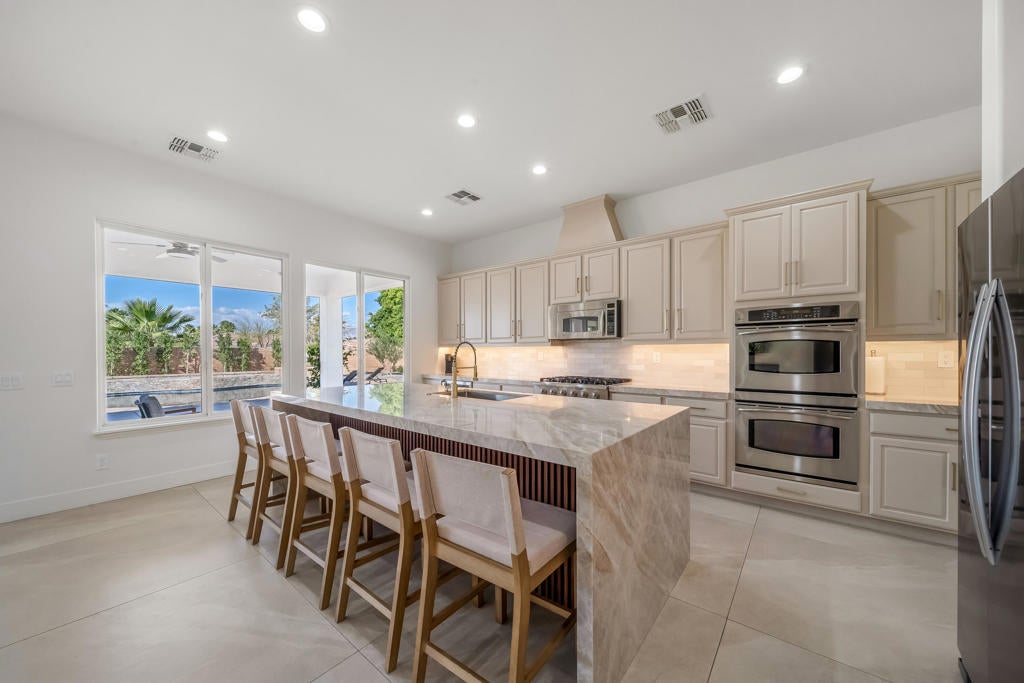 Beautifully updated and move-in ready, this Desert River Estates home showcases over $250,000 in upgrades, offering refreshed living spaces and thoughtful improvements that create a warm and inviting atmosphere. The upgraded kitchen serves as the heart of the home, featuring a stunning Taj Mahal quartzite island, painted cabinetry with updated hardware, and plenty of space for cooking, gathering, and entertaining. The open floor plan flows seamlessly into the main living areas, perfect for both everyday living and hosting family and friends. The home also features interior and exterior audio, enhancing the living and entertaining experience. This spacious home offers 4 bedrooms plus an office/den and 3.5 bathrooms. The large primary suite includes a beautifully appointed bathroom and his-and-hers walk-in closets, combining comfort and functionality. Step outside to a beautifully designed backyard ideal for entertaining, featuring extensive pavers throughout the front and backyard, gas fire pits in both outdoor spaces, and a built-in BBQ station with a stainless grill. Additional highlights include RV parking, an extended driveway, and a 3-car garage with new doors and motors, providing ample space for vehicles, toys, and storage. Recent upgrades include tile and flooring upgrades throughout the home, new baseboards and door trim, fresh interior and exterior paint, remodeled bathrooms, a Taj Mahal quartzite kitchen island, painted cabinetry with updated hardware, new garage doors and motors, and newly landscaped front and backyard. Located in the desirable Desert River Estates, this home is close to shopping, dining, and local amenities, and is within walking distance to the world-famous Coachella Festival grounds. This exceptional property offers luxury, comfort, and the ultimate desert lifestyle.