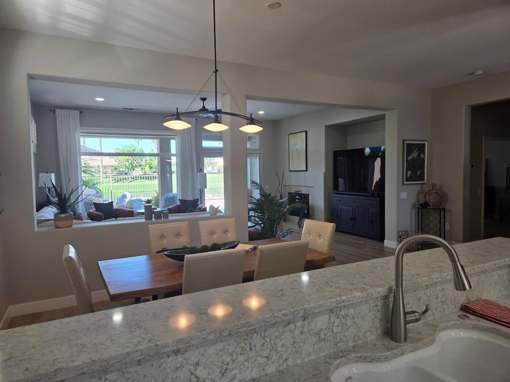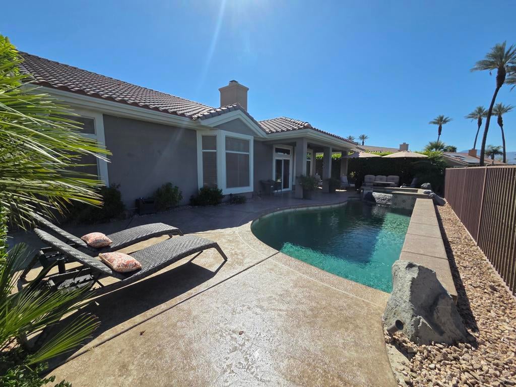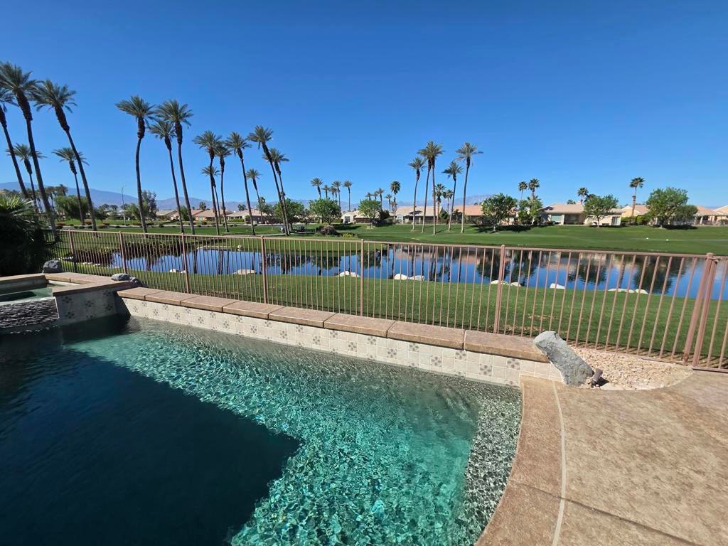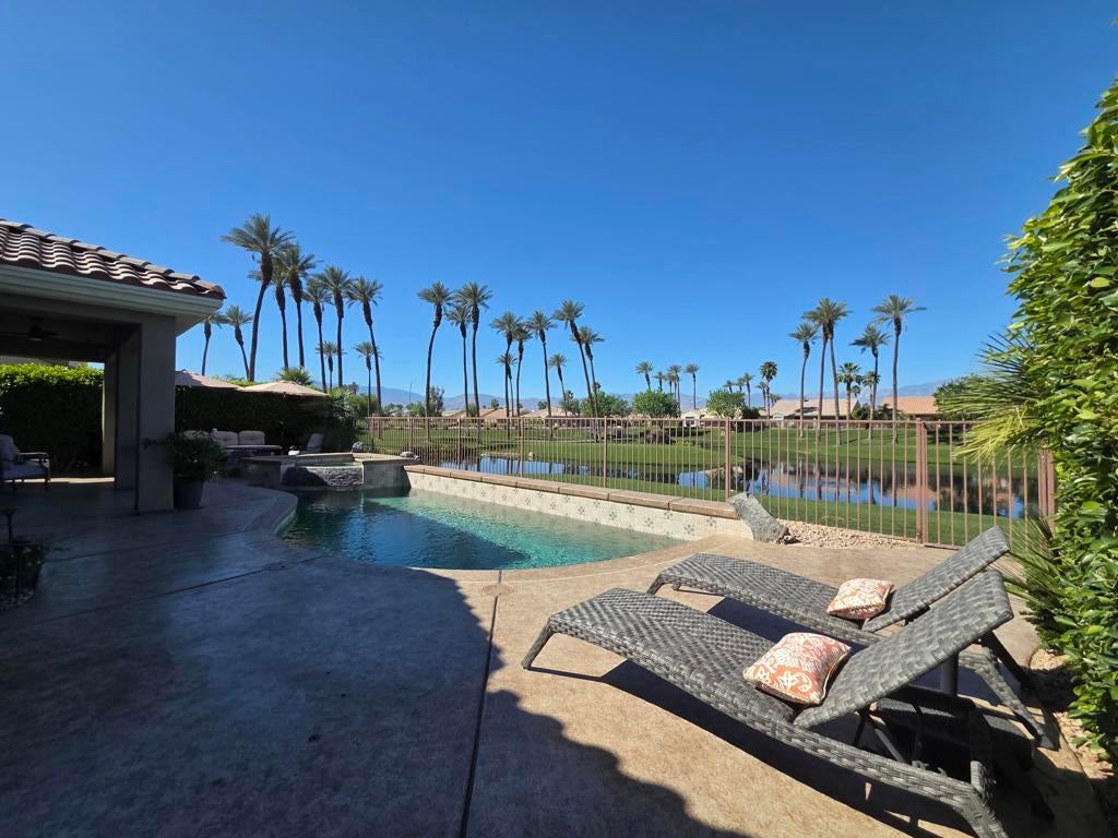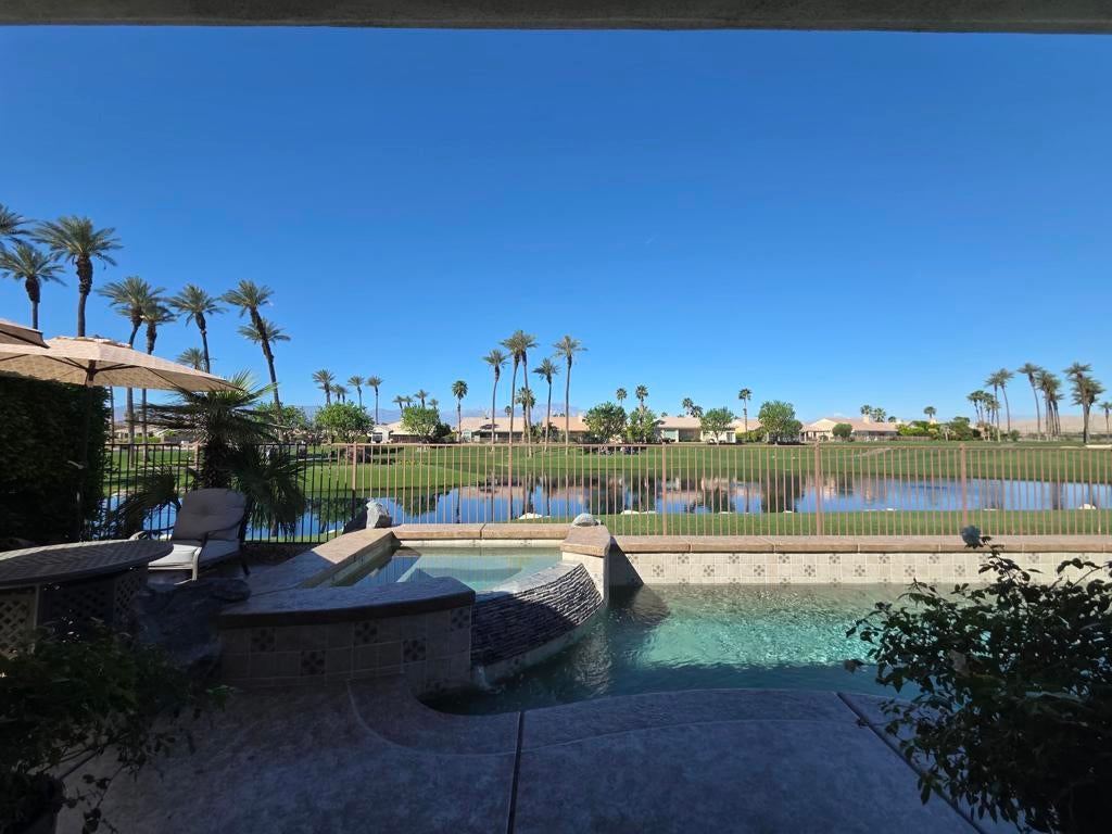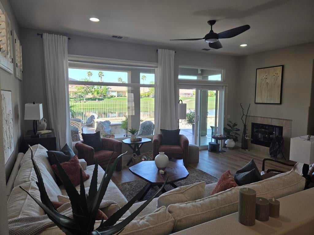 SNEAK PEEK BEFORE PROFESSIONAL PICTURES. CHECK BACK FOR COMPLETE PHOTOS. Located in the best 55+ community in the valley, Sun City Palm Desert, This rare Sonora floor plan has been highly upgraded and is one of the favorite models. This home has TWO NEWER A/C'S and a mini-split in the garage. As you approach, you will be in awe of the superb curb appeal. The home was recently painted in soft desert palette, which is the backdrop to the new concrete overlay, easy maintenance landscaping and turf grass. The backyard sits above a large lake, which surrounds the 10th tee of the San Gorgonio Golf Course, and is framed by a magnificent snow capped mountain range. The sunsets are to LIVE FOR and will keep you entertained forever. The gated courtyard and stunning leaded glass entry door are lovely and inviting. Inside it has Plantation Shutters, and light wood-like waterproof luxury vinyl flooring throughout. The Sonora is an open concept, with the large, fabulous kitchen, open to the dining room, living room, and the awesome view of the golf course, and the Santa Rosa mountains. There is a cozy fireplace for those cool winter evenings. The kitchen has new quartz counters, stainless appliances, a breakfast nook, an island, an eating bar, can lights, and new cabinet hardware. The dining room and living room are adjacent to the kitchen with a view to the pool/spa, and golf course. The primary bedroom has a bay window, and a breathtaking view as well. The bathroom has a dual vanity, walk-in shower, soaking tub, walk-in closet and a private toilet room. The guest wing has 2 bedrooms that are adjacent to the 2nd full bathroom, which has been beautifully remodeled. The laundry has new upper cabinets and the washer and dryer are included. The 2-car garage has a new epoxy floor coating, new paint, and is clean as a whistle. The new concrete overlay continues around the whole house and pool for that pristine, clean look and feel. This home is meticulously maintained, and most of the furnishings are available. So, it's ready for you to move in and enjoy the good life.