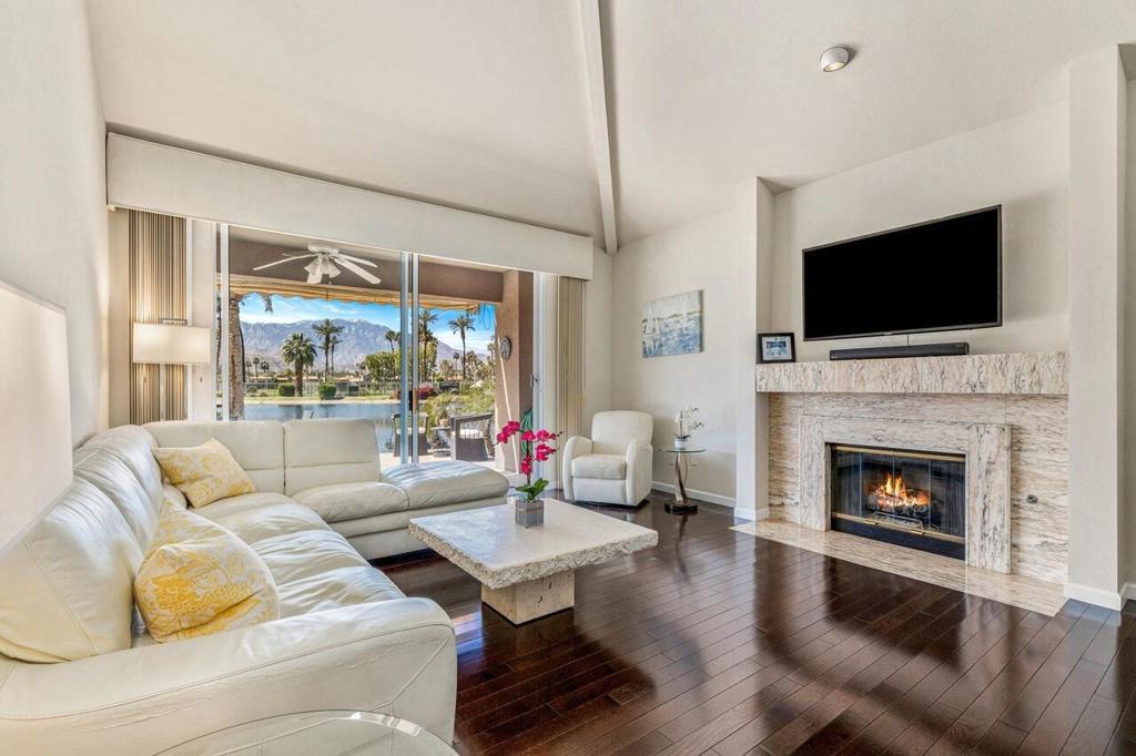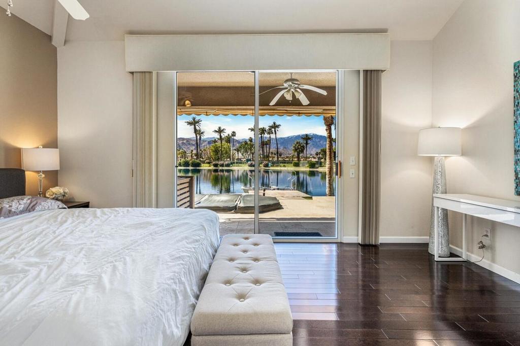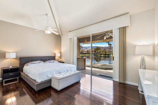 Now for lease -- Season Rate $8,750 Oct-May. June- Sept $5,550. Arguably the best view in Lake Mirage. This lakefront condo offers stunning 180-degree unobstructed south and west mountain views with no condos across the lake, creating a truly open and private setting.This desirable single-level end unit features approximately 1,888 sq ft with an excellent floor plan. The spacious primary suite is separated from the guest bedrooms for privacy, and all three bedrooms include their own en-suite bathrooms. The living room offers a fireplace and wet bar, while the home also includes newer appliances, newer A/C, no carpet, and is offered fully furnished.Enjoy outdoor living on the expanded lakefront tiled patio with automatic awning and misters--perfect for relaxing while taking in the mountain and water views. Additional highlights include direct access from the attached two-car garage and abundant guest parking nearby.Residents of Lake Mirage enjoy resort-style amenities including two scenic lakes, 11 pools and spas, 9 tennis courts, pickleball courts, a 3-hole pitch-and-putt golf course, and a clubhouse with fitness center and recreation facilities.Ideally located near Eisenhower Health, shopping and dining along El Paseo Shopping District, and entertainment at McCallum Theatre. A rare opportunity to lease a premier lakefront home with exceptional views.