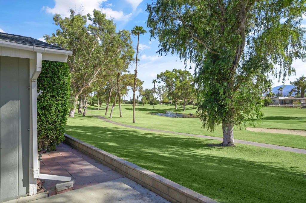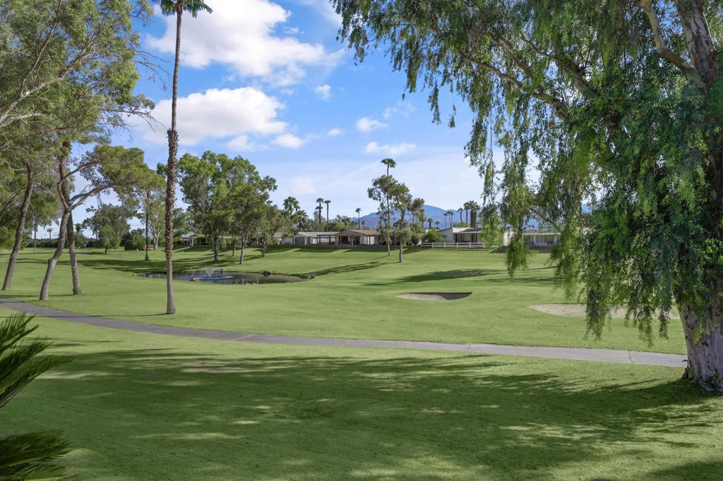 Nestled in the heart of Ivey Ranch, this beautifully situated home offers a peaceful blend of comfort, scenic beauty, and resort-style living. Overlooking the lush golf course, the home is perfectly positioned to capture breathtaking mountain views and tranquil fairway scenery right from your backyard. The open-concept floor plan creates a light and inviting atmosphere, with expansive windows and two sliding glass doors that fill the home with natural sunlight while seamlessly connecting the indoor living spaces to the outdoors. The kitchen features crisp white countertops, warm wood cabinetry, and opens directly to the cozy living room where a fireplace creates the perfect place to relax and unwind. The spacious primary suite serves as a serene retreat, complete with large windows that frame beautiful outdoor views and mirrored closet doors that add a touch of elegance. The primary bathroom offers dual vanities, a separate soaking tub and shower, and charming details that create a spa-like ambiance. Step outside to your private patio where you can enjoy peaceful mornings or relaxing evenings overlooking the golf course, tranquil lake, and gently flowing fountain -- an ideal setting for quiet reflection or entertaining guests. The home also includes a two-car plus golf cart garage for added convenience. Located within the gated 55+ community of Jack Ivey Ranch Country Club, residents enjoy an active desert lifestyle surrounded by natural beauty. Community amenities include a public 9-hole senior golf course rated for 18 holes by the SCGA, four pools including an Olympic-sized pool, relaxing spas, fitness center, and tennis/pickleball courts. Experience the relaxed elegance and welcoming community of Ivey Ranch -- where desert living meets comfort and convenience.