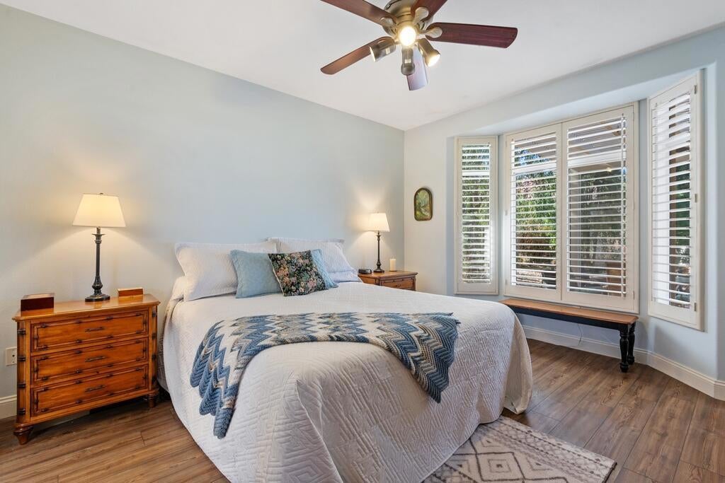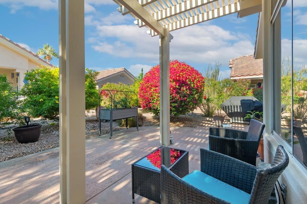 BEST PRICE IN Sun City. SPECTACULAR Christofle floorplan home in Sun City Palm Desert--move-in ready and ideally located just moments from both the Mountain View and Sunset View clubhouses! True OUTDOOR OASIS with spacious salt-finished patio surrounded by mature, low-maintenance desert landscaping. An extended Alumawood patio cover with built-in ceiling fan expands your outdoor enjoyment, offering filtered sunshine and year-round comfort. This LIGHT-FILLED residence offers abundant natural light throughout, including transom windows, and an inviting living room with media niche and French door opening to the peaceful backyard. The kitchen features Corian countertops, pantry, a convenient pass-through to the living room, and a sliding door to the outdoor living spaces. The primary suite features a CHARMING bay window, ensuite bath, and walk-in closet. The primary bathroom includes dual sinks and shower/tub combination. Thoughtful separation places the guest bedroom on the opposite side of the home, ensuring COMFORT & PRIVACY for both owners and visitors. Additional upgrades include plantation shutters on all windows, LVP flooring throughout, and new ceiling fans in every room. The former laundry room has been converted into a versatile service area, with washer and dryer relocated to the garage--offering added interior storage potential. New AC in May 2024. The two-car garage includes built-in cabinetry for extra organization. Whether seeking a carefree lock-and-go seasonal retreat or a comfortable full-time residence, this home is designed for ease of living. Sun City Palm Desert is all about lifestyle! Enjoy remarkably low HOA dues and an incredible array of amenities, including two championship 18-hole golf courses, driving range and practice facilities, pickleball, tennis, softball, bocce ball, and an 18-hole putting green. Additional highlights include 3 newly renovated clubhouses, an honor library, arts and crafts studios, ballroom, and four pools heated to 87 year-round with spas. Dine at two on-site restaurants, a martini/coffee bar, or the newly renovated indoor/outdoor bar with fire tables--perfect for taking in the views and enjoying the best of desert evenings. Sun City life is vibrant, active, and rich with opportunity--truly one of the valley's most desirable 55+ communities.