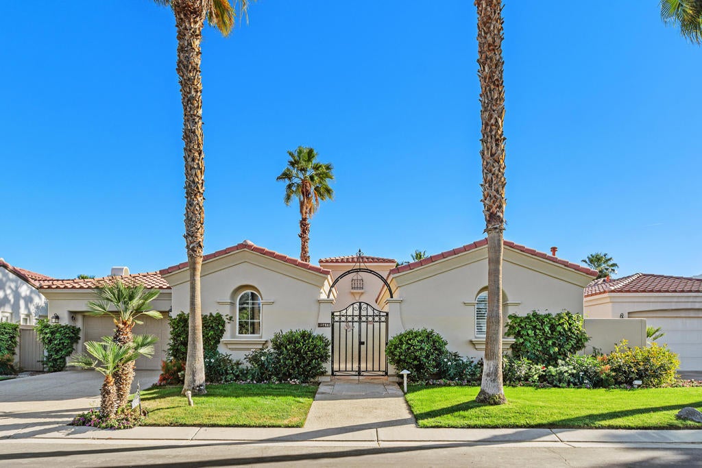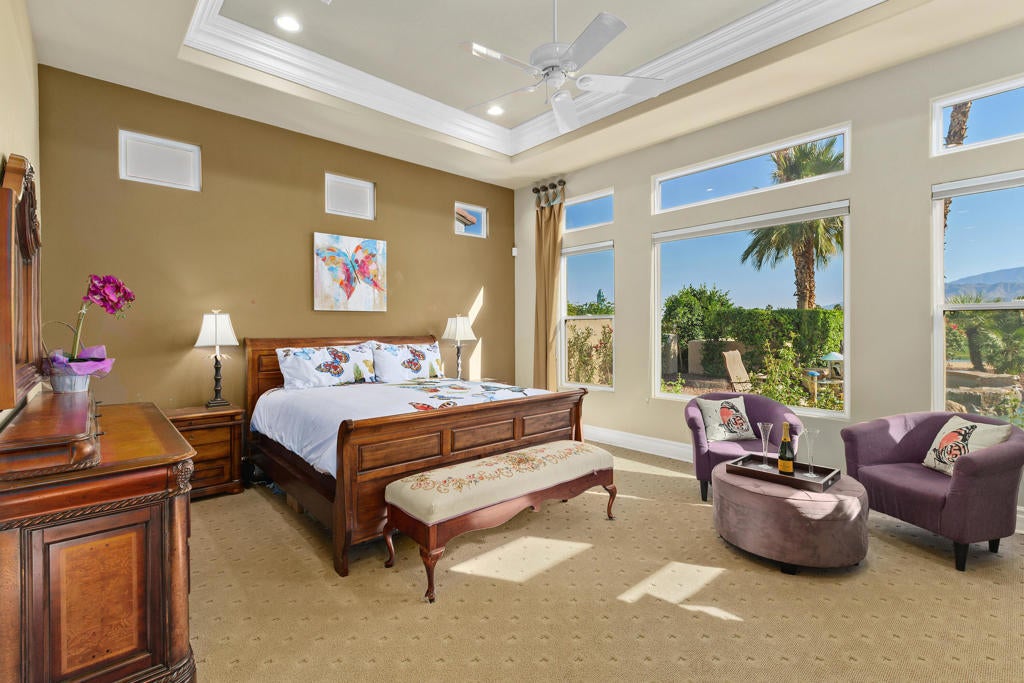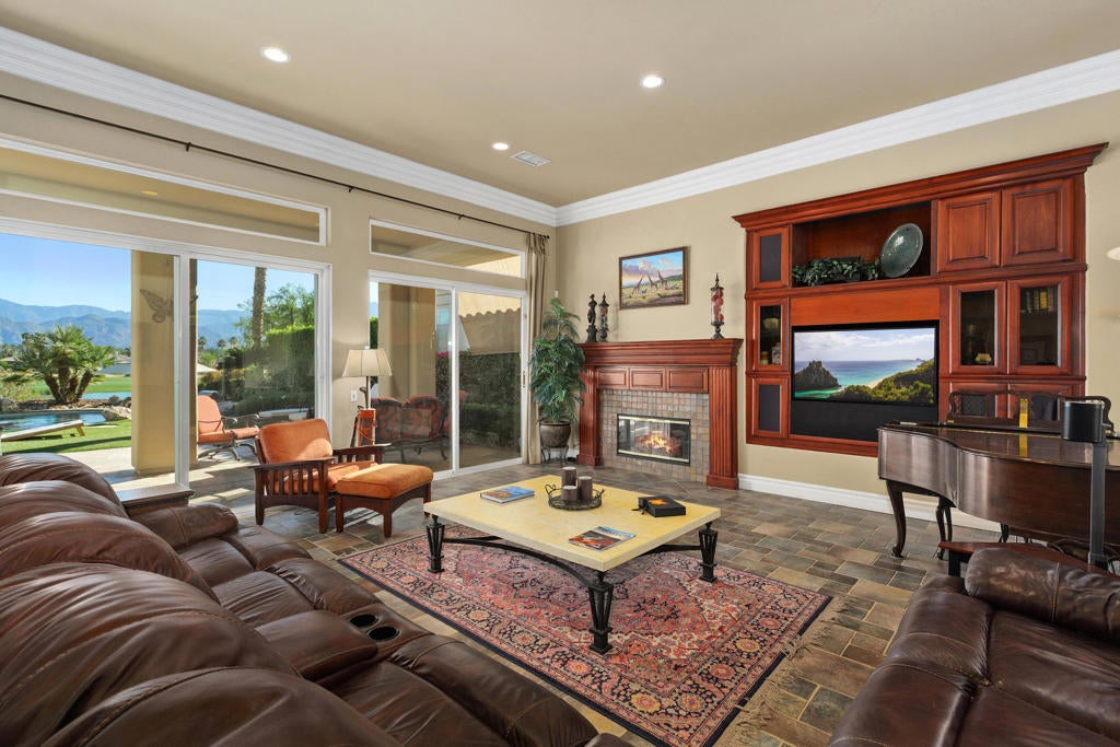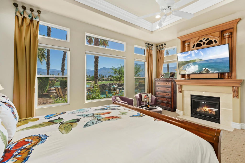 STUNNING VIEWS! Prime property on the Greg Norman golf course at PGA West. These gorgeous views of the mountain, lake and double fairways will take your breath away.This home, a former model, boasts almost 3600 sq. ft. of living space, including 3 bedrooms and 3 1/2 bathrooms. Beautiful crown molding adorns every room. The casita is detached for your guest's comfort. Situated on an 11,000 lot with pool, spa, waterfalls and swim up bar, the backyard entertaining is second to none. The step down built-in barbecue space adjoins the pool. The low maintenance yard with artificial turf and automatic sprinklers and drip system allows for ease and relaxation. The kitchen features two islands, two dishwashers, double oven and warming drawer for entertaining a crowd or simply the family. The nearby step down bar includes a wine refrigerator. The primary retreat includes a wall of windows to take in the mountain and backyard views while enjoying a cup of coffee from your private coffee bar. A bedroom fireplace enhances the ambiance of the evening or takes the chill off in the morning. The primary bathroom suite includes dual vanities plus a makeup table for her. Separate walk-in closets and a luxurious tub complete this spa-like area. The second bedroom with bathroom are on the opposite side of the house for privacy. The casita is beautifully appointed with microwave, and coffee bar. It has a new AC unit/heat pump as well as water heater. The garage has custom cabinetry, epoxy floors, AC, and a tesla charging outlet. Nothing has been spared in this near perfect home. HOAs include internet, cable, garbage, security & front yard maintenance.