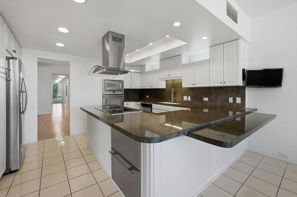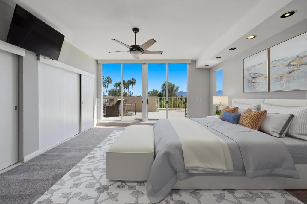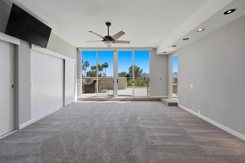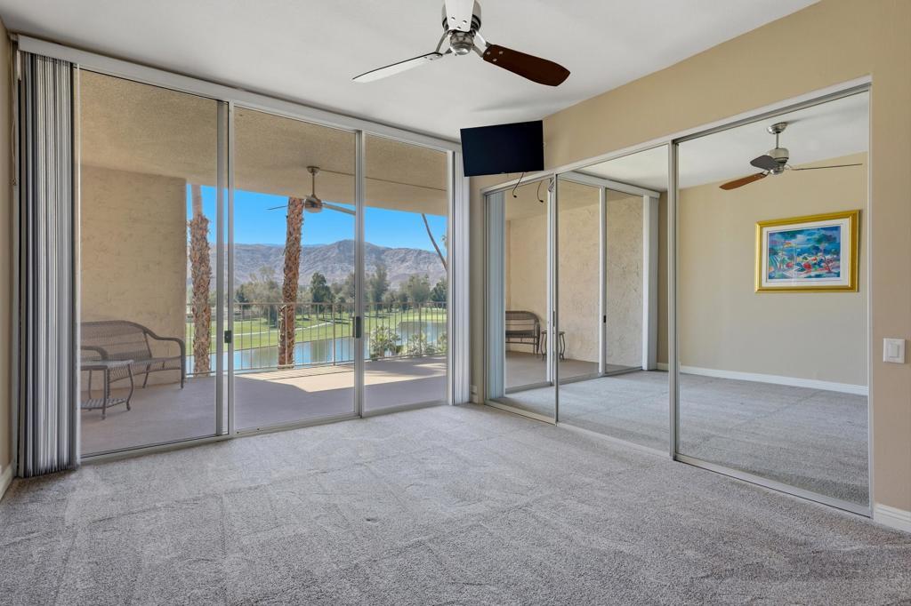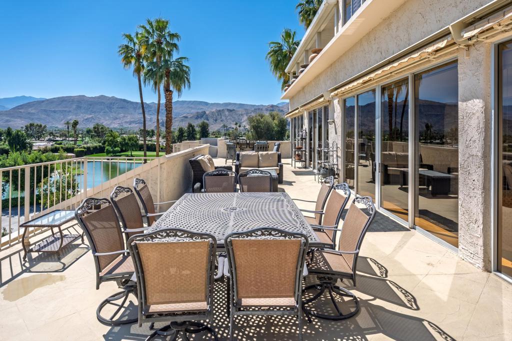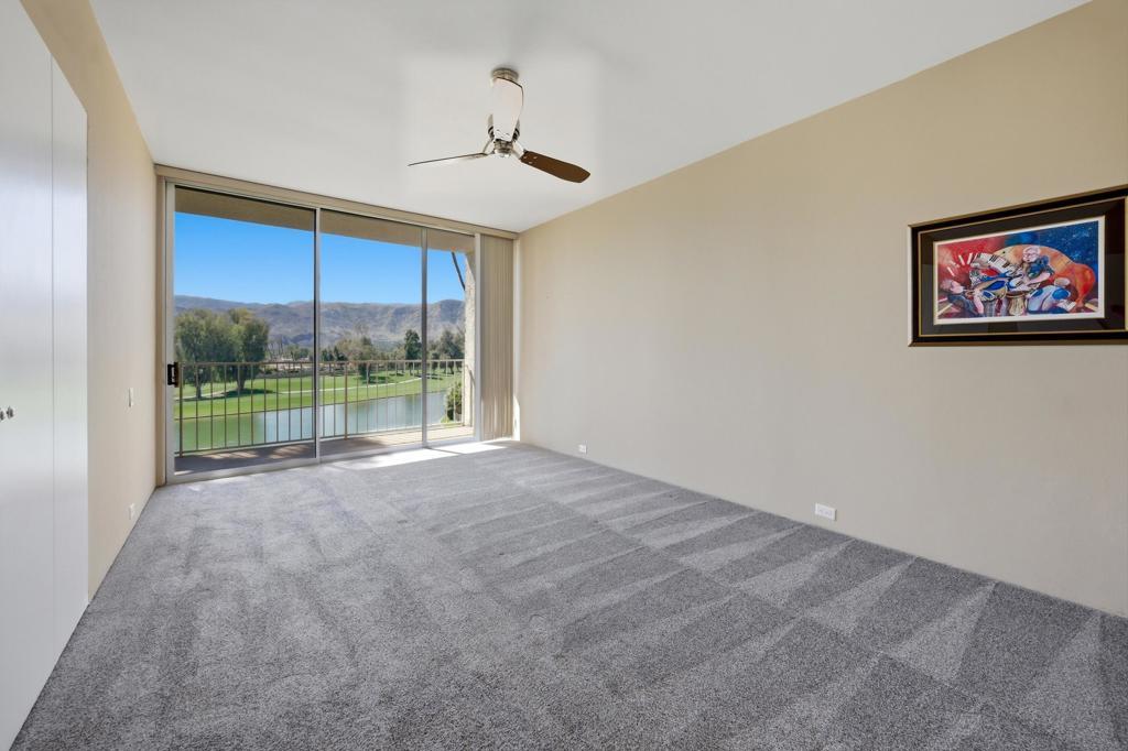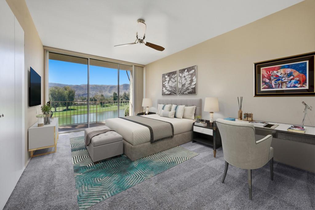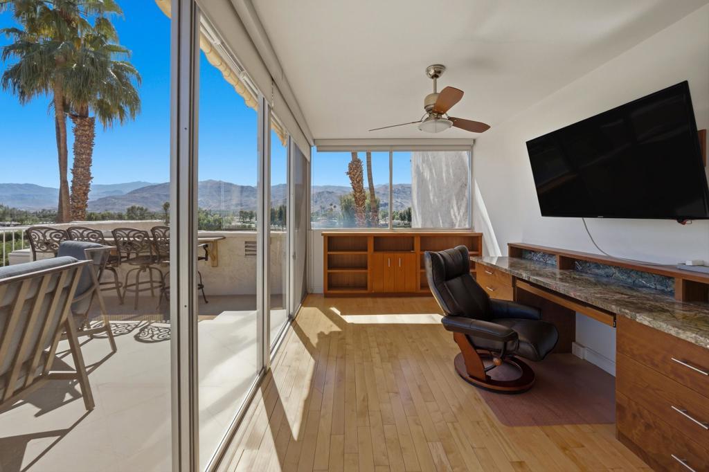 Vacation at home in this three-bedroom, three-bathroom condo in the sought-after Desert Island community. As an end-unit, it offers three balconies and several living areas, including a flexible study or office space for art, crafts, or working from home. Large windows fill the rooms with natural light. The open layout connects smoothly to the living area, making it a great spot for gatherings. Floor-to-ceiling sliding glass doors lead to a balcony that stretches the length of the condo, ideal for indoor-outdoor entertaining. Desert Island is a high-rise community set around a peaceful lake, with an 18-hole golf course close by. On-site, you'll find a management office and helpful HOA services that make daily life easier. Amenities include tennis and pickleball courts, pedal boats, catch-and-release fishing, a gym, and a pet-friendly atmosphere. This is resort-style living, where every day feels like a getaway. The location at Frank Sinatra Drive and Bob Hope Drive puts you close to shopping, dining, theaters, galleries, casinos, and Eisenhower Medical Center. The HOA takes care of water, trash, gas, cable TV, and Wi-Fi, so you can enjoy low-maintenance living while all common areas and landscaping are managed for you. Book your tour today, to view this property.