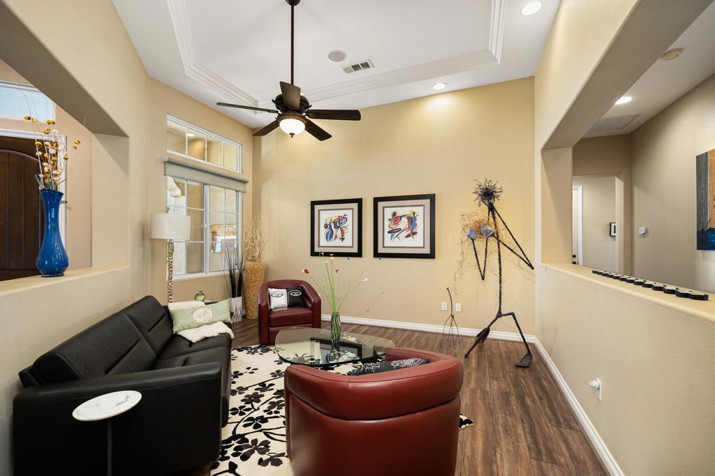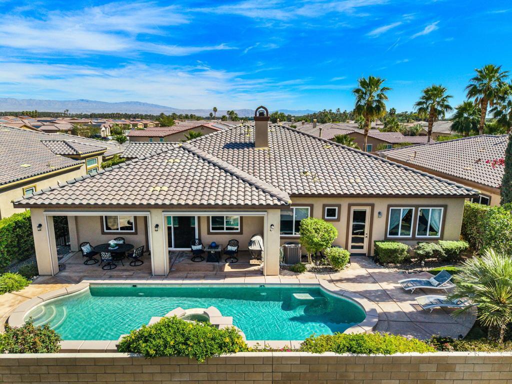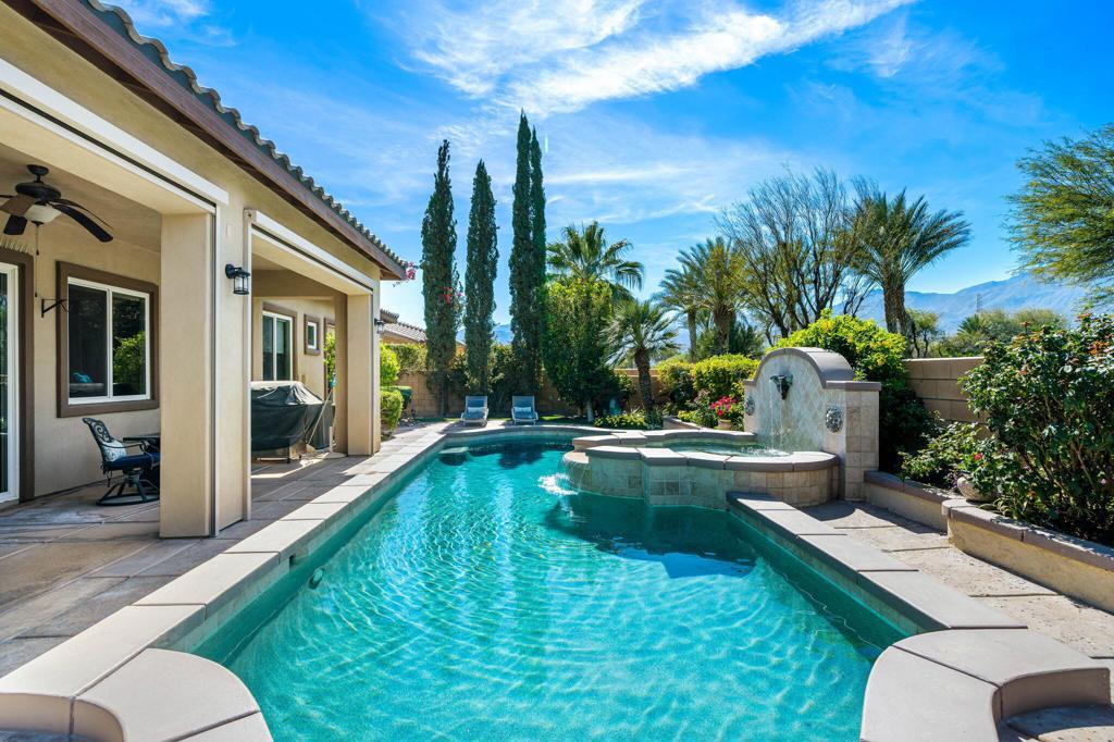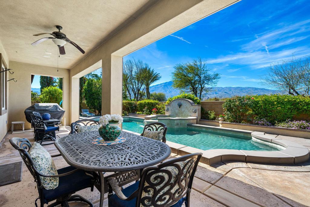 Commanding unobstructed western mountain views and overlooking the lush fairways of The Palms Golf Course, this beautifully designed residence captures the essence of desert luxury living.The private rear yard is a serene retreat, featuring a sparkling pool and spa accented by a graceful fountain feature--an ideal setting for sunset gatherings and tranquil evenings under the desert sky. The salt water pool/spa have been recently drained, cleaned with new tiles at surround and refreshed Heater and pumps. A beautifully detailed entry door welcomes you into a dramatic foyer with soaring 12-foot ceilings and custom tile flooring, immediately establishing the home's refined character. Throughout the residence, luxury details are evident and include generous crown molding, kitchen backsplash with custom tiling The gourmet kitchen is both elegant and functional, offering granite countertops, abundant and upgraded cabinetry with soft-close drawers, an oversized eat-at bar, and a convenient built-in desk area. The kitchen flows seamlessly into the expansive great room, where custom built-ins and a fireplace create a warm and inviting gathering space.A formal dining room provides an elegant setting for entertaining, while the adjacent oversized bonus room offers flexible use as a den or office.Guest accommodations are thoughtfully designed with two en-suite bedrooms connected by a Jack-and-Jill bath, ensuring privacy and comfort for visitors.The primary suite is a luxurious sanctuary with direct access to the patio, a generous walk-in closet, and a versatile recessed space perfect for a fitness area, office,or sitting room. The spa-inspired primary bath features a large walk-in shower, dual vanities, a seated vanity area, and a relaxing jetted soaking tub.Additional features include surround sound throughout most rooms, central vacuum, a well-appointed laundry room with storage, and electric sun shades on the rear patio.The extended garage provides abundant storage and space for a golf cart or recreational vehicle.This tandem space can easily be turned into a 4th bedroom, especially with easy access to hall bath. Designed with effortless indoor-outdoor living in mind, the open kitchen, great room, and outdoor spaces combine to create a home that is equally suited for grand entertaining or quiet desert relaxation.