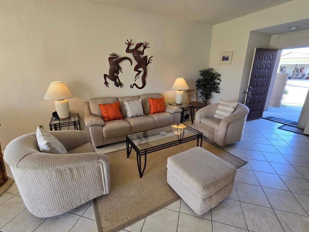 New to the market! This corner unit authentic 2-bedroom, 2-bathroom at Desert Princess Country Club offers an open floor plan, creating a spacious and comfortable, light flooded living environment with stunning views.The well-equipped kitchen with an abundance of cabinetry and updated appliances. The generously sized primary suite features a private slider leading to the covered patio that spans the width of the condo. Enjoy ample closet space and a luxurious ensuite bathroom complete with a walk-in shower. The second bedroom is also generously sized, with a walk-in closet and convenient access to the second bathroom. A laundry is handily located close by the bedrooms. Central loaction in the club - peaceful and quiet. Designed by renowned architect Gin Wong, known for iconic landmarks like the LAX Theme Building, CBS Television City, and the 76 Gas Station in Beverly Hills, these condos showcase exceptional design with high ceilings, a seamless flow, abundant closet space, and a front patio that doubles as a convenient golf cart corral.A one-car garage is conveniently located adjacent to the unit, while a sparkling and quiet jacuzzi & pool with lovely views is just steps from your patio. Enjoy the peace of mind that comes with a comprehensive monthly HOA fee covering a wide range of valuable amenities. Embrace the exclusive resort lifestyle at DPCC, a full-service club offering year-round access to a State-of-the-art fitness center, sports courts and spa. Scenic walking trails and clubhouse.
