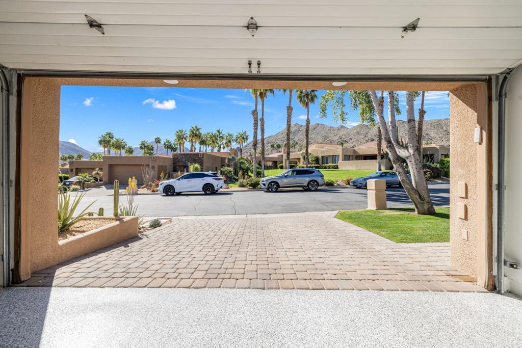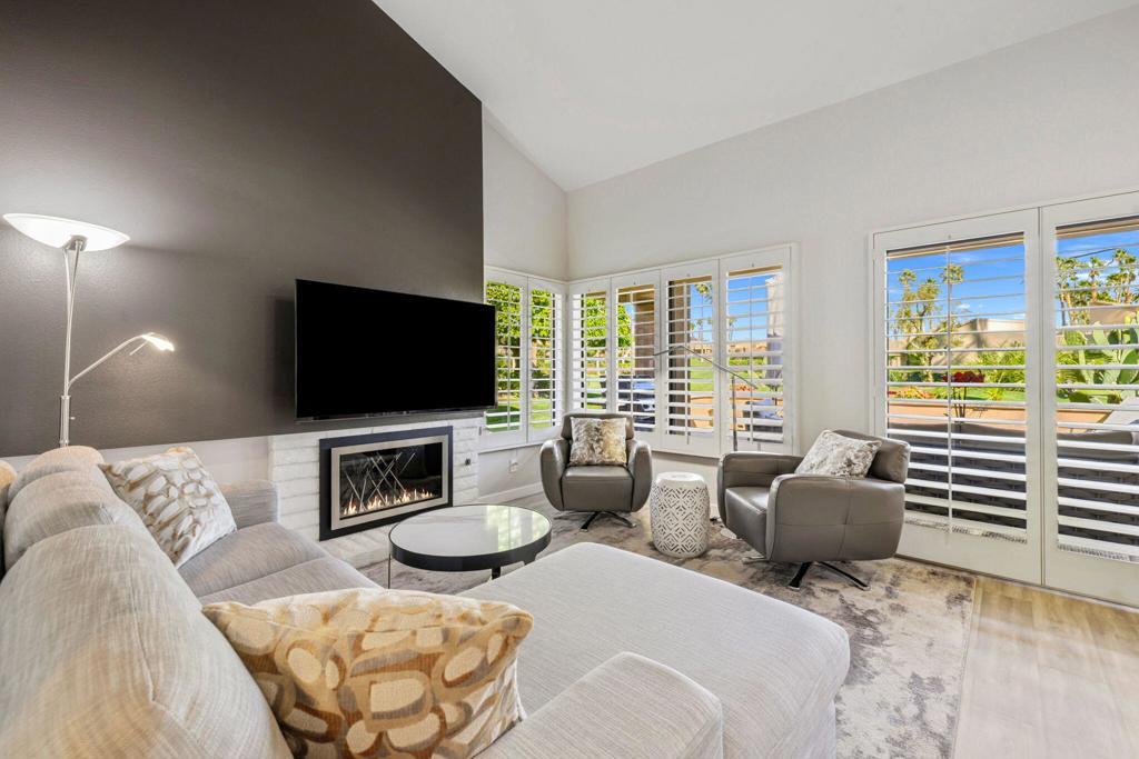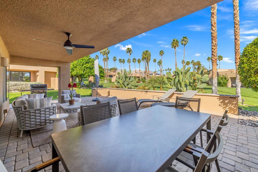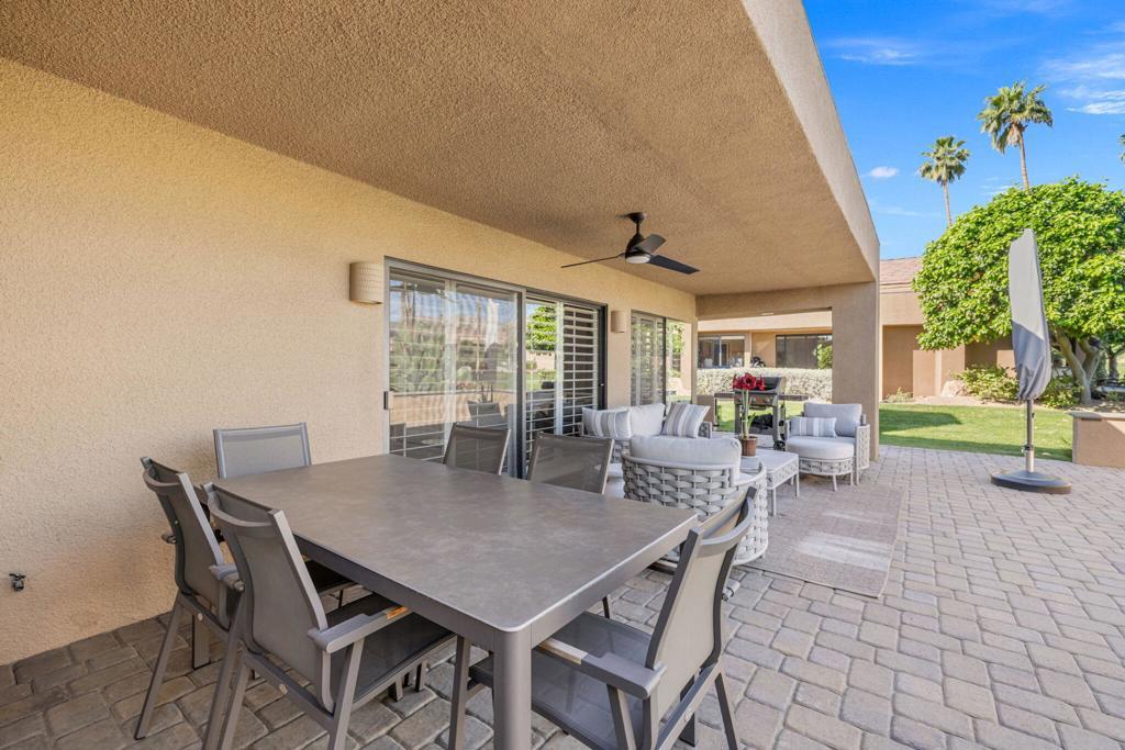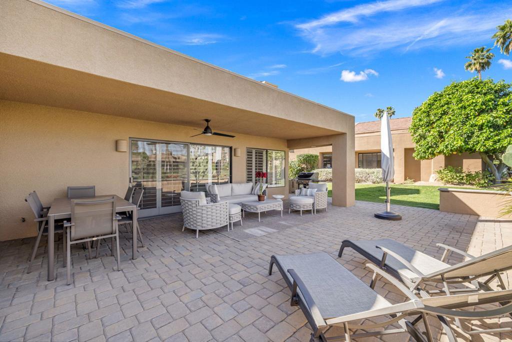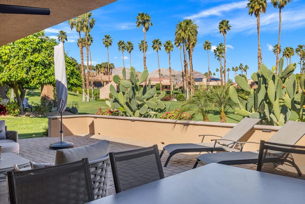 Enjoy views of sunset and mountains from this expanded wrap-around patio area. Located on a lush greenbelt near pool/spa.2-bedrooms 2-baths with fireplace and double attached garage. Updated modern kitchen with stone countertops, induction stovetop & custom cabinetry. Laminated wood flooring. Baths are remodeled with walk-in tile showers. New interior doors and trim. Guest bedroom closet has been partially converted to office space. Garage is customized with epoxy floor, newer washer/dryer and added sink. HVAC system and water heater are recently replaced. Pavers installed on driveway, walkway and patio areas. Beautiful villa in a serene setting offered Furnished per inventory. This HOA has 7-day minimum rental restriction.