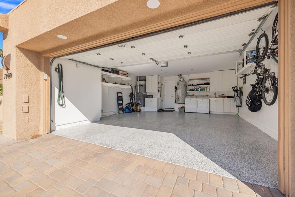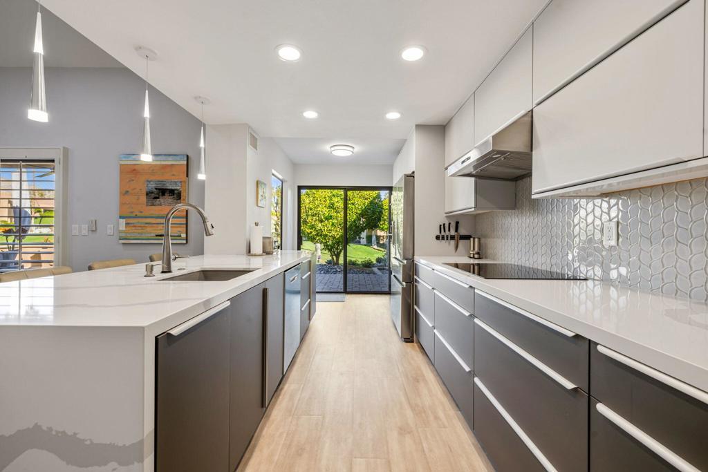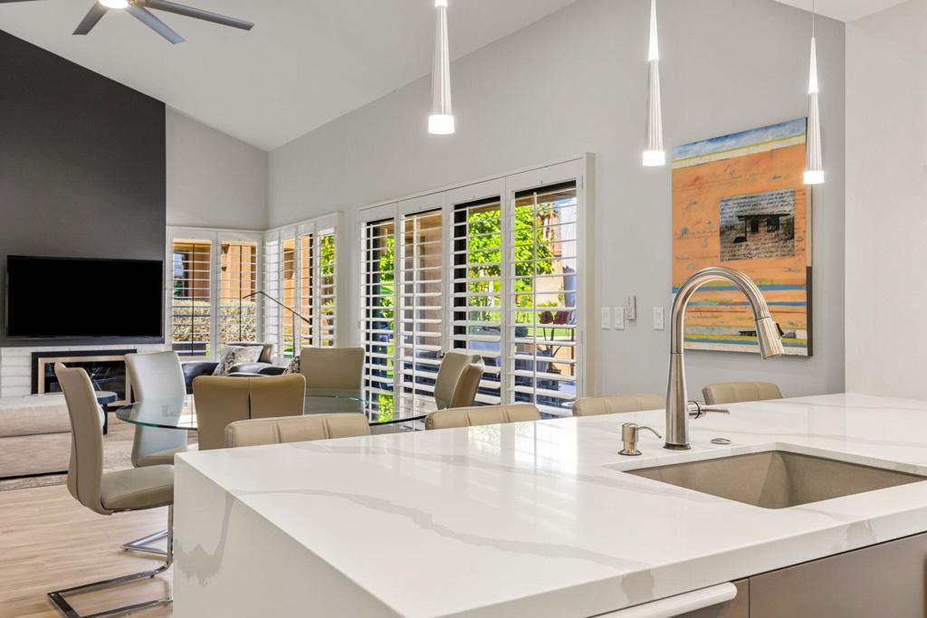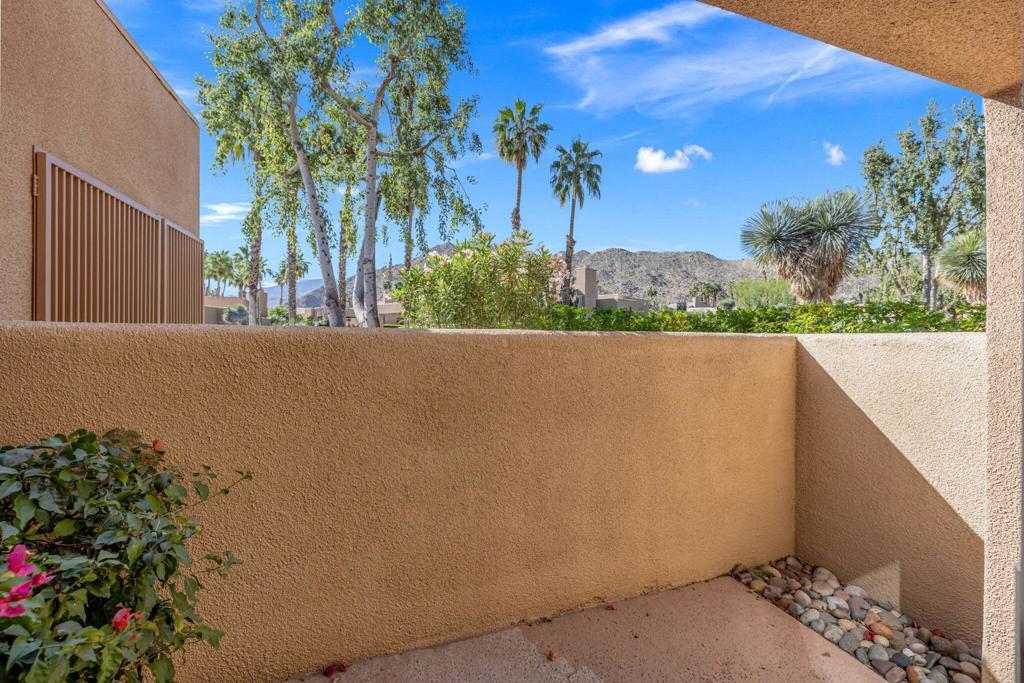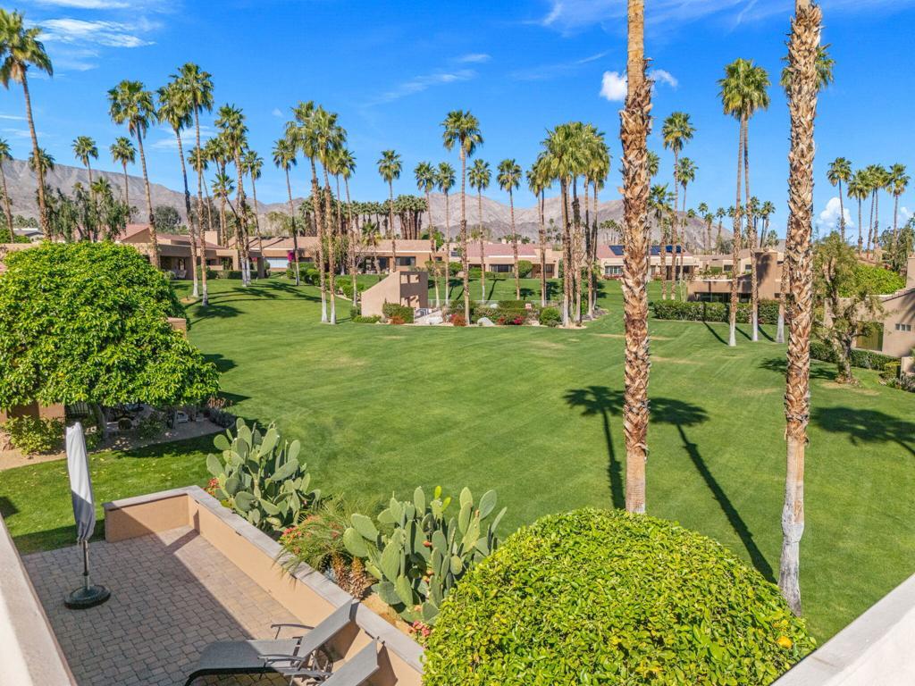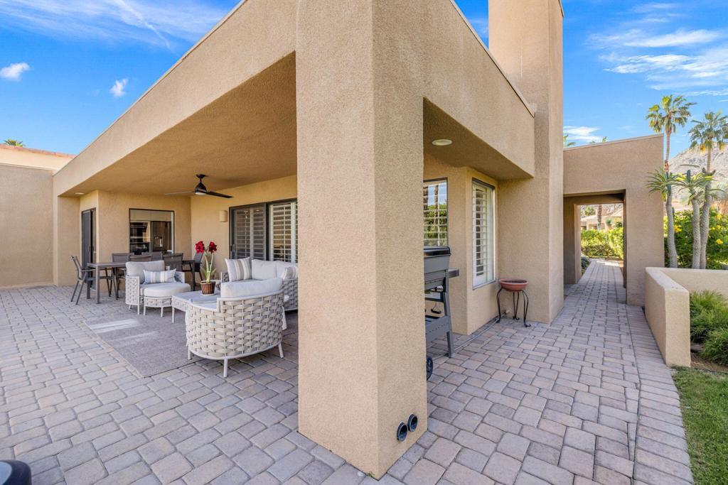 Enjoy views of sunset and mountains from this expanded wrap-around patio area. Located on a lush greenbelt near pool/spa.2-bedrooms 2-baths with fireplace and double attached garage. Updated modern kitchen with stone countertops, induction stovetop & custom cabinetry. Laminated wood flooring. Baths are remodeled with walk-in tile showers. New interior doors and trim. Guest bedroom closet has been partially converted to office space. Garage is customized with epoxy floor, newer washer/dryer and added sink. HVAC system and water heater are recently replaced. Pavers installed on driveway, walkway and patio areas. Beautiful villa in a serene setting offered Furnished per inventory. This HOA has 7-day minimum rental restriction.