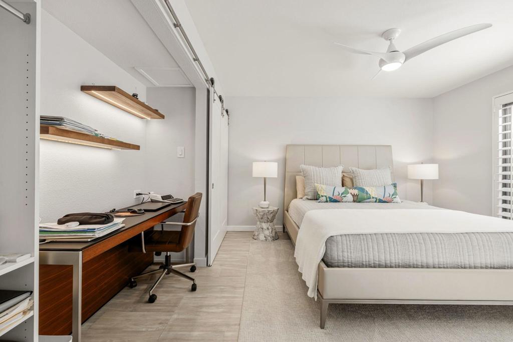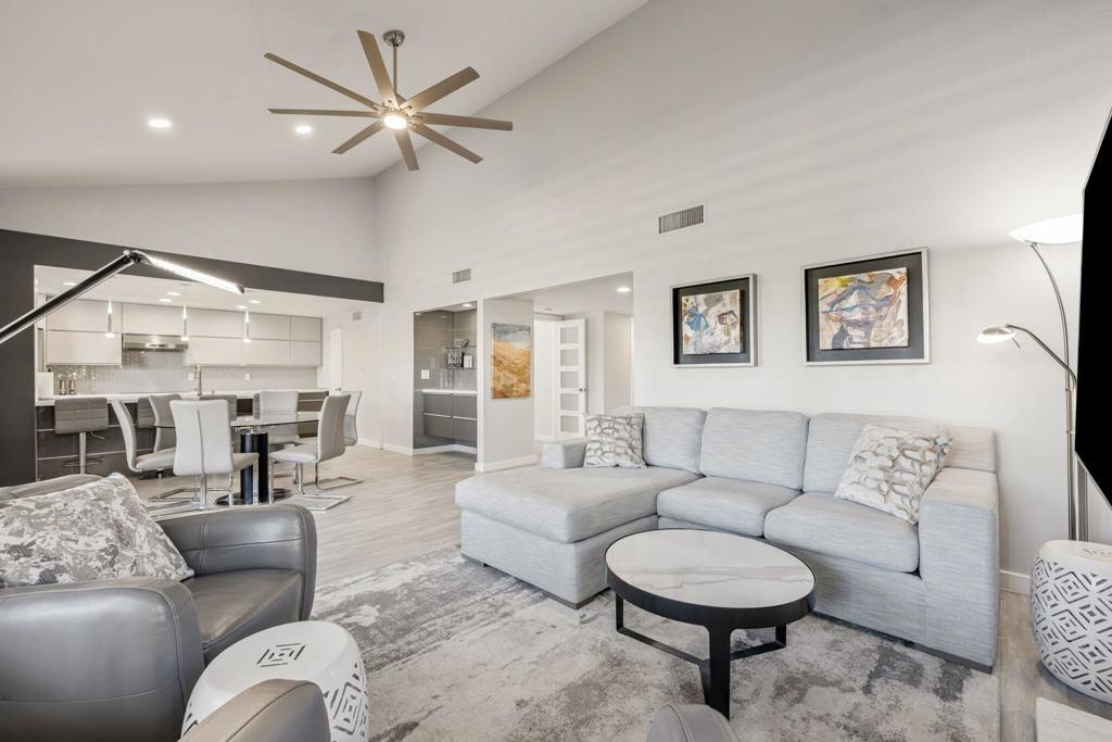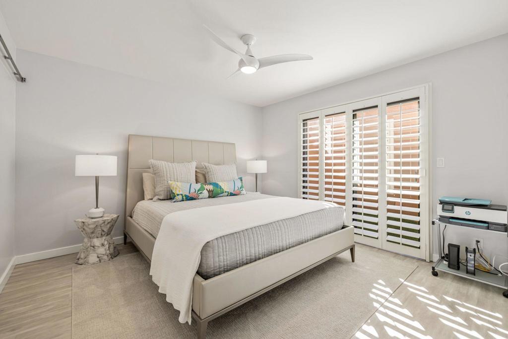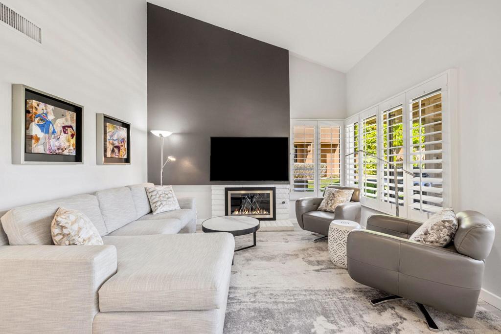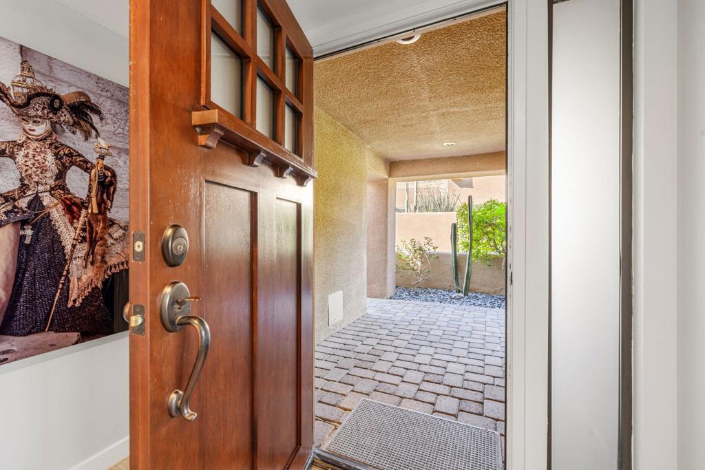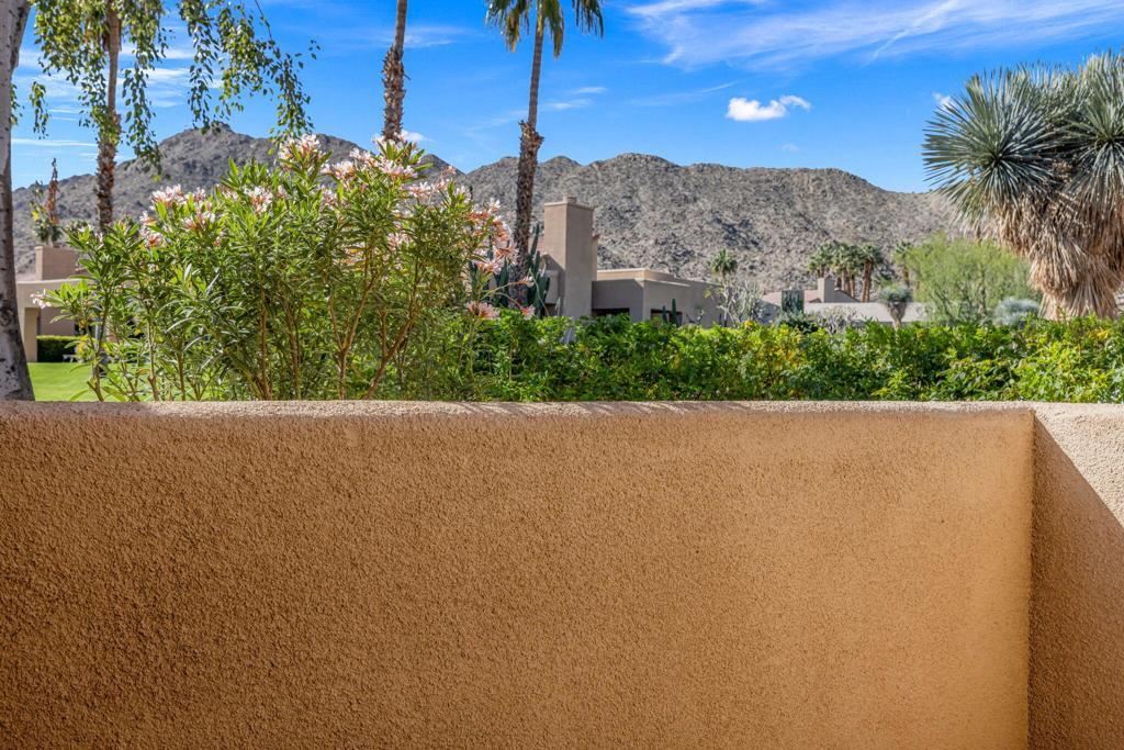 Enjoy views of sunset and mountains from this expanded wrap-around patio area. Located on a lush greenbelt near pool/spa.2-bedrooms 2-baths with fireplace and double attached garage. Updated modern kitchen with stone countertops, induction stovetop & custom cabinetry. Laminated wood flooring. Baths are remodeled with walk-in tile showers. New interior doors and trim. Guest bedroom closet has been partially converted to office space. Garage is customized with epoxy floor, newer washer/dryer and added sink. HVAC system and water heater are recently replaced. Pavers installed on driveway, walkway and patio areas. Beautiful villa in a serene setting offered Furnished per inventory. This HOA has 7-day minimum rental restriction.