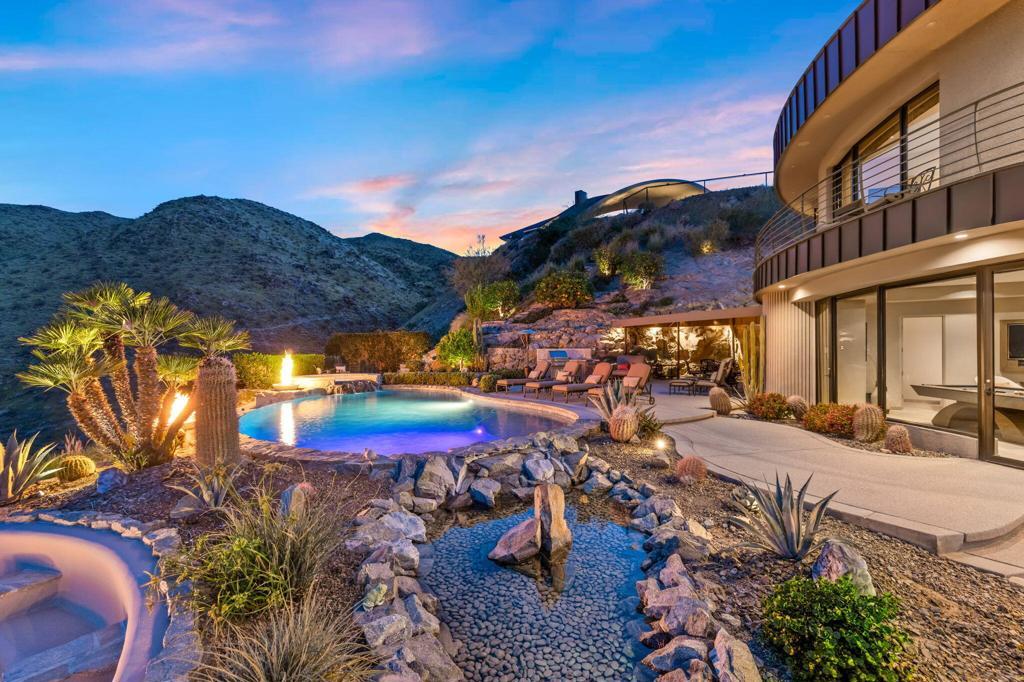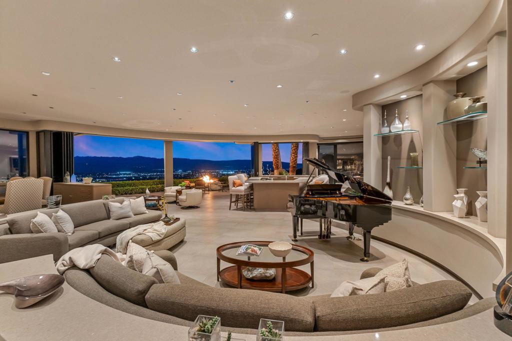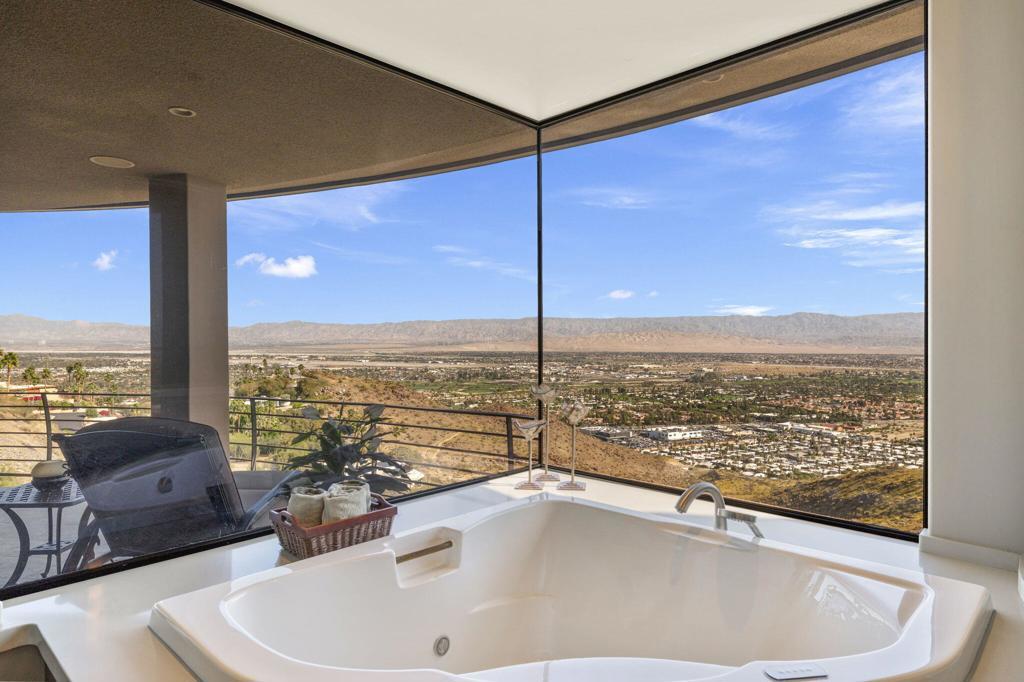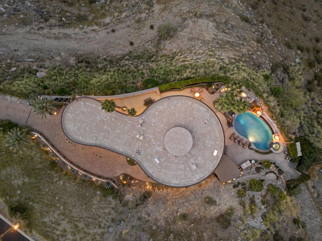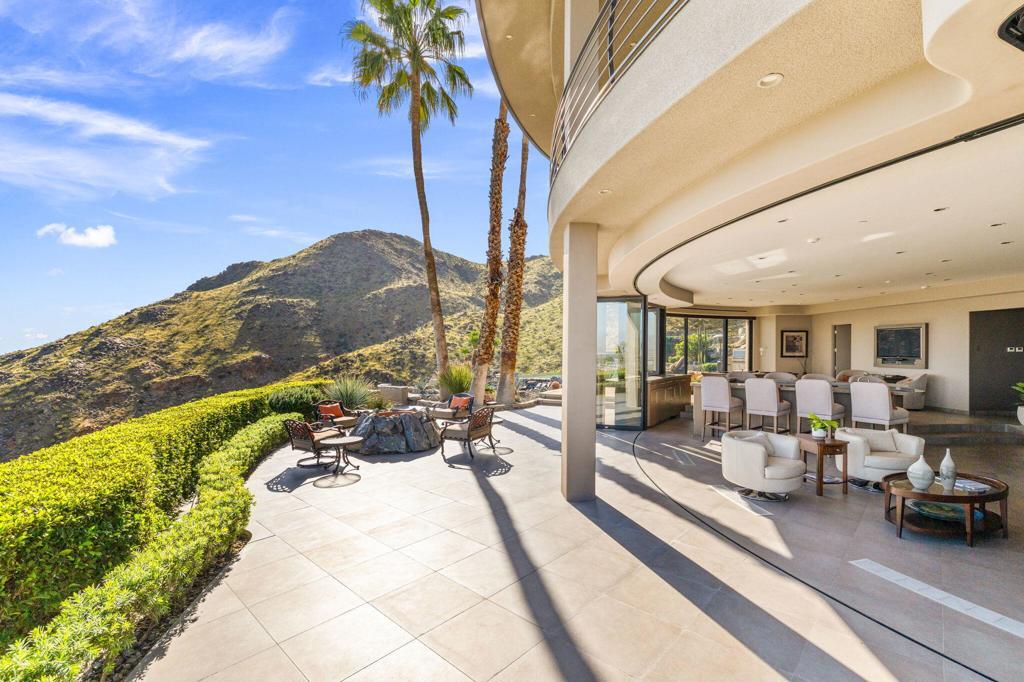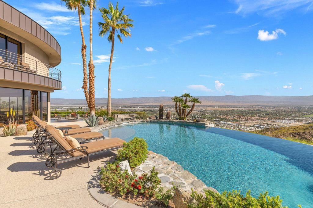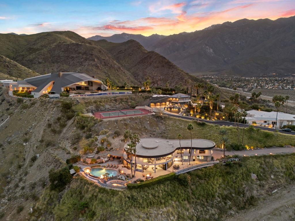 Perched high along the dramatic hillside of the San Jacinto Mountains in the iconic, guard-gated Southridge community, 2400 Southridge -- famously known as ''The Round House'' -- is a striking architectural masterpiece where sculptural design and breathtaking desert vistas converge. Just below the legendary Bob Hope Estate, this extraordinary residence commands sweeping panoramic views of the Coachella Valley, city lights, and endless desert horizons. This home was completely reimagined and rebuilt from the ground up, emerging as a striking expression of architectural innovation. Graceful curves, flowing lines and walls of automated retractable glass panels dissolve the boundaries between indoors and out, framing the surrounding desert landscape like living artwork. The residence offers 5 bedrooms, 9 bathrooms, a private office, and a spectacular 10-person luxury theater, with all bedrooms thoughtfully positioned on the second floor. Accessed by a graceful curved staircase or private elevator, the upper level features private balconies, views from every corner and a truly remarkable primary suite. The primary suite serves as a serene retreat with separate dual spa-inspired bathrooms, a steam shower, soaking tubs set against walls of glass overlooking the desert, a dramatic sundial-inspired walk-in closet and a separate massage room. Designed for grand entertaining and intimate desert living, the main level features a dramatic living room, elegant wet bar, billiards area, dining space, and a gourmet chef's kitchen with butler's pantry and dual built-in wine refrigerators. Every space is oriented toward the spectacular views. Step outside and the property becomes a breathtaking desert sanctuary. A stunning pool and spa sit dramatically at the edge of the mountainside, surrounded by multiple fire pits, two barbecue areas, poolside bath, shower and laundry and sculptural jagged rock walls carved directly into the mountain, creating a setting that feels both luxurious and elemental. Rarely does a home so perfectly blend bold architectural vision, modern luxury, and the raw beauty of the desert landscape. 2400 Southridge is more than a residence -- it is a transcendent experience that must be seen to be fully appreciated. Call today to make your own private showing appointment.