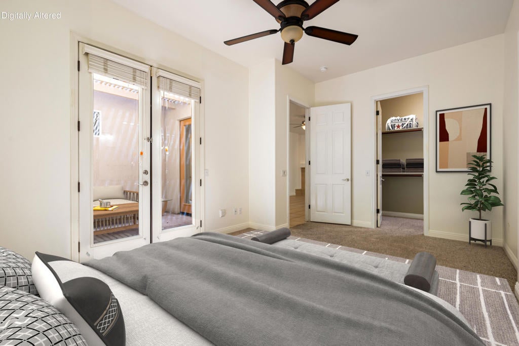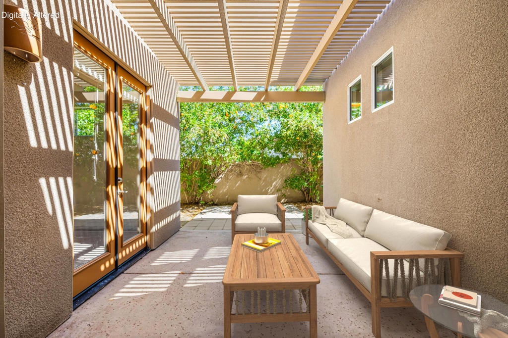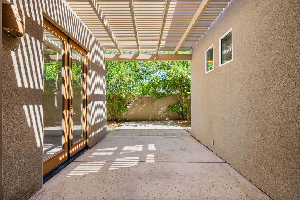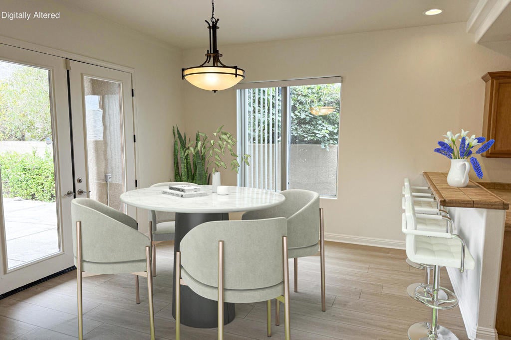 Perched high in the coveted La Quinta Cove, this captivating residence showcases majestic, unobstructed mountain panoramas from its private Pebble Tec pool, creating a resort-style sanctuary all your own. A gated courtyard ushers you into a sunlit foyer crowned with a skylight, opening to an elegant great room featuring new luxury vinyl flooring just installed and a tile-framed fireplace with gas logs and glass doors. French doors throughout bathe the home in natural light, enhancing the airy flow of this 1,704-sq-ft retreat with 3 bedrooms and 2 baths. The dining area frames sparkling pool and mountain views, while the adjacent kitchen impresses with stainless steel appliances, a breakfast bar, a pantry, tile counters, a gas range, and abundant cabinetry. Guest accommodations offer comfort and privacy with a nearby full bath featuring a shower-over-tub design. The primary suite is a serene escape with a walk-in closet, French doors to the patio, and a spa-inspired en suite with dual vanities, quartz counters, upgraded cabinetry, brushed-nickel hardware, pocket windows, and a spacious tile shower. A true LQ Cove gem--schedule your private showing and experience the magic for yourself.