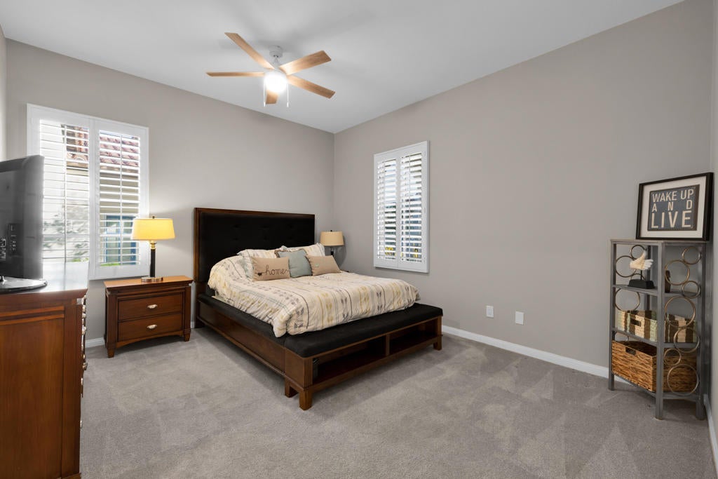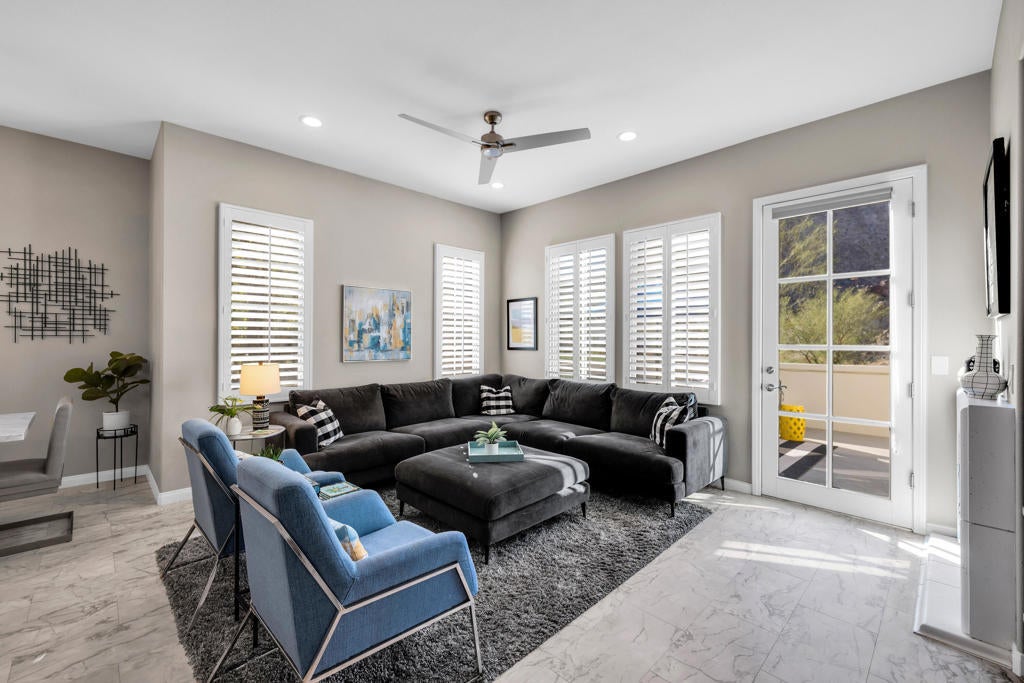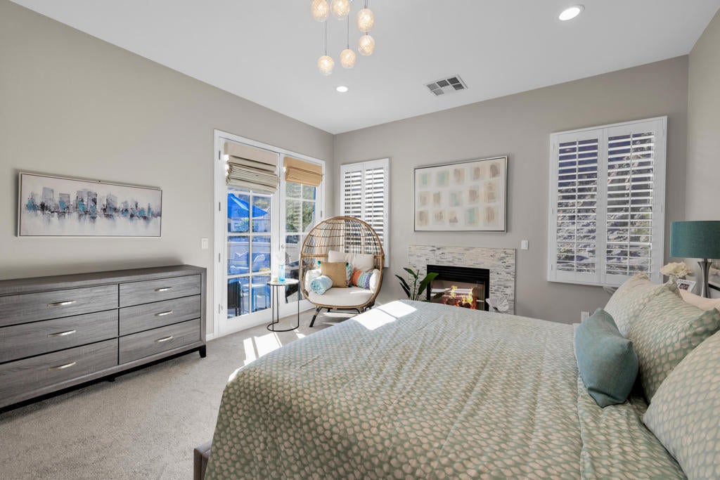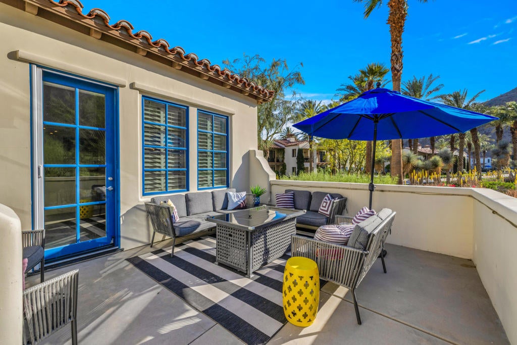 This is the ULTIMATE LOCATION in Legacy Villas. Sweeping views of the Santa Rosa Mountains across your private outdoor patio area. (Note the beautiful big horn sheep in photo). Largest Floor-Plan available...Beautiful two-story townhome offers an open Great Room with high ceilings, fireplace, large dining area. Updated kitchen and appliances. First floor Primary suite with fireplace and double French door and step out on private patio. Double custom closets, leads you to a bath with separate soaking tub, shower stall and dual sinks. First floor guest suite with nice separation from Primary also features full bath with separate tub, shower stall and dual sinks. Private second floor bedroom with king and its own ensuite tub, shower and dual sinks. Powder room off entry. Laundry room with sink and direct access to 2 car garage. Lower energy cost with IID Electric. Legacy Villas Resort Community offers it all! A 11,000 sq. ft. clubhouse for relaxation & entertainment. Seasonal poolside restaurant, The Legacy Grill, state-of-the-art fitness center, tranquil Date Palm Hammock Garden, 12 sparkling saltwater pools, two of which are exercise lap pools, and 11 spas. Common grounds feature 15 fountains and scenic walking trails and EV charging stations. The main pool area offers poolside cabanas, showers, kids' water fixtures, and a walk-in beach pool. Just outside the guarded gates is famous La Quinta Resort and Club, offering golf, tennis, pickleball, fine dining, and Spa. (Membership options available.) A short distance to Old Town La Quinta. Legacy Villas is fully authorized for SHORT TERM RENTALS, making it an excellent opportunity for investment when you're not enjoying this beautiful getaway home.