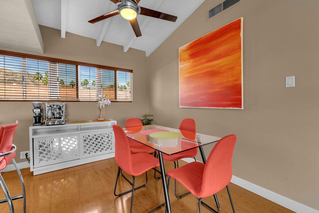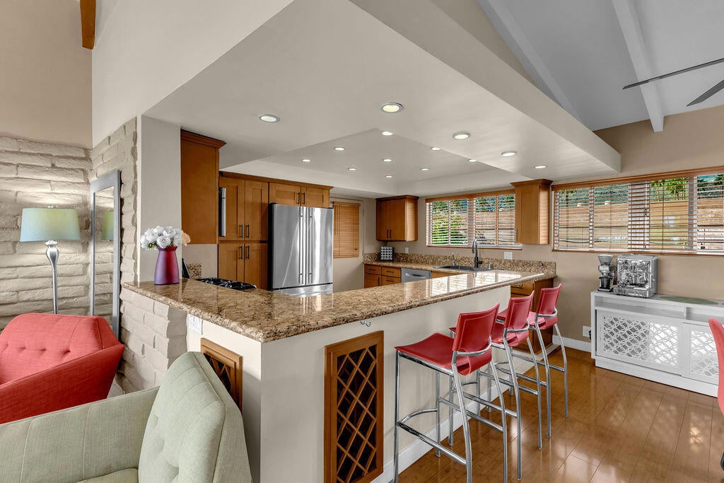 Desert Braemar is where timeless desert charm meets effortless living--and Unit 260 captures it beautifully. Set within a private, gated 55+ Co-Op community in Rancho Mirage, this residence offers tranquil views of the serenity garden, green landscaped spaces and pathways, and the surrounding mountains from its inviting balcony. The interior offers vaulted beamed ceilings and is thoughtfully updated with an open-concept granite and stainless kitchen, generous counters and bar tops, and a spacious bath featuring double vanities and a stylish walk-in shower--designed for comfort, simplicity, and ease.Plus, a stack washer/dryer is included too.Here, the lifestyle is as impressive as the setting. Residents enjoy a resort-style collection of amenities including pool and spa, tennis and pickleball courts, lawn bowling, a putting green, fitness center, and a welcoming garden room with a full kitchen and outdoor entertaining spaces, and has a full seasonal calendar of events and activities.Walk to nearby eateries, cafes, shopping, and walking trails. Even more appealing, the HOA includes property taxes, water, cable, internet, and exterior maintenance and grounds care--creating a truly low-maintenance experience. Whether you're seeking a comfortable desert retreat or a full-time residence, Desert Braemar offers a sense of place that feels both peaceful and connected.