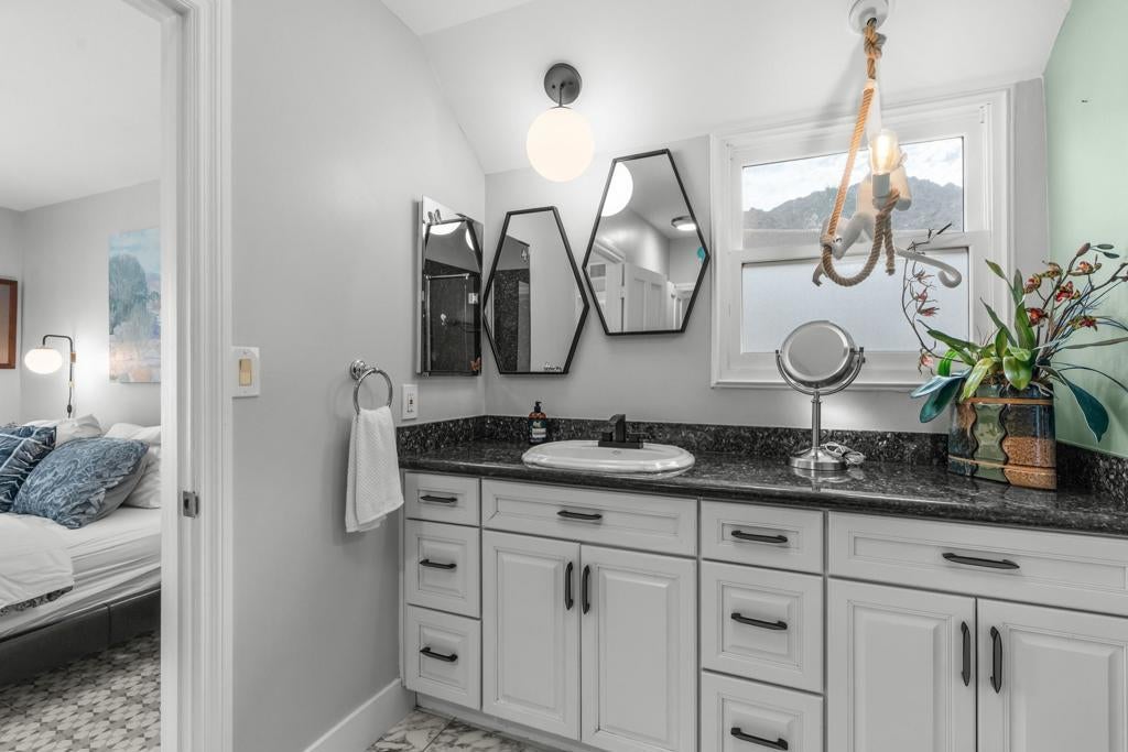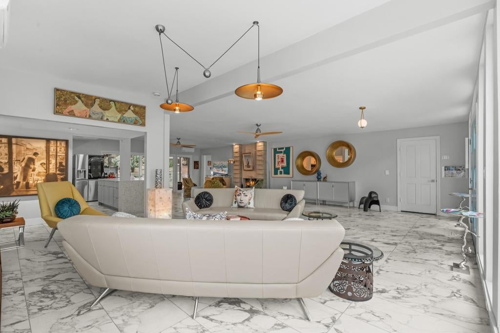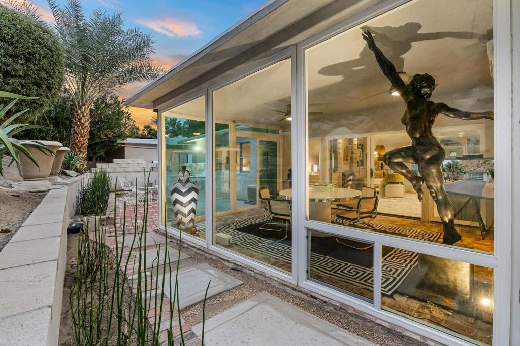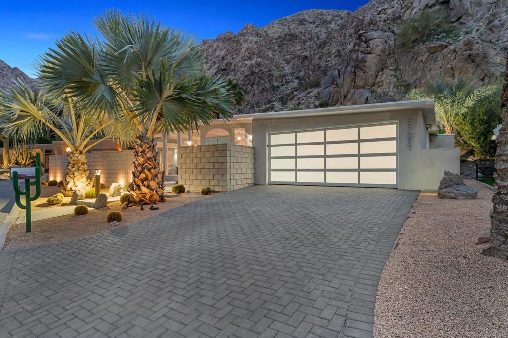 A rare architectural find, this authentic mid-century modern A-frame is tucked away on a quiet cul-de-sac inside the prestigious, 24-hour guard-gated Indian Wells Country Club with no HOA fees. Set against the dramatic backdrop of the Santa Rosa Mountains, this home offers a unique blend of privacy, history, and timeless design. Located in one of the desert's most storied neighborhoods once home to Hollywood legends Desi Arnaz and Lucille Ball, this property is a true piece of Indian Wells history. Walls of glass and soaring ceilings flood the home with natural light, highlighting the clean lines and iconic angles that define mid-century architecture. The open-concept layout seamlessly connects the upgraded kitchen, dining area, and expansive great room, all centered around a warm, inviting fireplace, perfect for both relaxed living and entertaining. Thoughtfully designed for privacy, the three bedrooms are well separated, creating comfortable retreats for owners and guests alike. Notable upgrades include new windows, a remodeled kitchen and bathrooms, EV charger, a new AC system with six individual mini splits for room by room climate control, and an enclosed sunroom lounge perfectly positioned to take in the mountain views. Every update enhances comfort while preserving the home's architectural integrity. Step outside to enjoy direct access to a serene community pool just steps from the front door, ideal for effortless desert living. A two car garage adds convenience, while the peaceful setting reinforces the home's resort like feel. Whether you're looking for a full time residence, a weekend escape, or a sophisticated investment, this home delivers iconic style, modern comfort, and a truly special location. An entertainer's dream and a rare opportunity to own a piece of Indian Wells history.