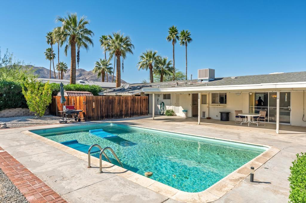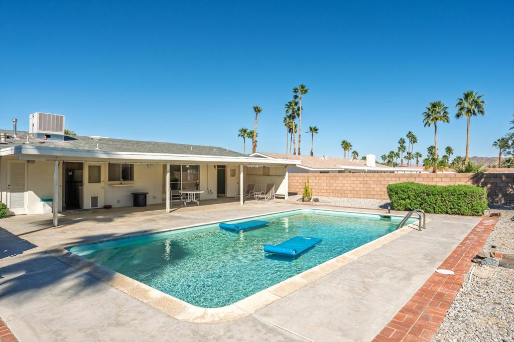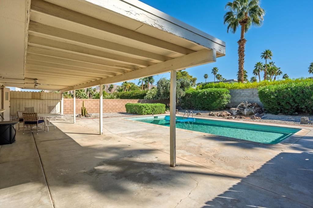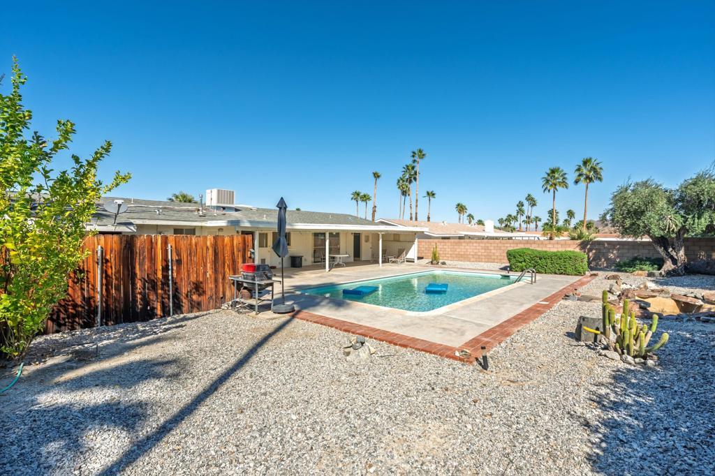 Welcome to the highly sought-after neighborhood of Silver Spur Ranch in South Palm Desert. This mid- century two- bedroom, two-bath home offers approximately 1500 square feet of living space and sits on a spacious lot with a desirable south-facing backyard.Inside you'll find a home full of character with original finishes and a spacious open floor plan. The living room is centered around a charming brick-accented fireplace and complemented by large windows that flood the space with natural light. Both bedrooms are generously sized, with one offering convenient access to the front yard and the other providing direct access to the backyard ideal for enjoying indoor-outdoor desert living.The kitchen features a functional layout with some updated appliances and seamless access to the backyard, making it perfect for entertaining. Step outside to experience desert living at its finest. The backyard is highlighted by a large pool with decorative rock waterfall, mature landscaping, and beautiful views. A covered patio provides the perfect setting for relaxing or hosting gatherings while enjoying the warm desert sunshine. The location is a true highlight of this home, ideally situated near Ironwood Park, the renowned Living Desert Zoo and Gardens, and the world-famous El Paseo Shopping District. Enjoy convenient access to premier shopping, dining and outdoor recreation- all just minutes away. This home presents a fantastic opportunity to add your own personal touches and create the ultimate desert retreat.