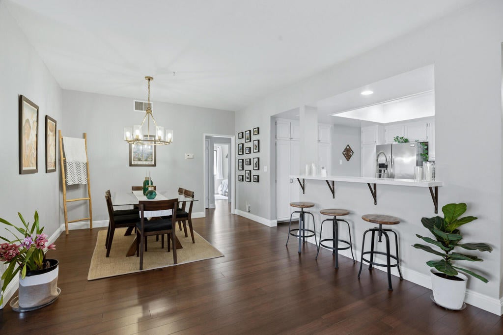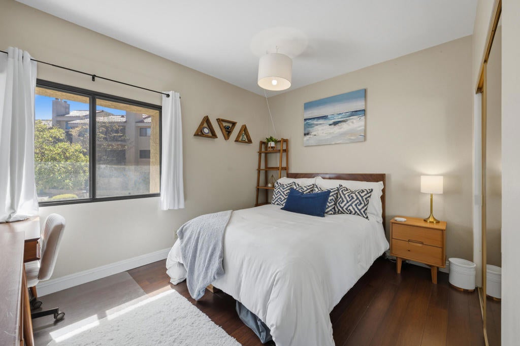 A wonderful opportunity awaits you at the prestigious Pacific Club Condominiums. This rarely available, two bedroom, two bath, second floor end unit has been beautifully remodeled and updated. As you step into the foyer, you will notice the rich, bamboo wood flooring throughout. Have a refreshment at the mid century modern wet bar, as you enter the expansive, open concept living room and dining area. Relax in front of the comfy, brick fireplace, and enjoy the pool view from the balcony, perfect for an afternoon BBQ. The dining area has custom lighting, and ample room for those special dinner parties. Enjoy a cup of Joe at the refreshed breakfast bar. There is custom cabinetry and designer tile work on the backsplash, quartz countertops, and recessed lighting with a tray ceiling in the fully remodeled kitchen. The primary bedroom is spacious with it's own private balcony, and ample walk-in closet. Step into the luxurious primary bath with it's own free standing tub and custom teak vanity with double sinks, and a bespoke make-up vanity. If it's a shower you want, try out the remodeled stall shower with it's designer tiles and fixtures. Down the hall there is your very own laundry closet with washer and dryer. The guest bedroom is very private and the guest bath has been remodeled as well. The vanity is topped with gorgeous, custom Carrera marble. For your entertainment, there are built-in ceiling speakers in the living room, primary bedroom, and bath. The windows and patio doors have been replaced, the balconies have been redone and there is a newer AC unit and water heater. The condo has been newly painted. Enjoy the convenience of two, gated, covered and secure parking spaces located next to the elevator. The executive amenities include 24 hour security and daytime concierge, 2 pools, 3 spas, a fitness center, a racket ball court, and a poolside clubhouse with banquet area complete with a full kitchen. The Pacific Club Condominiums is ideally situated, and is walking distance to the beach, and conveniently located close to shops and restaurants. It's an easy commute to LAX, the Westside and the South Bay! Come see this bespoke condominium, and enjoy the resort-like lifestyle!