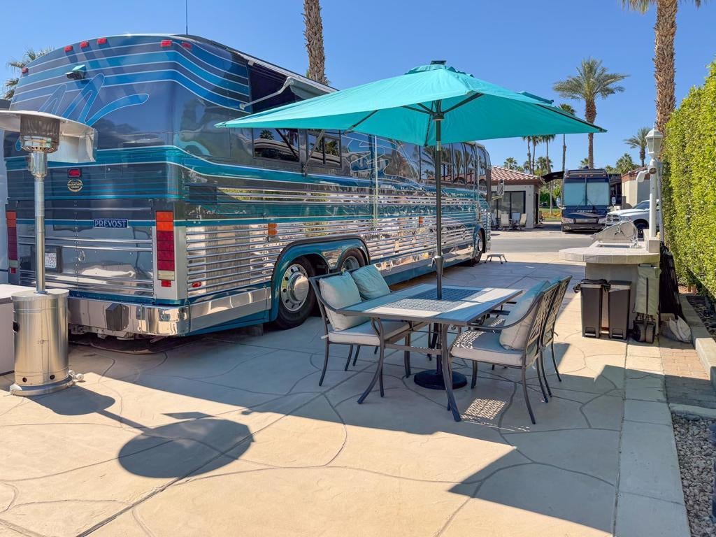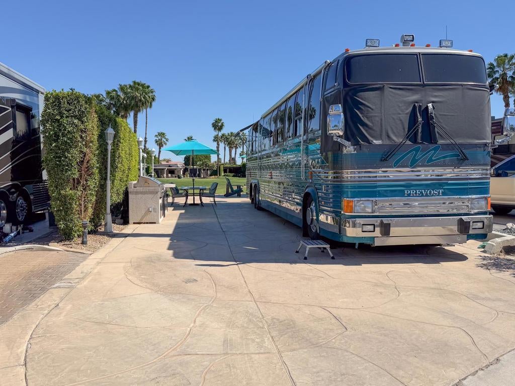 Welcome to a beautifully positioned luxury RV lot at Outdoor Resort Indio, offering both privacy and scenic golf course views in one of the most desirable Class A motorcoach resorts in California. Thoughtfully landscaped and designed for comfort, this lot provides a peaceful retreat while still being conveniently located near the heart of the clubhouse activity -- yet far enough away to avoid pickleball noise.The outdoor living space is ideal for entertaining, featuring a gas fire pit surrounded by four matching chairs with umbrella, plus an additional outdoor dining table with four cushioned chairs and umbrella. A medium-sized outdoor kitchen includes hot water, garbage disposal, refrigerator, one-burner cooktop, built-in BBQ grill, and rated storage -- making it easy to host gatherings or enjoy quiet evenings under the desert sky.The lot also offers a surfaced RV pad and pavers along the side for additional golf cart parking, adding flexibility and convenience. With golf course views, privacy, and a prime location within Outdoor Resort Indio, this property captures the luxury RV lifestyle that Class A motorcoach owners seek -- combining scenery, functionality, and vibrant resort living.Outdoor Resort Indio is a class A RV resort.