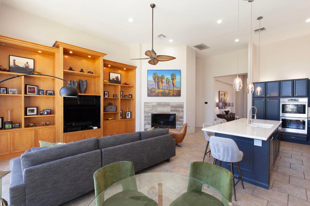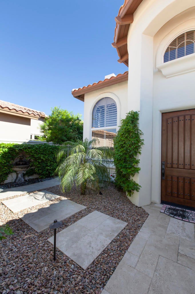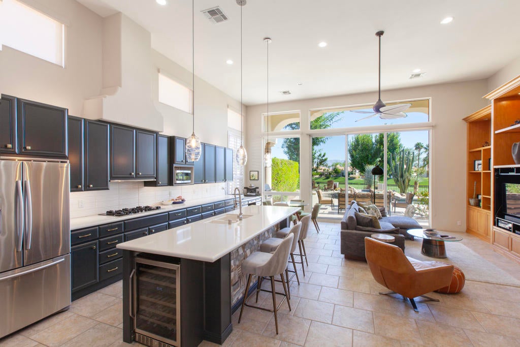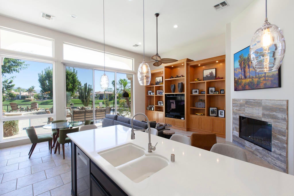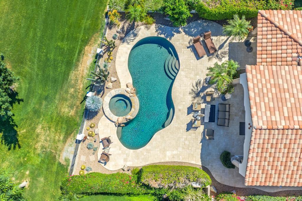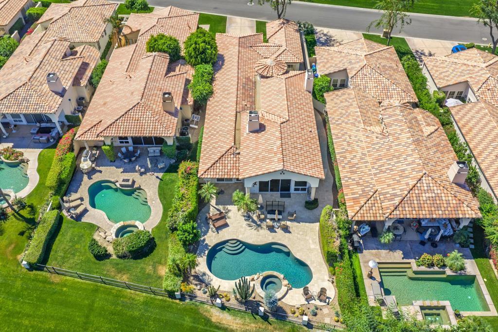 Set behind the prestigious gates of Rancho La Quinta Country Club, this exceptional updated desert residence embodies elevated luxury, where timeless architecture and curated upgrades harmonize with a breathtaking natural setting. Perched above the emerald fairways of the renowned Robert Trent Jones Jr. Championship Golf Course, the home captures sweeping golf course, tranquil lake, and mountain vistas that transform beautifully from sunrise to sunset.A private courtyard arrival, framed by lush professional landscaping and ambient lighting, sets a tone of understated elegance. Chipped-edge travertine pathways lead to a custom wood entry door, opening to a light-filled interior designed for both relaxed living and sophisticated entertaining. Inside, soaring ceilings and an open-concept layout create a sense of space and flow, complemented by high-fired ceramic flooring that extends throughout. Custom interior paint and designer lighting add warmth and refinement, while the expansive family room--anchored by a bespoke entertainment wall and one of two updated fireplaces--offers an inviting gathering space.The remodeled kitchen is both stylish and functional, featuring premium Corian countertops, a custom backsplash, and beautifully refinished cabinetry. A generous center island with pendant lighting serves as the heart of the home, complemented by stainless steel appliances including double ovens, dishwasher, microwave, and refrigerator. Seamless indoor-outdoor living defines the residence. Walls of glass open to an extraordinary patio with a custom curvilinear pool, elevated spa, and cascading waterfall. A BBQ island invites effortless entertaining, while a low-profile fence preserves uninterrupted golf course views.A detached two-room casita offers flexible guest accommodations, while the main home showcases quality finishes throughout, including raised panel solid core doors, custom shutters, tailored shades, and new LED lighting. Additional highlights include two updated fireplaces, extensive system upgrades, and a finished two-car garage with epoxy flooring, air conditioning, and built-in storage. Please see Improvements List.This refined desert sanctuary offers privacy, panoramic beauty, and an exceptional lifestyle in one of La Quinta's most coveted communities.