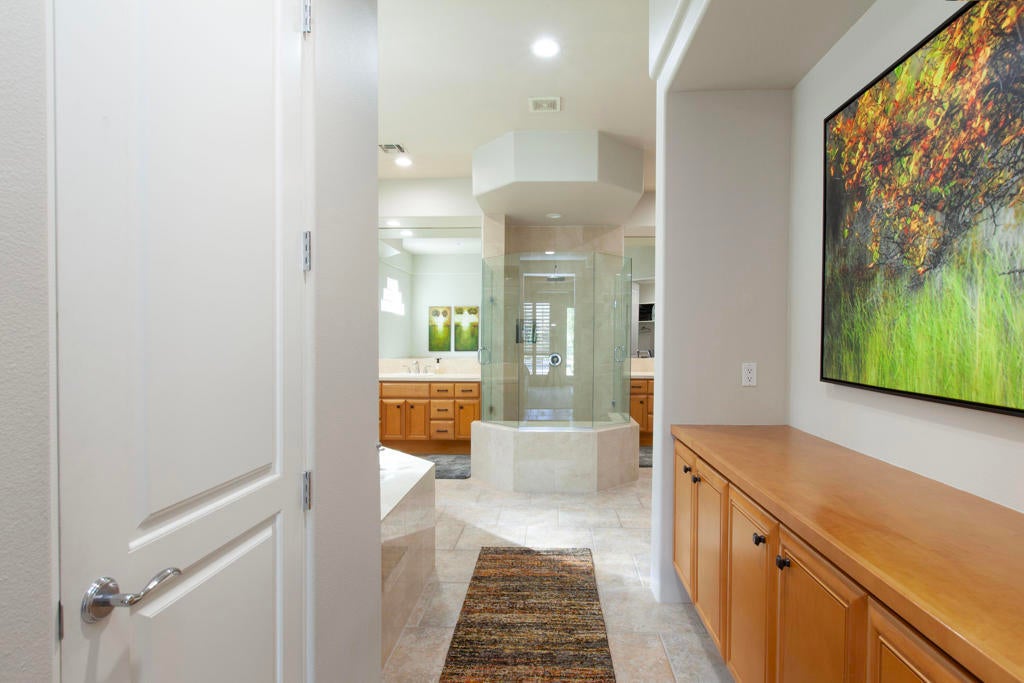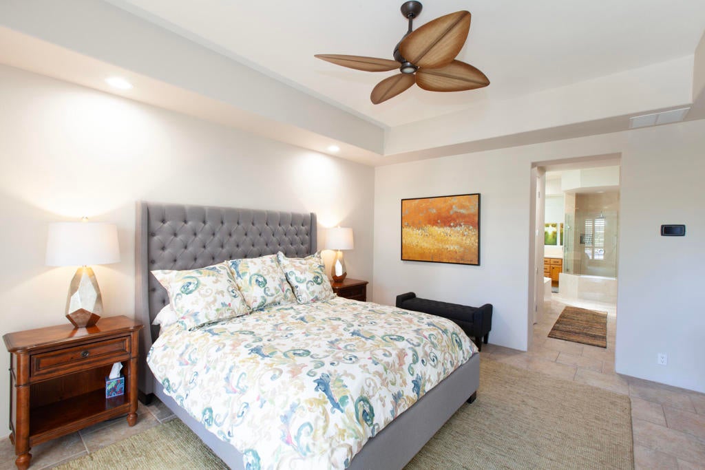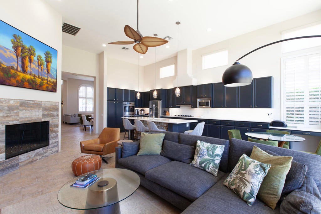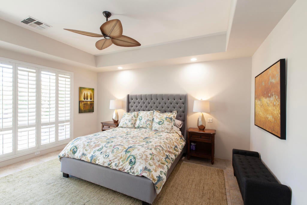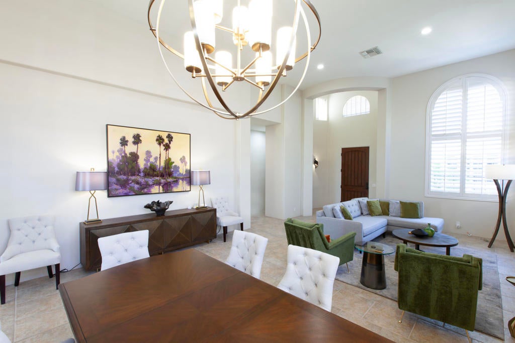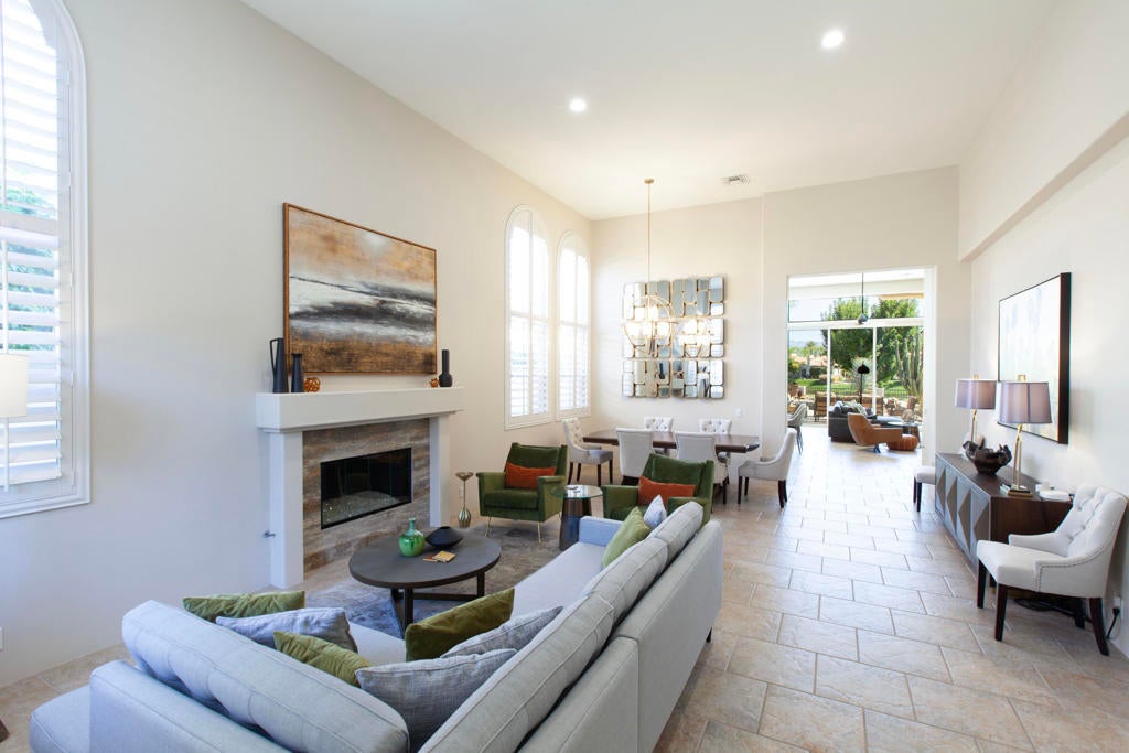 Set behind the prestigious gates of Rancho La Quinta Country Club, this exceptional updated desert residence embodies elevated luxury, where timeless architecture and curated upgrades harmonize with a breathtaking natural setting. Perched above the emerald fairways of the renowned Robert Trent Jones Jr. Championship Golf Course, the home captures sweeping golf course, tranquil lake, and mountain vistas that transform beautifully from sunrise to sunset.A private courtyard arrival, framed by lush professional landscaping and ambient lighting, sets a tone of understated elegance. Chipped-edge travertine pathways lead to a custom wood entry door, opening to a light-filled interior designed for both relaxed living and sophisticated entertaining. Inside, soaring ceilings and an open-concept layout create a sense of space and flow, complemented by high-fired ceramic flooring that extends throughout. Custom interior paint and designer lighting add warmth and refinement, while the expansive family room--anchored by a bespoke entertainment wall and one of two updated fireplaces--offers an inviting gathering space.The remodeled kitchen is both stylish and functional, featuring premium Corian countertops, a custom backsplash, and beautifully refinished cabinetry. A generous center island with pendant lighting serves as the heart of the home, complemented by stainless steel appliances including double ovens, dishwasher, microwave, and refrigerator. Seamless indoor-outdoor living defines the residence. Walls of glass open to an extraordinary patio with a custom curvilinear pool, elevated spa, and cascading waterfall. A BBQ island invites effortless entertaining, while a low-profile fence preserves uninterrupted golf course views.A detached two-room casita offers flexible guest accommodations, while the main home showcases quality finishes throughout, including raised panel solid core doors, custom shutters, tailored shades, and new LED lighting. Additional highlights include two updated fireplaces, extensive system upgrades, and a finished two-car garage with epoxy flooring, air conditioning, and built-in storage. Please see Improvements List.This refined desert sanctuary offers privacy, panoramic beauty, and an exceptional lifestyle in one of La Quinta's most coveted communities.