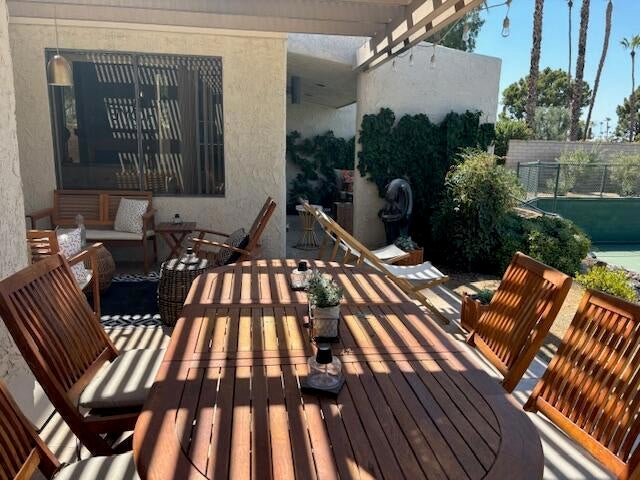 This beautifully renovated home is located in Dorado Villas--one of the most desirable communities in Indian Wells--directly across from the prestigious The Vintage Club and El Dorado Country Club. Thoughtfully designed and meticulously decorated, the home offers a warm, welcoming atmosphere that immediately makes you feel at ease.The open-concept floor plan features a formal living room, elegant dining area, and a full wet bar complete with a wine refrigerator--perfect for entertaining. These spaces flow seamlessly onto the back patio, which overlooks a lush greenbelt and tennis courts, creating a true indoor-outdoor living experience.An informal dining area connects to the kitchen and is separated by an additional bar, making it ideal for casual meals and gatherings.Step outside to a stunning outdoor dining space with a built-in BBQ, where you can enjoy meals while taking in serene views of the tennis courts and surrounding desert landscape. Two additional seating areas provide ample space for relaxing or hosting guests.Each bedroom is designed for comfort and privacy, offering direct access to a private patio and a dedicated en-suite bathroom. The spacious primary suite includes oversized walk-in closets and its own beautifully landscaped patio--perfect for quiet mornings or evening relaxation.Residents of Dorado Villas enjoy access to a gated, resort-style community with multiple tennis courts, pools, spas, and expansive greenbelts.Ideally located within walking distance to restaurants, shopping, grocery stores, and cafes, and just minutes from the world-renowned Indian Wells Tennis Garden, this home offers the perfect combination of luxury, convenience, and lifestyle.Note: Price listed is based on a long-term lease. Please contact the listing agent for seasonal rates.