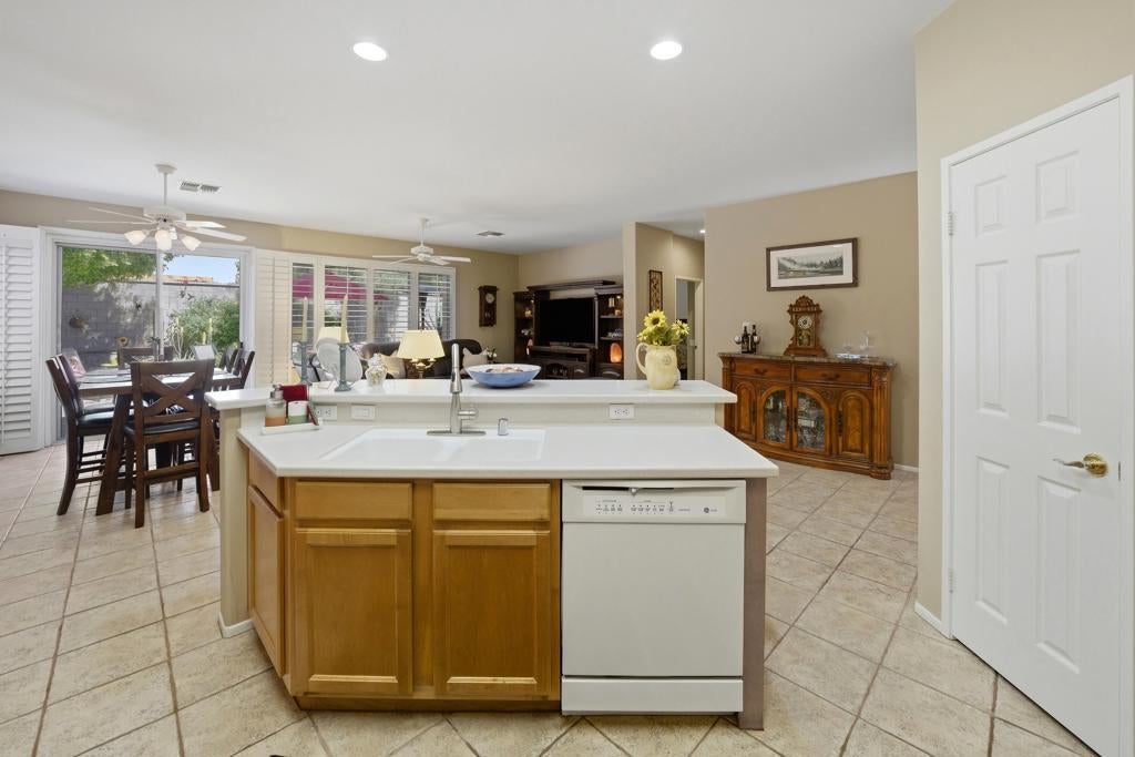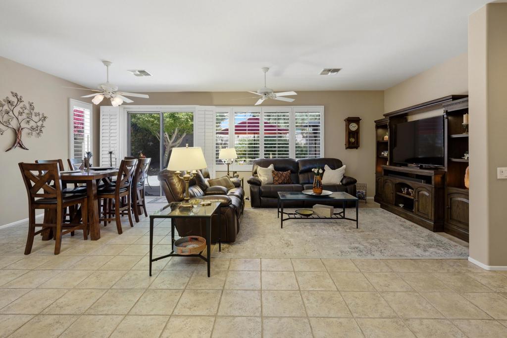 Sun City Palm Desert - St. Maarten. This St. Maarten greatroom home sits on a quiet cul-de-sac in the heart of the community, just a block from the Sunset View Clubhouse with its pool, restaurant, and bocce courts--making it easy to enjoy the resort-style lifestyle every day. The home features a spacious north-facing rear yard with an expansive patio and lush, low-maintenance desert landscaping--an ideal setting for relaxing or entertaining. Attractive curb appeal is enhanced by beautifully maintained landscaping with artificial turf. Inside, tile flooring is used throughout the home (no carpet), including wood-look tile in the bedrooms and den. Plantation shutters are also featured throughout. The kitchen opens to the greatroom and includes an island with breakfast bar, corian counters, a pantry, and light maple cabinetry that continues into the bathrooms and linen storage. A spacious den/office sits just off the greatroom, providing flexible living space. The primary suite features a bay window and a large walk-in closet. Its ensuite bathroom has dual sinks, cultured marble surfaces, and a stall shower with glass enclosure. The guest bathroom includes a tub/shower combination. Additional features include a laundry room with built-in storage and an extended 2-car garage with ample storage space. This well-located home combines comfort, functionality, and easy access to the many amenities that make Sun City Palm Desert such a desirable place to live.