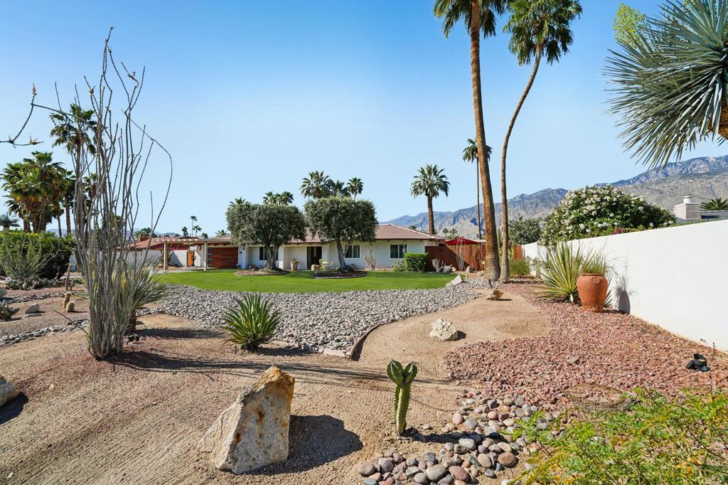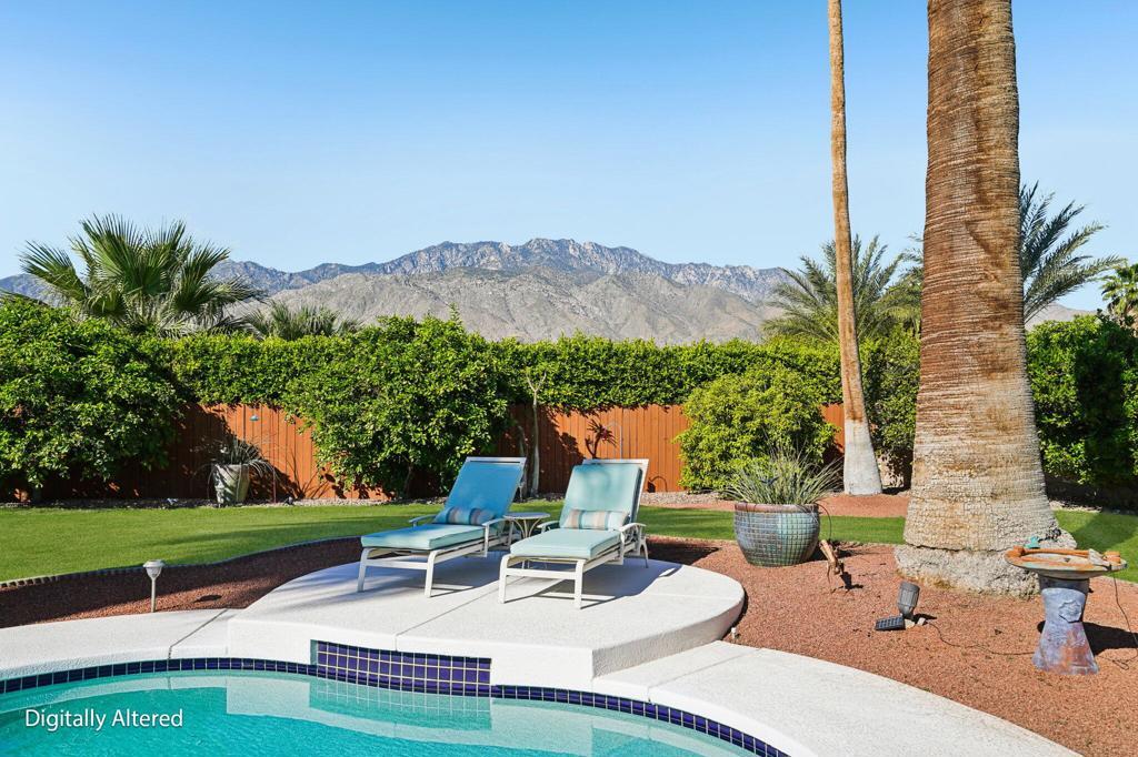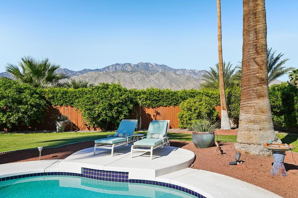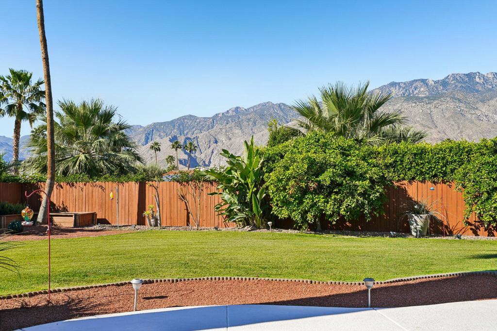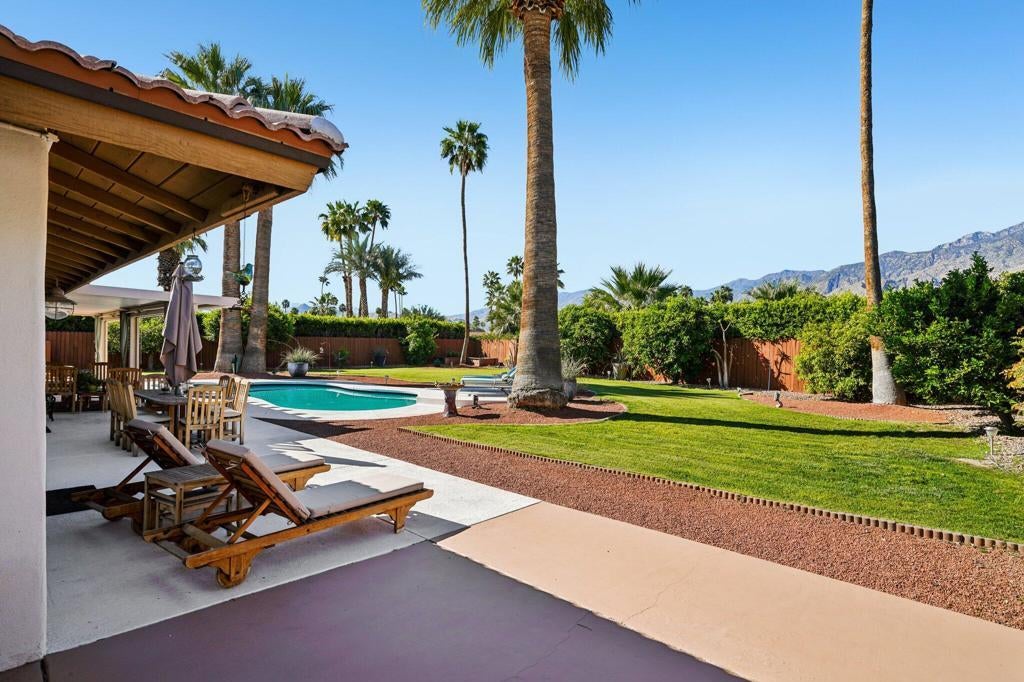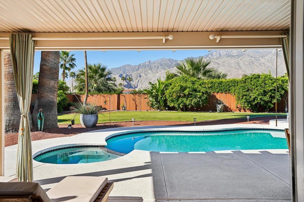 Prepared to be blown away by this expansive 17,400 sq ft lot with sweeping views including the Palm Springs Tram & Tahquitz Witch, San Jacinto mountain views & more. Not to mention, no power lines behind, and owned solar (owners haven't had a bill since 2023)! This 3BD/2BA Palm Springs home on FEE land (you own the land) offers a rare combination of privacy, and usable outdoor space with all the location convenience that Central Palm Springs offers! Designed for true indoor-outdoor living, the backyard features a large pebble tec saltwater pool and spa, multiple conversation areas, and a unique outdoor entertainment setup with pool table and TV, ideal for relaxing or hosting. Inside, the home offers approximately 1,500+ sq ft with a well-maintained layout, vaulted beamed ceilings, and a comfortable flow between living, dining, and outdoor spaces. The kitchen includes top of the line JennAir appliances (inside and out), granite countertops, BBQ pass through window, updated cabinets, and functional workspace for everyday living or entertaining. The primary suite is thoughtfully positioned for privacy and includes direct access to outdoor areas & primary bath with updated subway tile shower. Main bath has glass block, two vanities plus pool/outdoor access. Upgraded windows contribute to interior comfort/noise reduction. Additional features include: upgraded ductwork/attic insulation, a two-car garage, low-maintenance desert landscaping, citrus trees, and Fee Land (you own the land). Located close to downtown Palm Springs, dining, shopping, and local amenities, offering convenience without sacrificing space or setting. A unique opportunity to own a property where lot size, views, and outdoor lifestyle take center stage. This is one of those properties that you know the minute you walk in it's been well maintained! Properties offering this combination of lot size, views, and outdoor functionality are increasingly difficult to find in this area so don't delay!