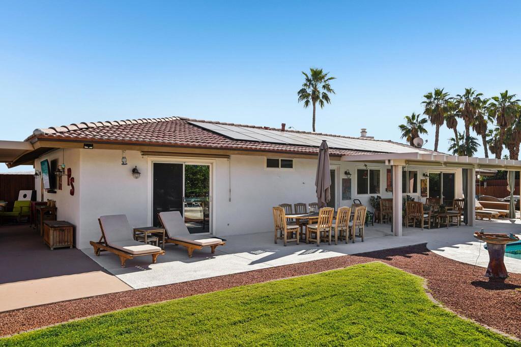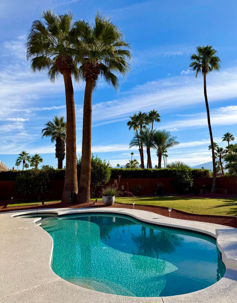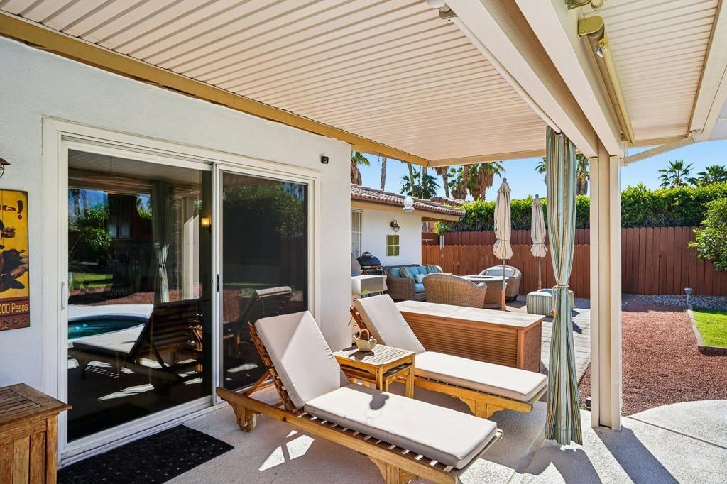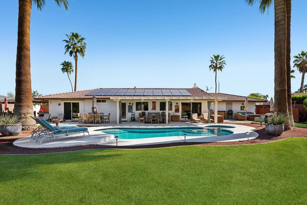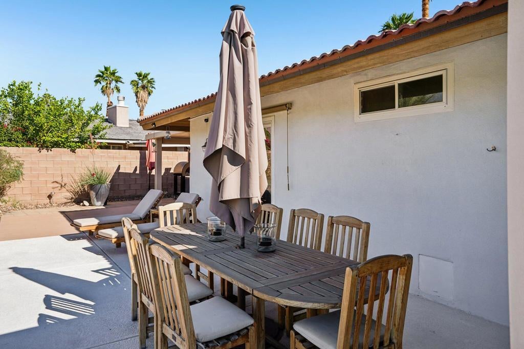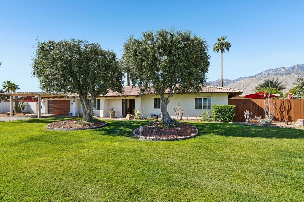 Prepared to be blown away by this expansive 17,400 sq ft lot with sweeping views including the Palm Springs Tram & Tahquitz Witch, San Jacinto mountain views & more. Not to mention, no power lines behind, and owned solar (owners haven't had a bill since 2023)! This 3BD/2BA Palm Springs home on FEE land (you own the land) offers a rare combination of privacy, and usable outdoor space with all the location convenience that Central Palm Springs offers! Designed for true indoor-outdoor living, the backyard features a large pebble tec saltwater pool and spa, multiple conversation areas, and a unique outdoor entertainment setup with pool table and TV, ideal for relaxing or hosting. Inside, the home offers approximately 1,500+ sq ft with a well-maintained layout, vaulted beamed ceilings, and a comfortable flow between living, dining, and outdoor spaces. The kitchen includes top of the line JennAir appliances (inside and out), granite countertops, BBQ pass through window, updated cabinets, and functional workspace for everyday living or entertaining. The primary suite is thoughtfully positioned for privacy and includes direct access to outdoor areas & primary bath with updated subway tile shower. Main bath has glass block, two vanities plus pool/outdoor access. Upgraded windows contribute to interior comfort/noise reduction. Additional features include: upgraded ductwork/attic insulation, a two-car garage, low-maintenance desert landscaping, citrus trees, and Fee Land (you own the land). Located close to downtown Palm Springs, dining, shopping, and local amenities, offering convenience without sacrificing space or setting. A unique opportunity to own a property where lot size, views, and outdoor lifestyle take center stage. This is one of those properties that you know the minute you walk in it's been well maintained! Properties offering this combination of lot size, views, and outdoor functionality are increasingly difficult to find in this area so don't delay!