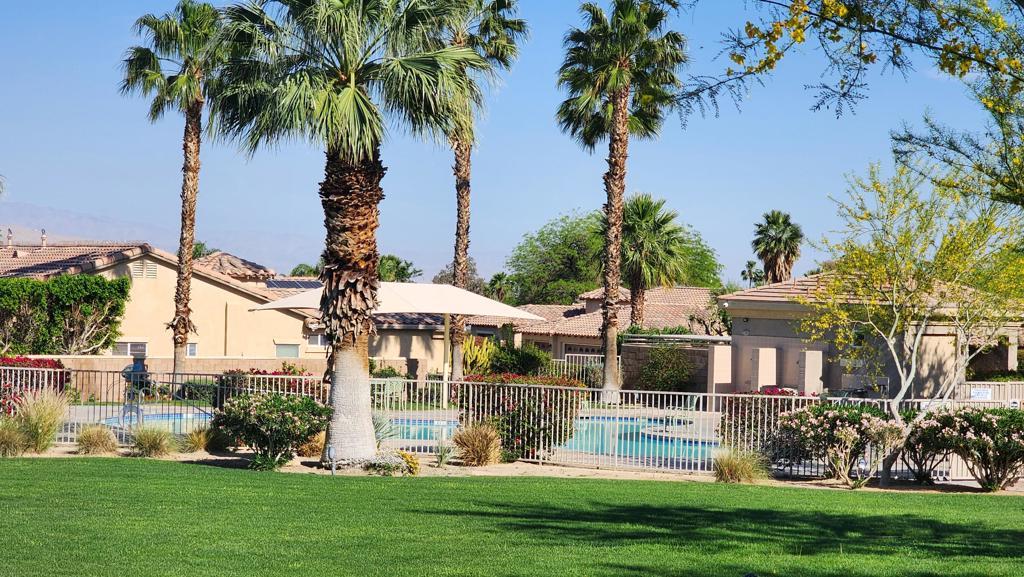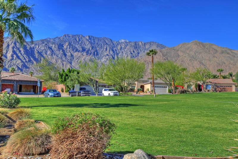 Former model home and one of the best lots in the community. It is a premium lot right across from most of the amenities provided by the HOA including Tennis courts, Pool, spa, BBQ and picnic area. This is the highly coveted Bella model with the additonal room off the kitchen and a casita with a private entrance off the gated courtyard. This came with all the premium upgrades. Owner has a completely owned and paid off solar system, 2 new air conditioning condensor units, a water purification system, an upgraded heater and remote pad for the pool, 20K in New flooring, with extra available). Home is equipped with a speaker system. The kitchen features slab granite counters, a pantry, stainless appliances, and a raised bar that opens to the great room. There is a cozy gas log fireplace in the great room. The laundr;y is a separate inside room with built in cabinets. The back yard is an entertainers delight with beautiful mountain views, lush landscaping, an outdoor kitchen, salt water, pebble tech pool, and patio cover with misters. This lot also has gated RV parking. The primary bedroom and closet is huge. There is a 2nd master that is a little smaller than the primary, Garage has added storage cabinets. HOA dues are super low and provides 3 pools and spas, tennis courts, basketball court, BBQ area, picnic tables, walking paths, dog receptacles and roving patrol. Located just off Palm Canyon close to PS Tram, dining, entertainment, and shopping..