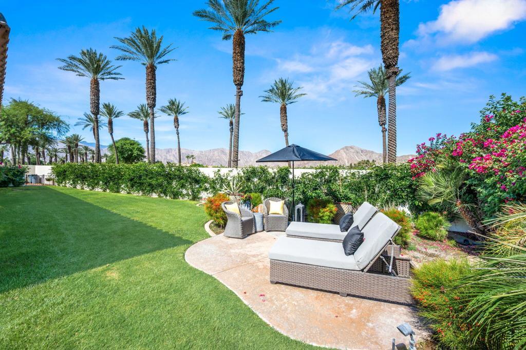 Welcome to the Prestigious Rancho La Quinta Country Club! This highly desirable, fully furnished & remodeled Palacio 1 plan is perfectly positioned on the 9th fairway of the Robert Trent Jones Jr. golf course, offering breathtaking views of the fairway & surrounding mountains. Designed with timeless Spanish elegance, this spacious 4-bedroom, 4.5-bathroom home includes a charming detached 1-bedroom, 1-bath casita with a kitchenette ideal for guests, in-laws, or private office space, all centered around a tranquil courtyard with fountains. Inside, soaring ceilings and a flowing open-concept layout create a warm yet grand feel. The light-filled family room and kitchen opens to the backyard oasis, where you'll find an entertainer's dream: a built-in BBQ, expansive patio, and a remodeled sparkling pool and spa - all with panoramic golf course and mountain views. A generous sunny side yard offers room for a bocce court, putting green, or garden. The luxurious primary suite provides direct access to the pool and backyard and boasts a charming fireplace, dual walk-in closets, plus a spa-inspired bath. Each guest bedroom includes its own ensuite bath for ultimate comfort and privacy. Just minutes from shops, fine dining, and the charm of Old Town La Quinta, this home offers the perfect blend of desert retreat and full-time residence. Rancho LQ amenities include use of the clubhouse, fitness center, tennis court, pickleball, bocce, main pool and 8 satellite pools, dog park and planned activities. HOA fees includes upgraded streaming TV service, internet, and trash pickup, frontyard maintenance, and 24-hour guard gate security. With proven seasonal rental history and priced to sell, it's a rare opportunity to own in one of La Quinta's most sought-after communities. This is resort living at its finest.