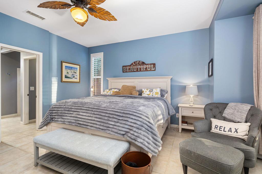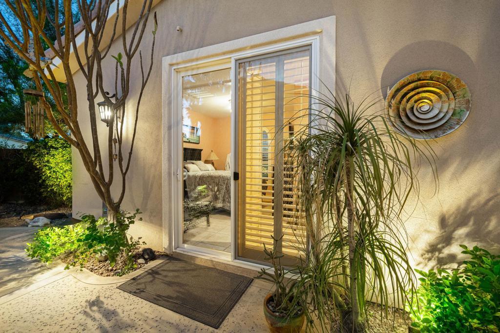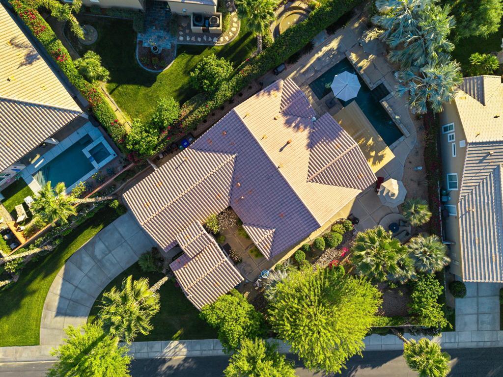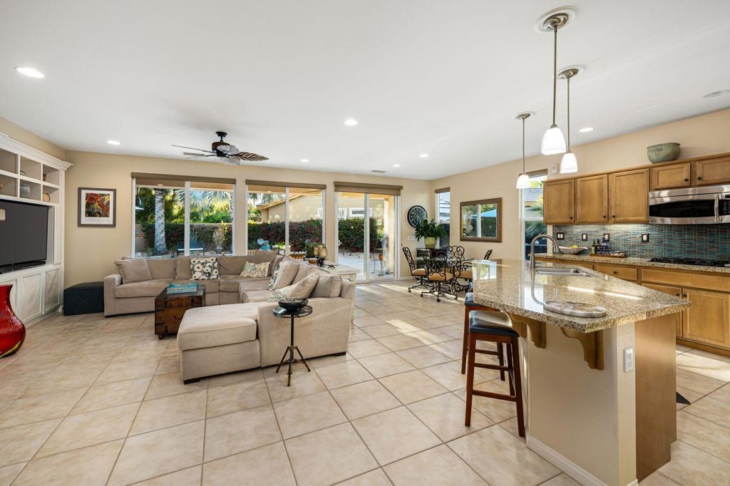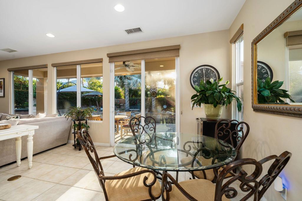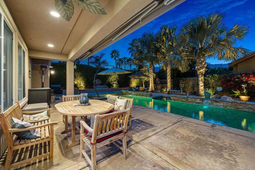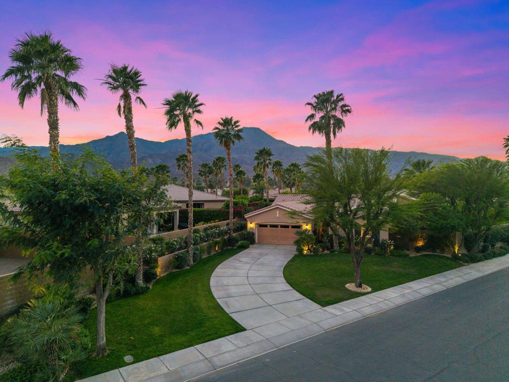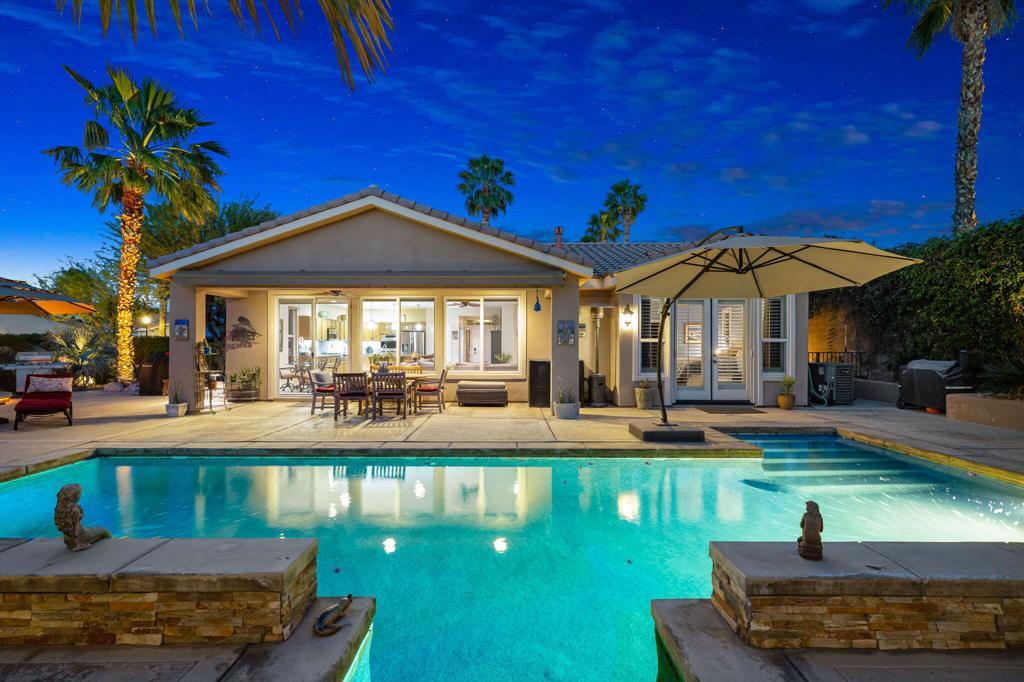This sought-after Monterey residence elevates desert living with a sprawling 14,375-sq-ft homesite, long private driveway, and unforgettable mountain and pool vistas. Inside, nearly 2,000 sq ft of airy, open-concept design welcomes you through a custom wrought-iron privacy gate into a charming front courtyard that gracefully winds toward the resort-style backyard. A detached casita--with its own cabinetry, sink, and full bath--adds incredible flexibility for guests or creative use. The den/office/optional fourth bedroom, complete with French doors to the courtyard, expands the home's versatility even further. The great room impresses with a built-in media center and elegant tile-surround fireplace, while the adjacent chef's kitchen shines with a generous prep island, bar seating, pendant lighting, stainless appliances, double ovens, slab granite, custom backsplash, gas cooktop, and walk-in pantry. Step outside to your private tropical escape featuring lush landscaping, a Pebble Tec pool with dual water descents, fire pit, awning, multiple lounging areas, and sweeping panoramic views. The primary suite offers its own French-door access to the pool, plus custom shutters and a spa-inspired bath with dual vanities, a spacious shower, and walk-in closet. A rare La Quinta gem--schedule your private tour and experience the lifestyle for yourself.