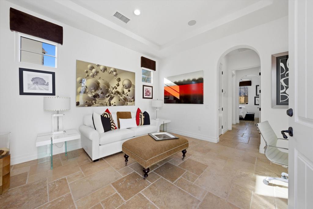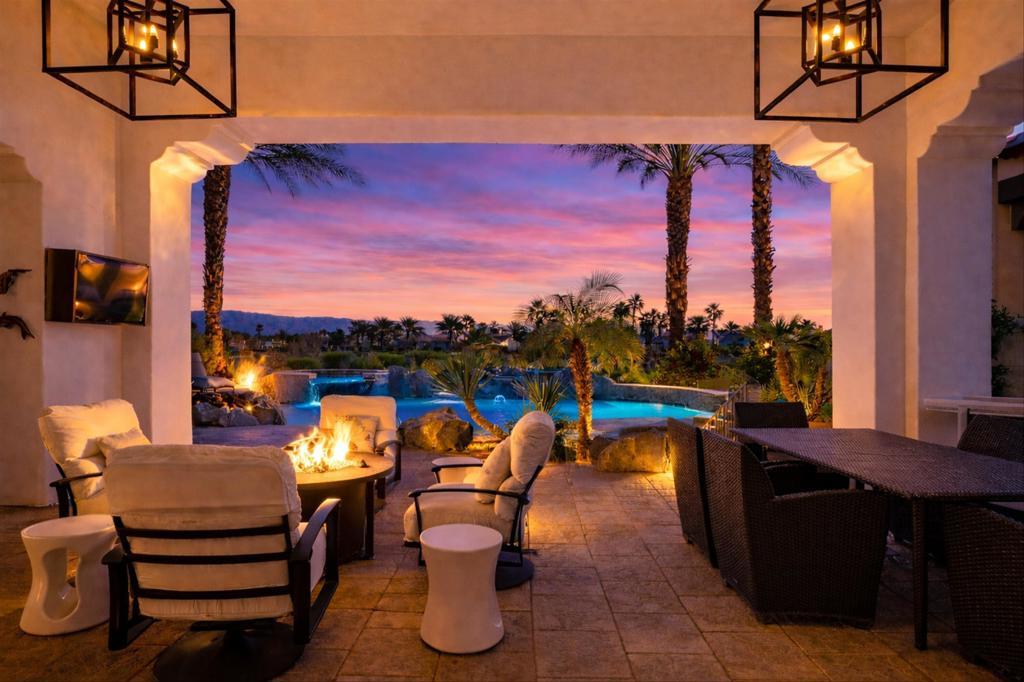Set within the exclusive Andalusia Country Club, this exceptional 3,701 sq. ft. residence offers privacy, panoramic golf course views, and refined desert living. Designed with bespoke finishes and custom upgrades, the home features travertine flooring throughout and a thoughtfully expanded layout with 3 bedrooms, 4 bathrooms, a dedicated office, and a detached casita. The private casita includes a living area with a fireplace and kitchenette, ideal for guests. A spacious courtyard with a tranquil water feature creates a welcoming entry. Clean architectural lines and curated design elements establish a sense of understated elegance, while the home's commanding position enhances both the views and the overall sense of exclusivity. Seamless indoor-outdoor integration allows for effortless entertaining, with living spaces that open to sweeping fairway vistas. The resort-style backyard is designed for both relaxation and hosting, featuring a pool with a dramatic rock feature and cascading waterfall, a spa, fire pit, built-in BBQ, and a large covered loggia--creating multiple spaces to gather, unwind, and enjoy the desert setting. Offered furnished, this residence delivers a turnkey opportunity for those seeking a highly customized, desert home. Come live the life you've always imagined!