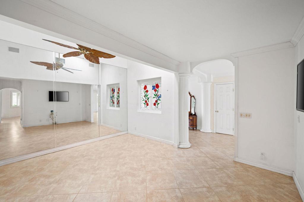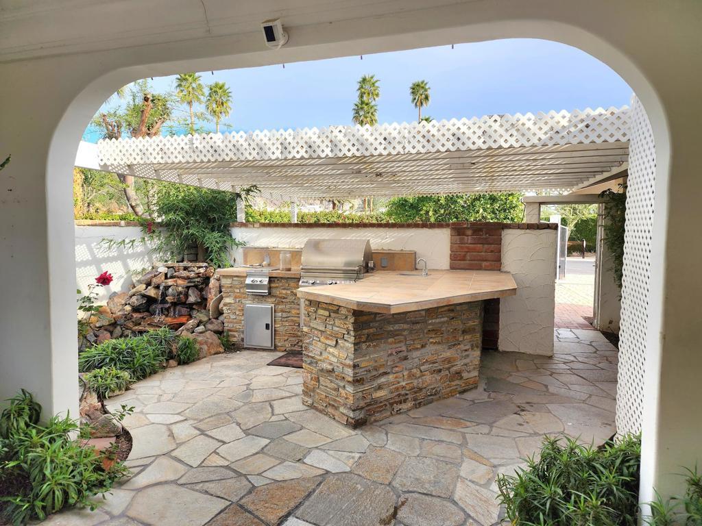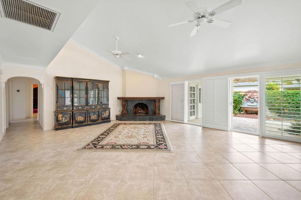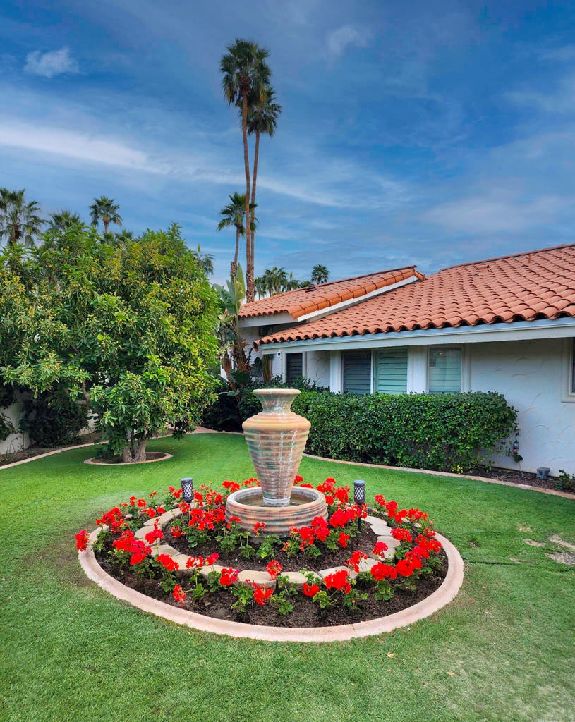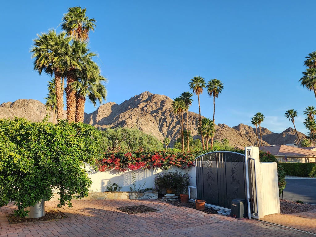 Spectacular Mediterranean home on an oversized corner lot within La Quinta Country Club Golf Estates. Panoramic Santa Rosa mountain views and desert light surround you, beautifully framed by archways on the covered patio adjacent to the sparkling pool and spa. This 3 bedroom 2.5 bathroom home comprises just over 2,900 square feet, with a gated front courtyard and putting green, and a newly motorized driveway gate for superb privacy. Features include a large primary suite with private patio, sitting area, giant walk-in closet, glass dual vanities and a jetted tub. There is a formal dining room with bay window and sliding door, and a living room with marble fireplace and direct access to the pool deck. A cozy den/media room opens to the kitchen with rich oak cabinets, built-in appliances, and a center island. The yard is filled with citrus trees and the loggia provides a covered flagstone terrace, barbecue center, dining bar, wine chiller, ceiling fans, cabinets, and a welcoming koi pond and waterfall. This lovely property showcases the feeling of indoor-outdoor living and gracious resort life in the desert. Offered as is. Great potential!