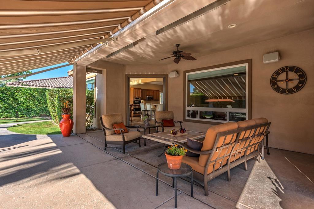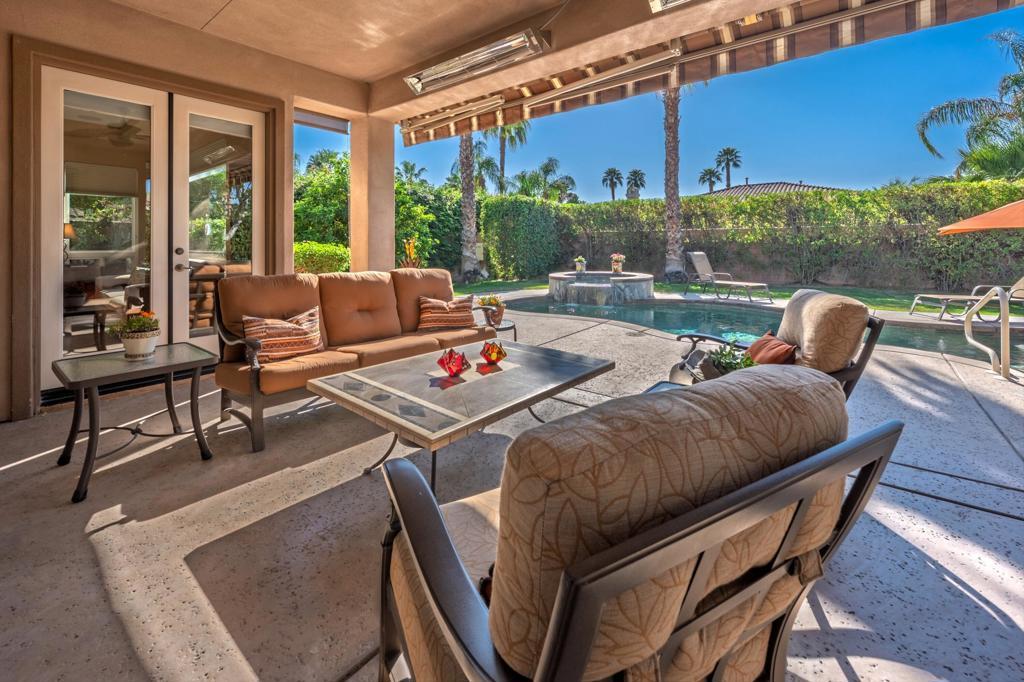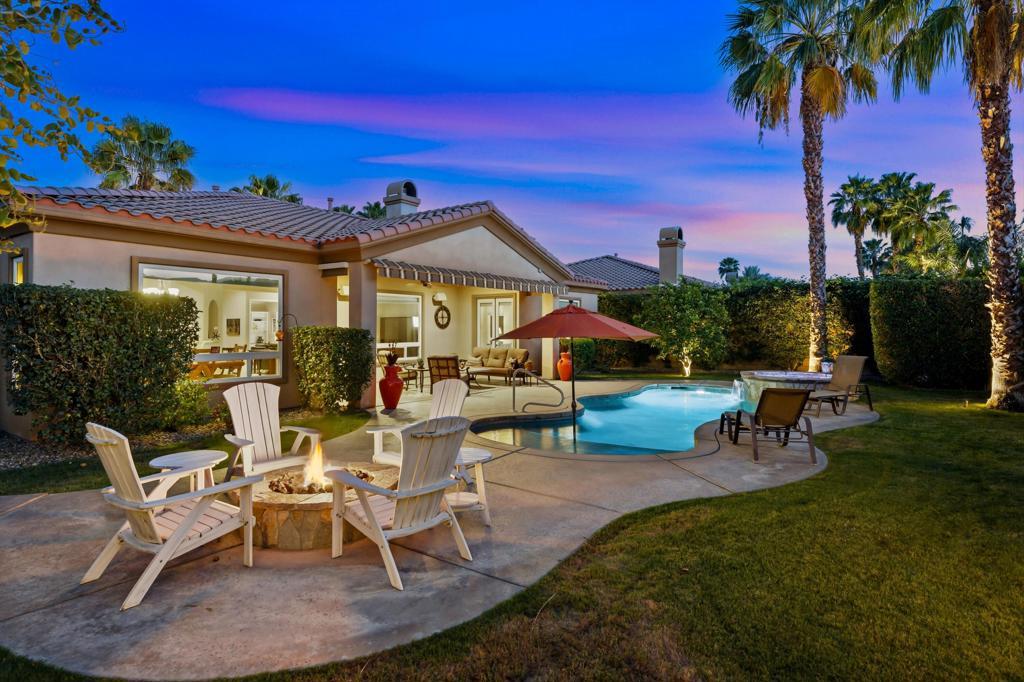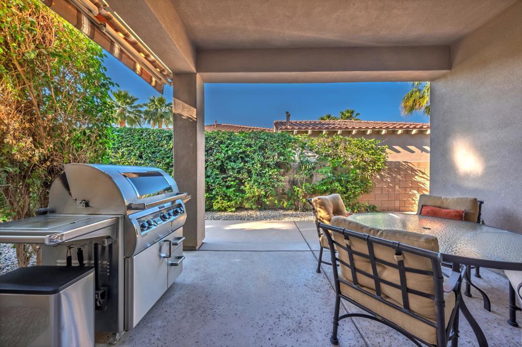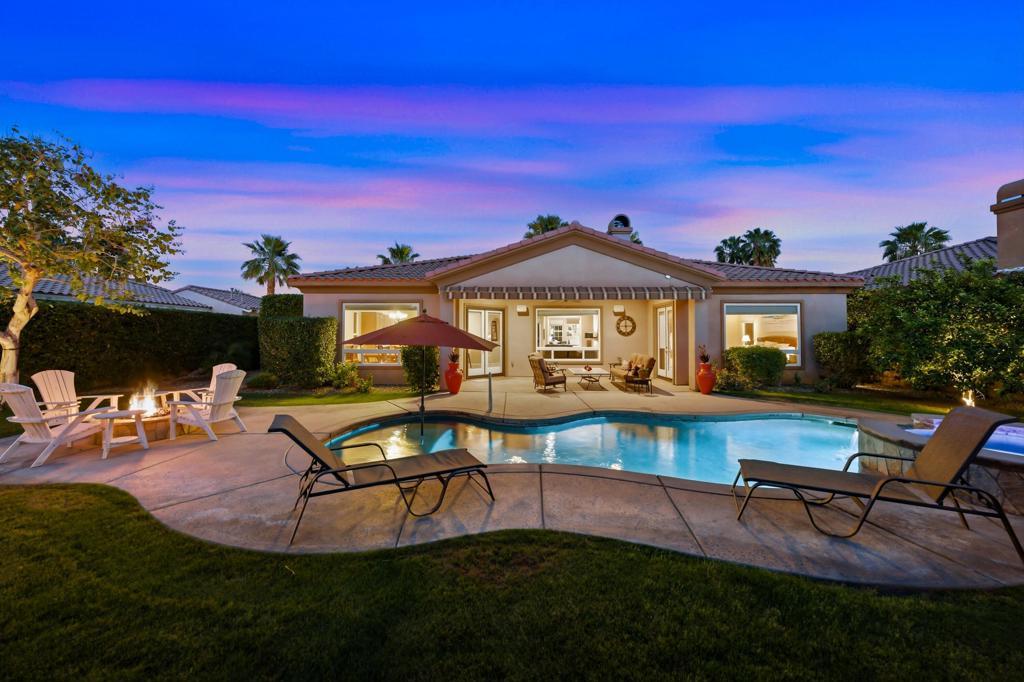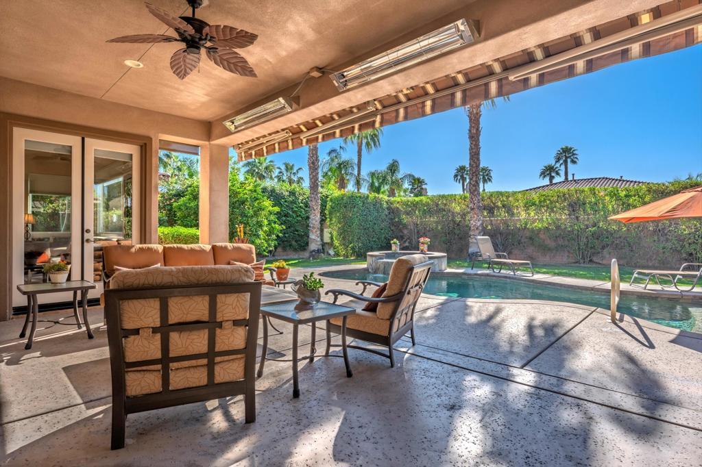 Behind the gates of Rancho Santana, this home presents a beautifully upgraded and meticulously maintained desert retreat designed for comfort, privacy, and effortless living.This thoughtfully designed residence features three spacious ensuite bedrooms, four baths, and a dedicated office/bonus room enhanced with a custom Murphy bed--perfect for accommodating guests while maintaining a functional workspace. The layout offers ideal separation between the main living areas and bedrooms, creating a natural flow suited for full-time living, a seasonal escape, or a refined retirement home.The kitchen opens seamlessly to the living space and is appointed with granite slab countertops, a center island, walk-in pantry, and stainless steel appliances, including a newer French-door refrigerator. Integrated home automation adds convenience and modern efficiency, elevating everyday living.Step outside to a fully enclosed backyard that offers exceptional privacy, backing to a tranquil trail with partial mountain views and no direct rear neighbors. Designed for both relaxation and entertaining, the outdoor space features a beautifully illuminated landscape that comes alive at night, a pool and spa with a newer high-capacity heater for fast heating, and a built-in fire pit for cozy desert evenings.The covered patio extends the living space outdoors and is equipped with two ceiling-mounted Infratech heaters, providing comfort during cooler mornings and evenings year-round.Additional upgrades enhance both function and style, including epoxy garage flooring, a California Closets storage system, keyless garage entry, video-enabled security, exterior lighting, and brand-new ceiling fans throughout. The home is offered furnished per inventory, making it truly move-in ready.Ideally located near PGA West, the Thermal Club, polo grounds, tennis, dining, and shopping, Rancho Santana offers a desirable lifestyle with low HOA dues that include gated access, neighborhood parks, bocce ball courts, a putting green, and scenic walking trails.Immaculate, private, and thoughtfully upgraded, this home stands out as a rare opportunity in La Quinta. Schedule your private showing today and experience the difference for yourself.