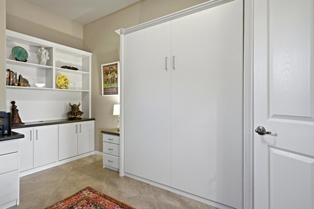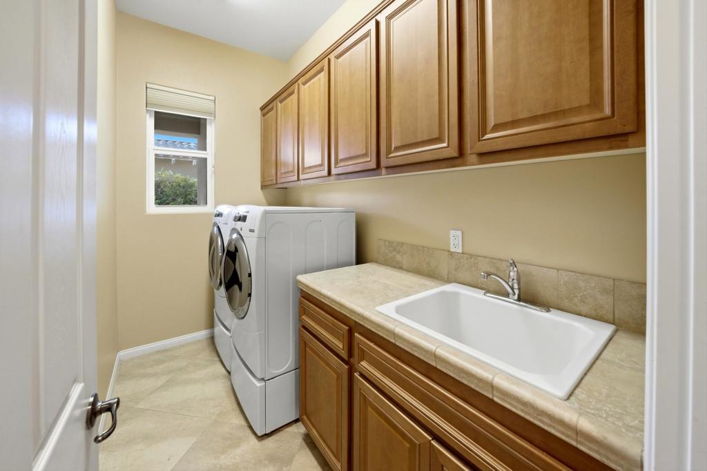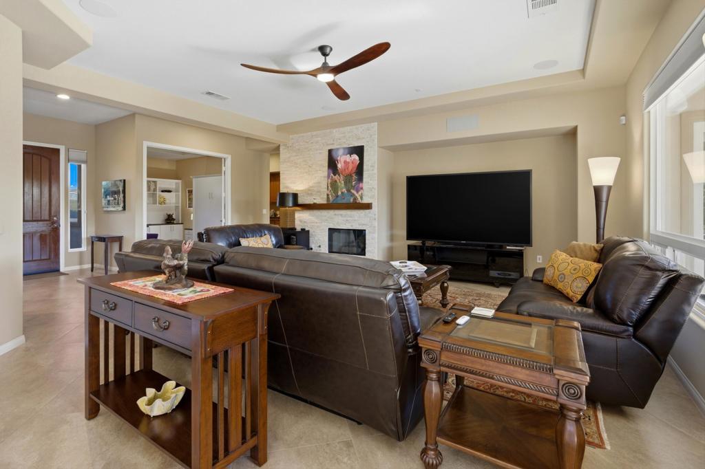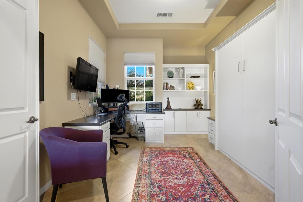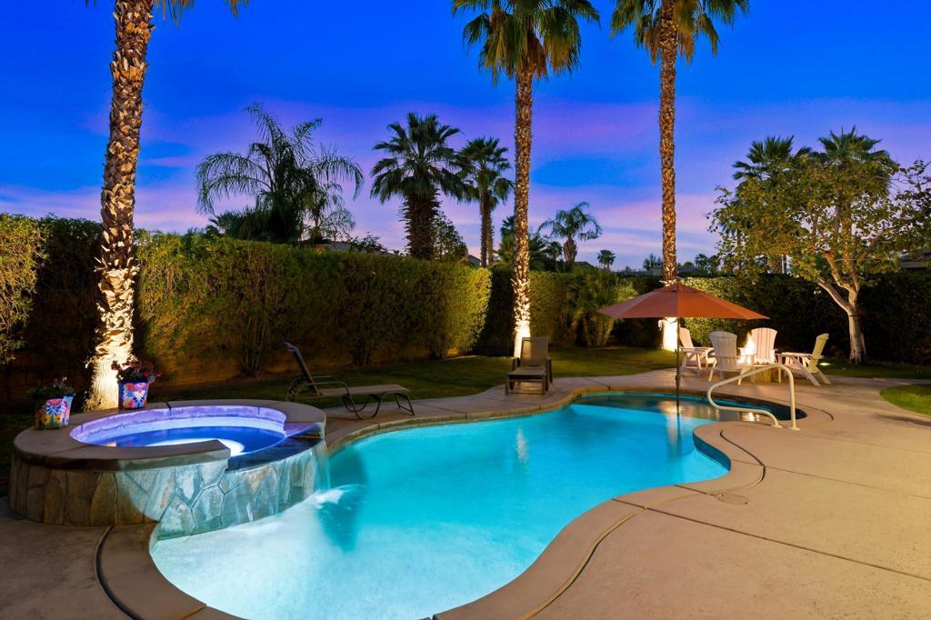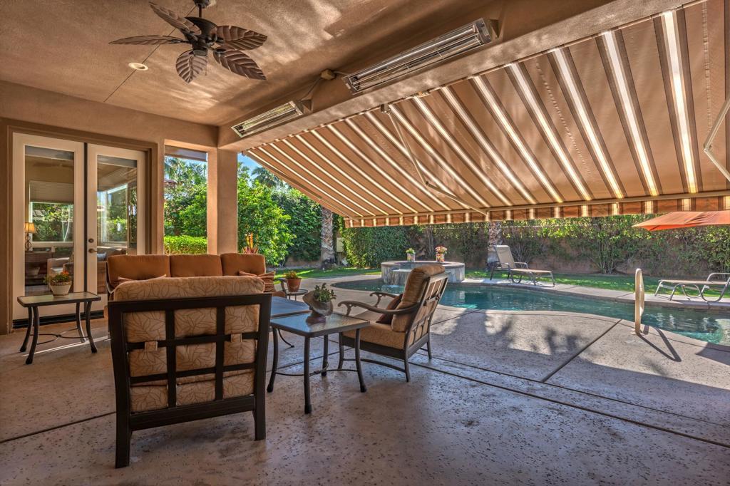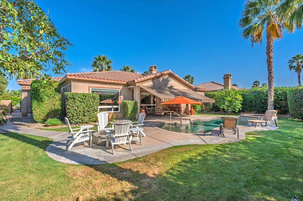 Behind the gates of Rancho Santana, this home presents a beautifully upgraded and meticulously maintained desert retreat designed for comfort, privacy, and effortless living.This thoughtfully designed residence features three spacious ensuite bedrooms, four baths, and a dedicated office/bonus room enhanced with a custom Murphy bed--perfect for accommodating guests while maintaining a functional workspace. The layout offers ideal separation between the main living areas and bedrooms, creating a natural flow suited for full-time living, a seasonal escape, or a refined retirement home.The kitchen opens seamlessly to the living space and is appointed with granite slab countertops, a center island, walk-in pantry, and stainless steel appliances, including a newer French-door refrigerator. Integrated home automation adds convenience and modern efficiency, elevating everyday living.Step outside to a fully enclosed backyard that offers exceptional privacy, backing to a tranquil trail with partial mountain views and no direct rear neighbors. Designed for both relaxation and entertaining, the outdoor space features a beautifully illuminated landscape that comes alive at night, a pool and spa with a newer high-capacity heater for fast heating, and a built-in fire pit for cozy desert evenings.The covered patio extends the living space outdoors and is equipped with two ceiling-mounted Infratech heaters, providing comfort during cooler mornings and evenings year-round.Additional upgrades enhance both function and style, including epoxy garage flooring, a California Closets storage system, keyless garage entry, video-enabled security, exterior lighting, and brand-new ceiling fans throughout. The home is offered furnished per inventory, making it truly move-in ready.Ideally located near PGA West, the Thermal Club, polo grounds, tennis, dining, and shopping, Rancho Santana offers a desirable lifestyle with low HOA dues that include gated access, neighborhood parks, bocce ball courts, a putting green, and scenic walking trails.Immaculate, private, and thoughtfully upgraded, this home stands out as a rare opportunity in La Quinta. Schedule your private showing today and experience the difference for yourself.