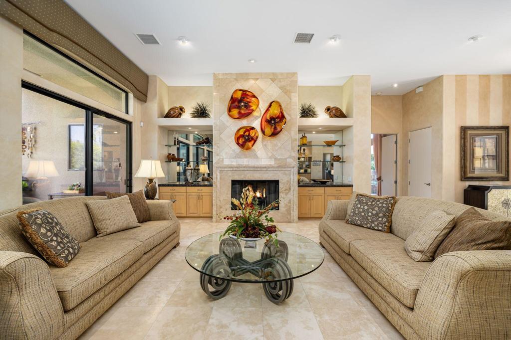 This desert contemporary residence captures the essence of refined resort-style design against a backdrop of sweeping south and west-facing mountain vistas. It is a private sanctuary and an architectural statement--where walls of glass dissolve boundaries and the landscape become part of the interior experience. The grounds create a series of outdoor spaces, lush with vibrant flowering gardens, mature palms, and fruit trees and an expanse of green lawn. Thoughtfully designed with three oversized electronic awnings creating shaded retreats, while the outdoor kitchen and bar invite effortless entertainment beneath open skies. In addition, the focal point, a striking saltwater pool and elevated spa are accented by a sheer descent water feature, amidst the sweeping mountain views. Inside, soaring 12-foot ceilings and an expansive great room establish a sense of volume and calm. Natural light pours in from every direction, animating the interiors and reinforcing the home's connection to its surroundings. The covered patio extends the living space, offering a fluid transition between indoors and out. The primary suite is generous in scale and quietly luxurious, featuring a spa-inspired bath with dual showers, a soaking tub, dual walk-in closets, and separate water closets, one appointed with a bidet. Two additional ensuite bedrooms open to private patios, while a detached-style casita with its own entrance, kitchenette, and bath provides an elegant accommodation for guests, all with captivating mountain views. Completing the residence is a three-car garage finished with epoxy flooring, climate control, and abundant storage. Set within a prestigious 24-hour guard-gated community, this home is an elevated expression of desert living. Call for your private showing today!