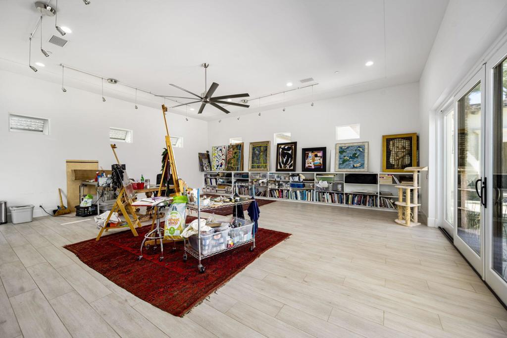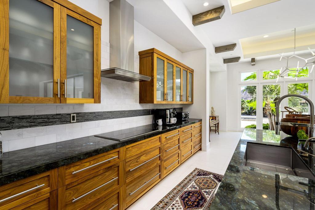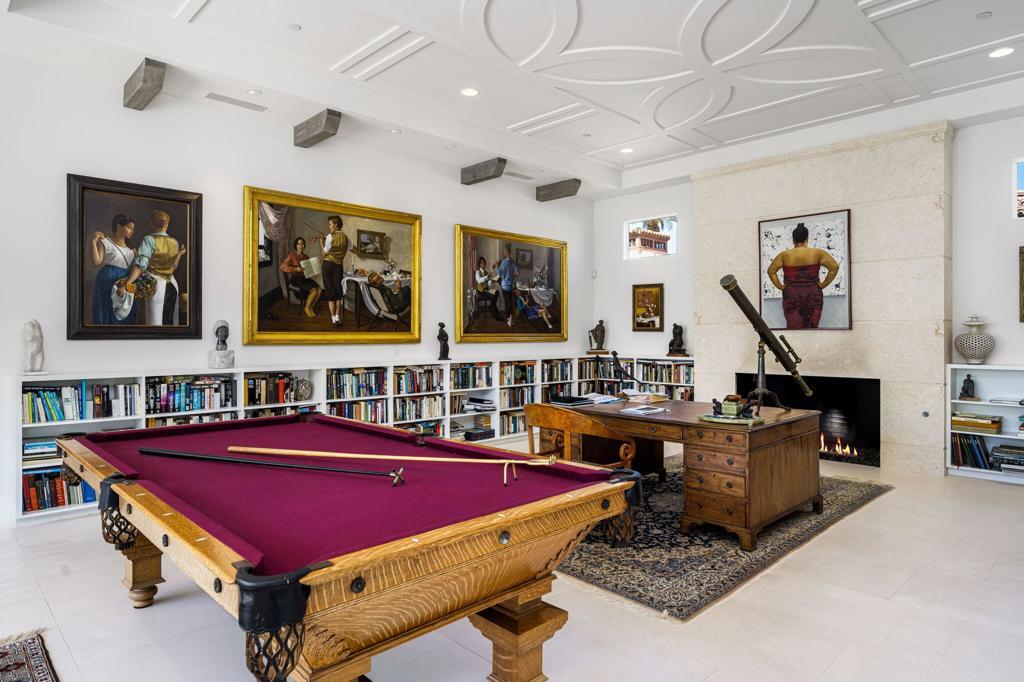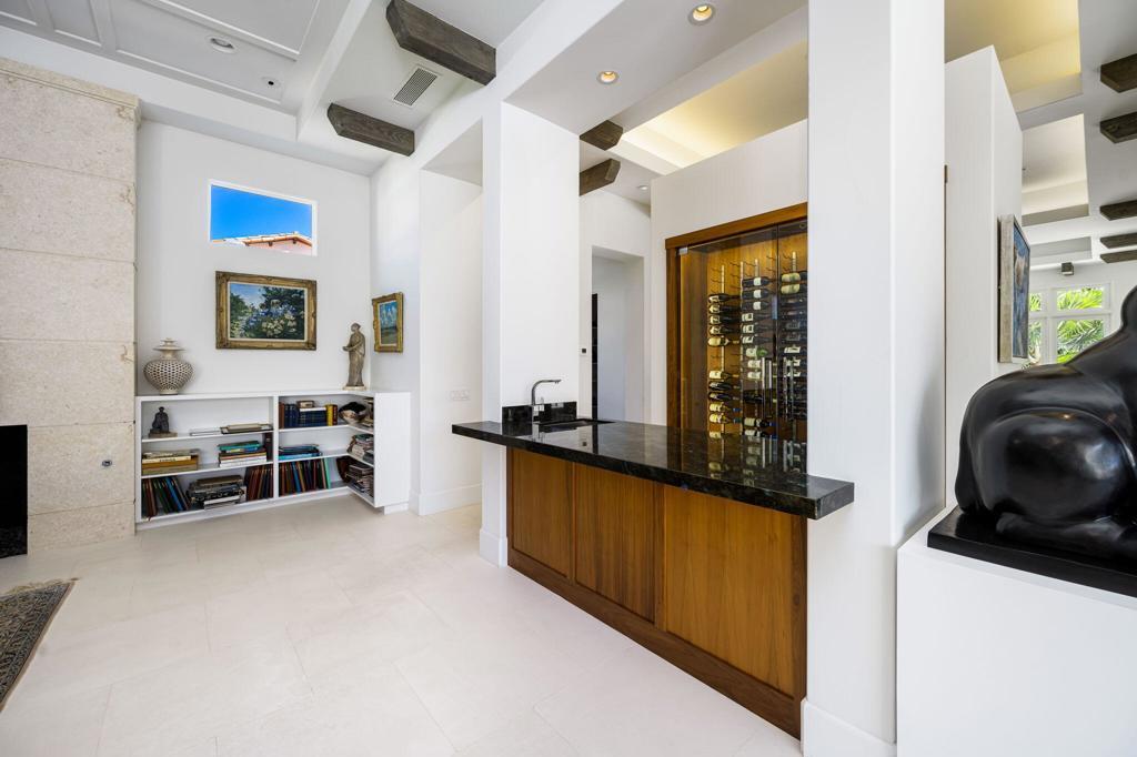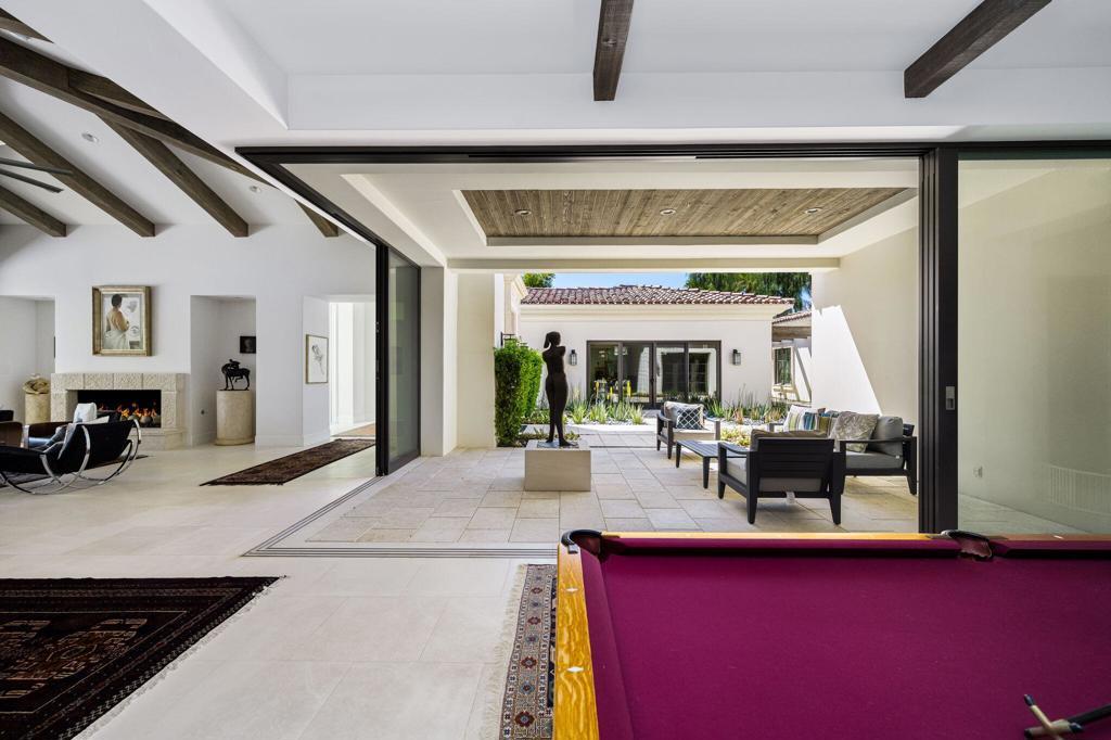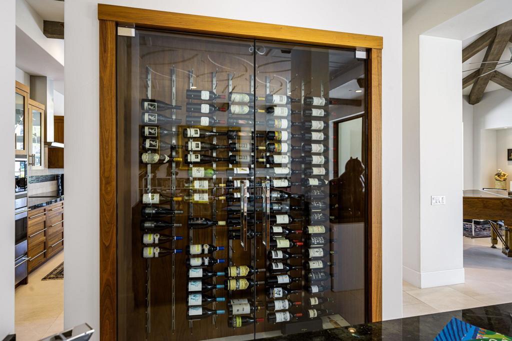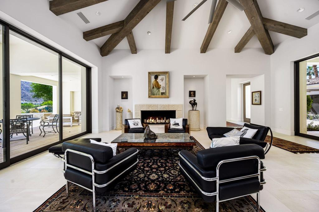 Situated on a sweeping wide lot perched above the 8th hole of Tradition Golf Club, this exceptional residence captures panoramic mountain and lake views from nearly every angle. Designed to impress, the home offers 4 bedrooms plus bonus / theatre room, with expansive indoor-outdoor living spaces ideal for both relaxation and entertaining. A private courtyard welcomes you with tranquil fountains, sculptural elements, and beautifully curated Zen rock and succulent gardens. Enter through a dramatic pivot door and immediately experience the breathtaking rear vistas framed by walls of glass. The great room showcases wood-beamed ceilings, a striking stone fireplace, and pocketing sliding doors that seamlessly open to both the front courtyard and rear patio, creating a true indoor-outdoor lifestyle. The chef's kitchen is thoughtfully designed with a large island, light wood cabinetry, stainless steel appliances, a butler's pantry, walk-in pantry, and a charming breakfast room. An expansive Game Room / Library features custom built-ins, a wet bar with wine refrigeration, and a comfortable sitting area--perfect for gathering with family and friends. The luxurious primary suite is a private retreat, complete with a floor-to-ceiling stone fireplace, dual walk-in closets, spa-inspired bath with soaking tub, gigantic two-person walk-in shower, dual vanities, dual water closets, and an outdoor shower. A spacious art studio with en-suite bath offers flexibility and can easily be converted into two additional bedrooms. Guests will appreciate the detached two-bedroom casita with its own living room, providing comfort and privacy. Additional features include a 4 car garage, and solar panels for energy efficiency. Offered partially furnished per inventory.