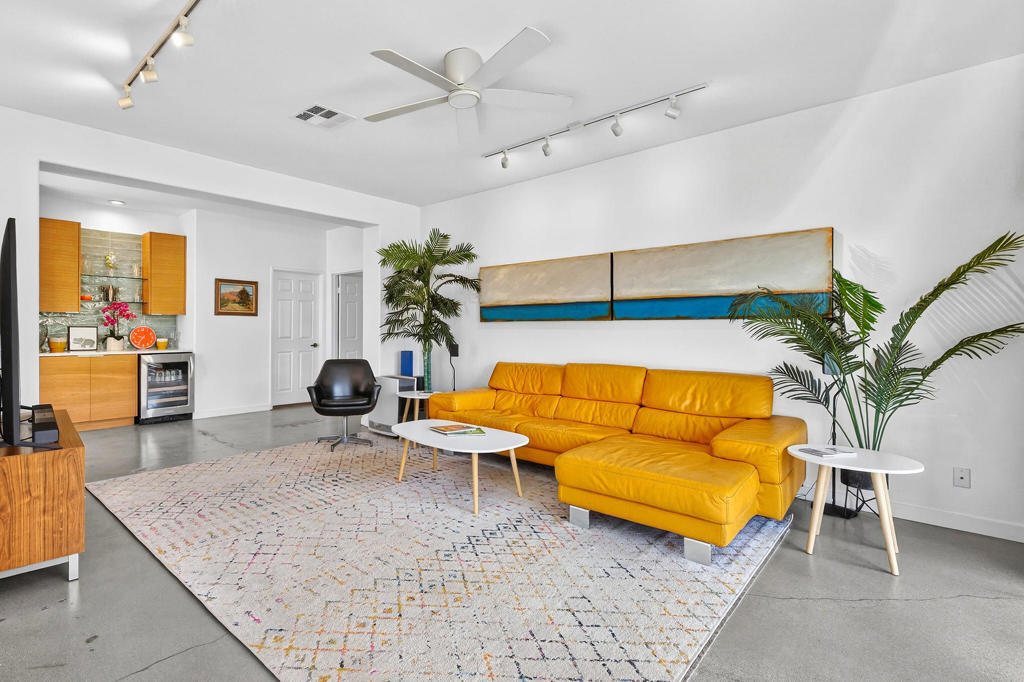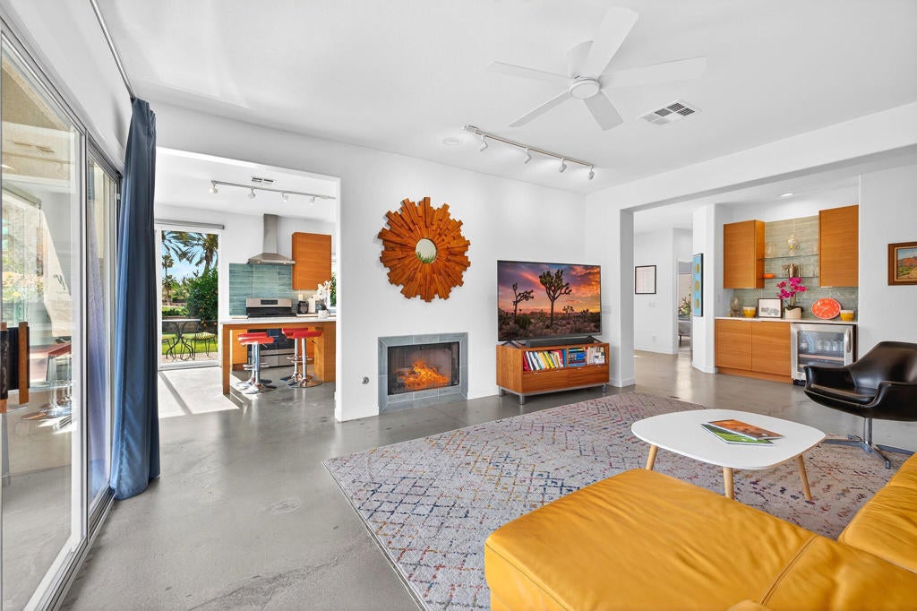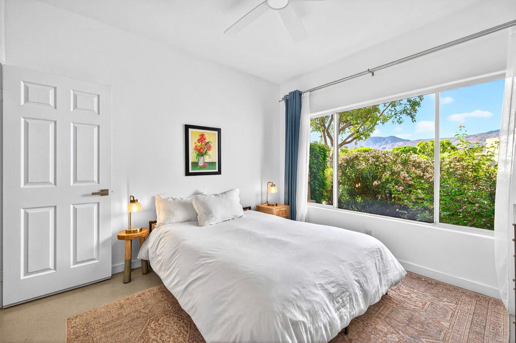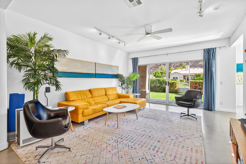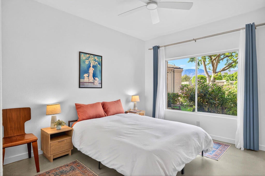 Set within the guard-gated community of Laguna de la Paz, this beautifully positioned, Fully Furnished Turn Key 3 bedroom, 2 bathroom mid-century modern decorated home offers spectacular lake and mountain views. Clean lines, a desirable floor plan, and concrete floors throughout give the home a stylish, modern feel while still feeling warm and inviting. Designed for both everyday living and relaxed entertaining, the interior spaces flow comfortably and take full advantage of the surrounding scenery. Whether enjoying a quiet morning coffee or an evening with friends, the setting captures the best of desert living. Laguna de la Paz is known for its resort-style amenities and beautifully maintained grounds. The HOA covers the roof, exterior stucco, exterior paint, and landscaping outside your gates, offering ease of ownership and added peace of mind. Residents enjoy access to 15 pools, 16 spas, a 5-acre lake, pickleball courts, tennis courts, a fitness center, billiards room, and clubhouse. This is a wonderful opportunity to own a distinctive home in one of La Quinta's most sought-after communities, where mountain views, lake views, and exceptional amenities come together in a truly special setting. Professional Photos 3/29