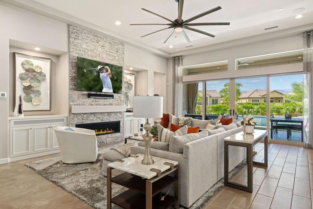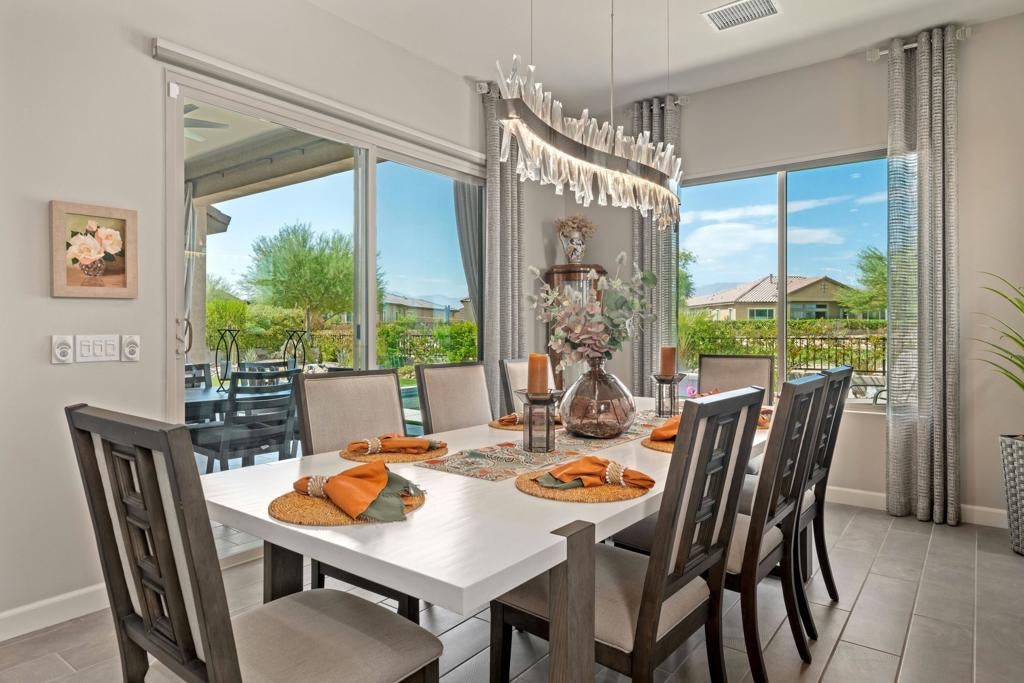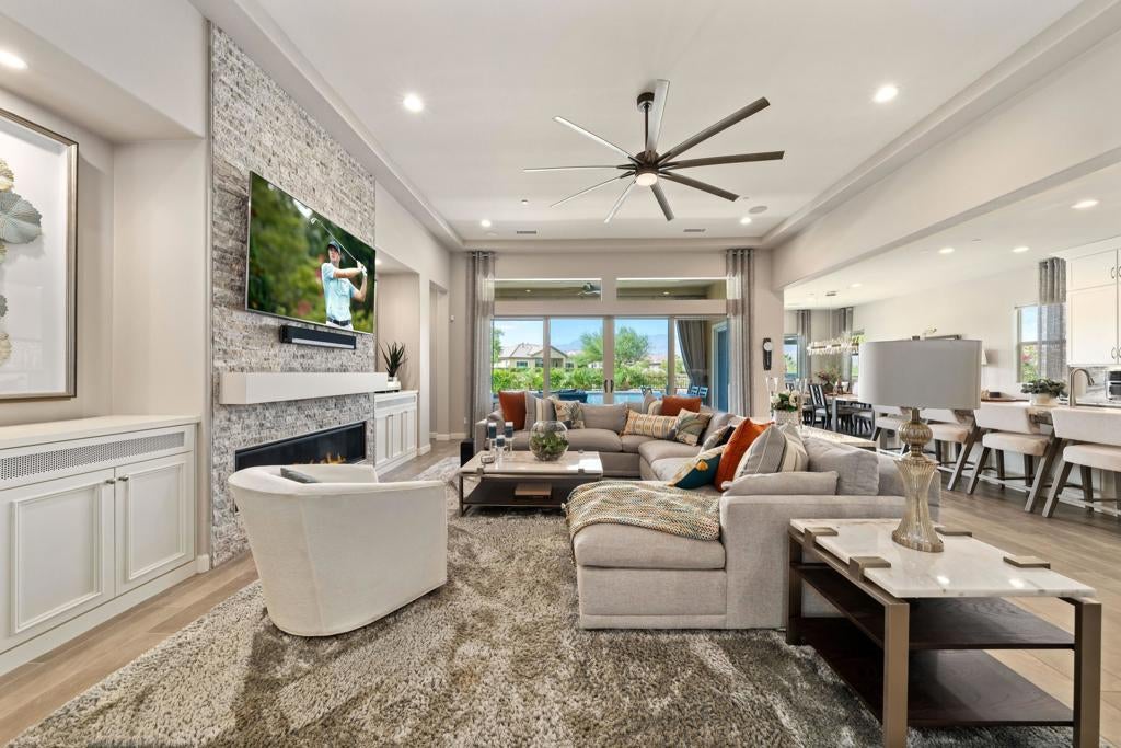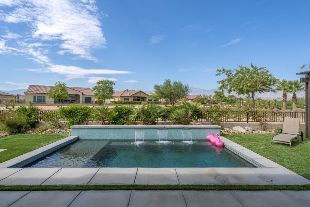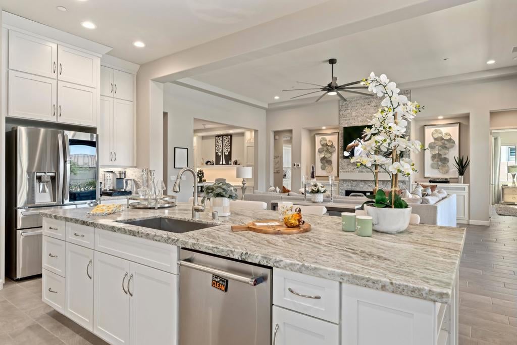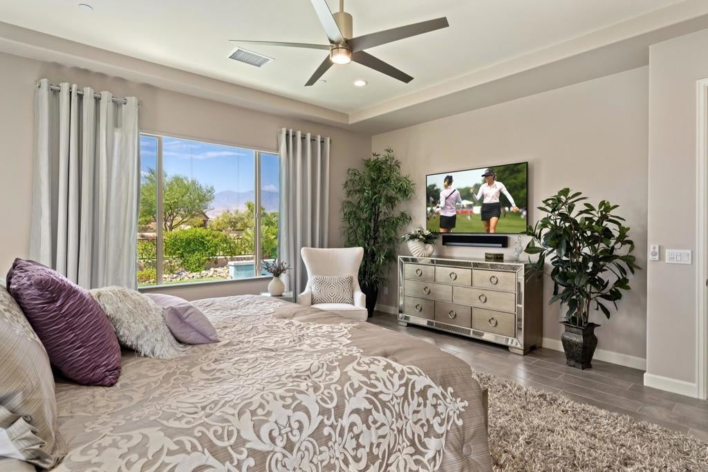 Welcome to 140 Cabernet, an impressively upgraded Voyage plan -- the largest model offered in the popular 55+ Del Webb community. This three-bedroom, four-bath home, with its seamless indoor-outdoor living spaces, sits on a premium interior lot with sweeping south-to-west mountain views -- a gateway to classic desert moments.Step inside, and the attention to detail is clear. The owners have invested over $320,000 in builder upgrades alone, plus the addition of a custom private pool and so much more. You'll also enjoy owned Tesla solar, professional landscaping with turf lawn, and a three-space garage that includes a dedicated golf cart bay. A secured, gated front courtyard welcomes you in.Inside, plank tile flooring flows throughout the home. A striking ledgestone feature wall greets you at the entry, while a matching stone fireplace surround anchors the great room. An open flex space with custom built-ins located just off the entry makes an excellent office or additional living area. The kitchen is a standout, featuring custom ceiling-height cabinetry, a walk-in pantry, exquisite stone countertops, stainless steel appliances, and a gas range -- all bathed in natural light and open to the great room.The elegant primary suite features two walk-in closets with custom built-ins and an en-suite bath with an expansive frameless glass shower. The laundry room is thoughtfully designed with a utility sink and ample storage.Outdoors, the home truly shines. Double sliding doors open to a spacious loggia with the flooring transitioning seamlessly from the main interior living space, a stone accent wall with mounted television, and ample room for al fresco dining and lounging. Just beyond lies a private pool with a soothing water ledge feature, a covered built-in outdoor barbecue with seating area, and a side-yard putting green, making this backyard a prime spot for gatherings. With low HOA dues, residents of Del Webb enjoy access to a manned gate, a world-class clubhouse, two resort-style pools and spas, a fitness center, pickleball, tennis, walking trails, and a wide variety of social and recreational activities. This is a special property that deserves to be seen in person. A detailed upgrade list is available upon request, and furnishings are negotiable. Make your appointment today to experience everything 140 Cabernet has to offer.
