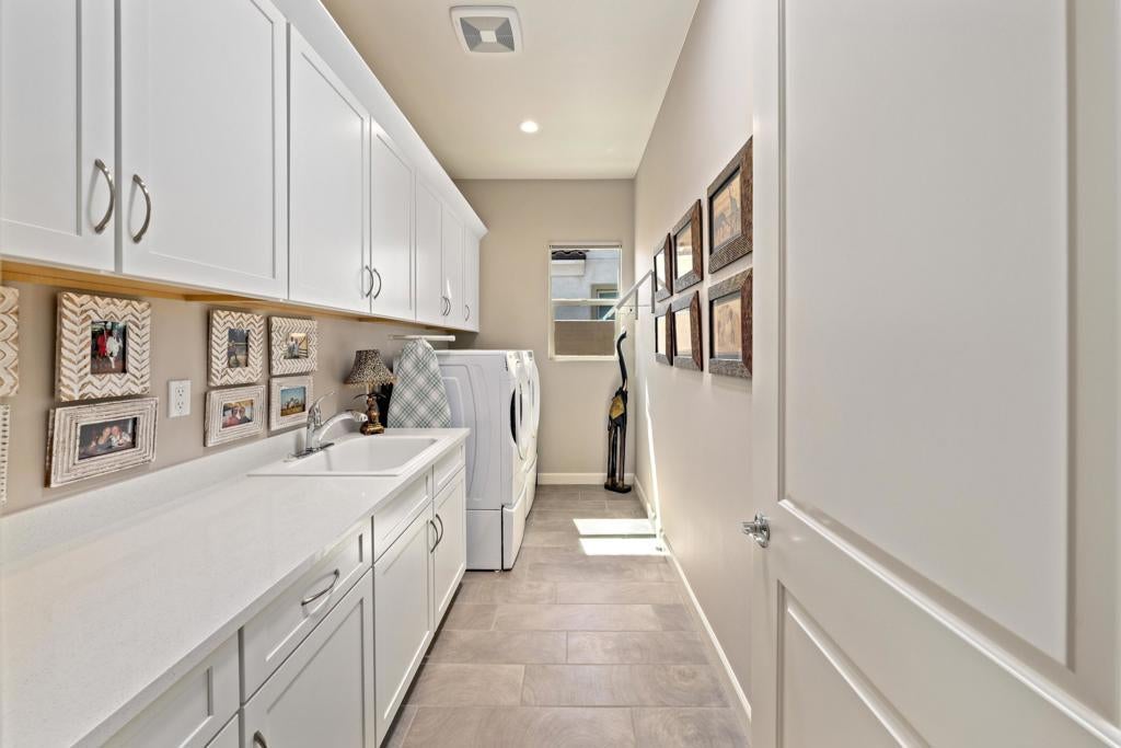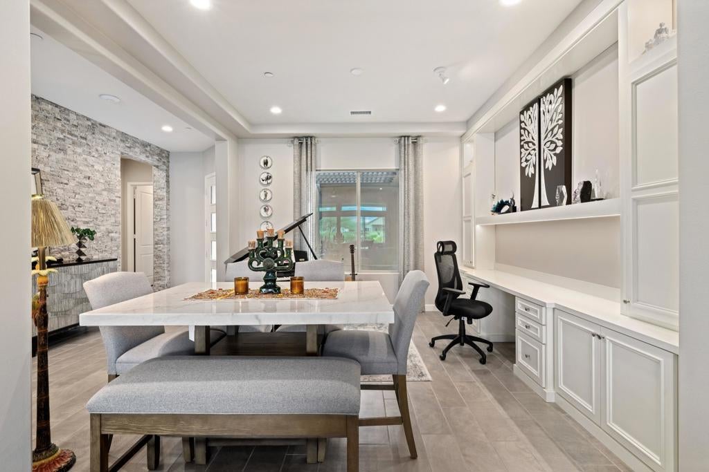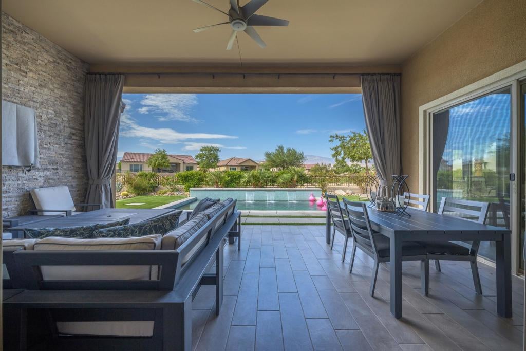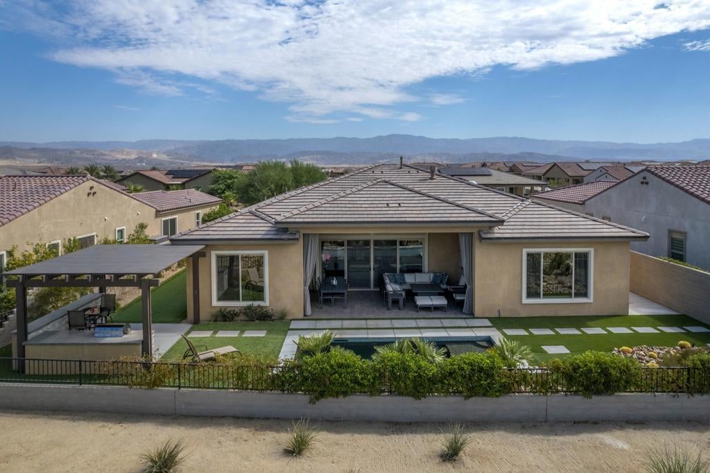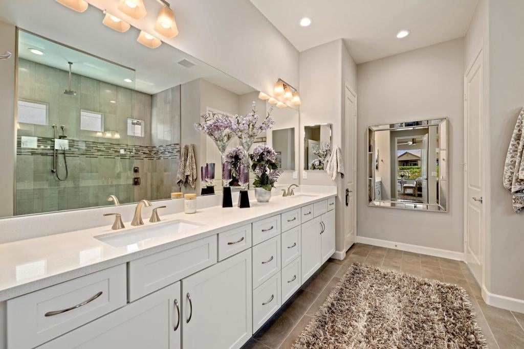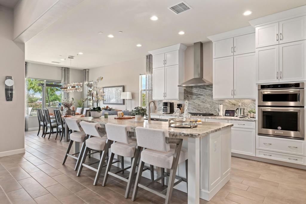 Welcome to 140 Cabernet, an impressively upgraded Voyage plan -- the largest model offered in the popular 55+ Del Webb community. This three-bedroom, four-bath home, with its seamless indoor-outdoor living spaces, sits on a premium interior lot with sweeping south-to-west mountain views -- a gateway to classic desert moments.Step inside, and the attention to detail is clear. The owners have invested over $320,000 in builder upgrades alone, plus the addition of a custom private pool and so much more. You'll also enjoy owned Tesla solar, professional landscaping with turf lawn, and a three-space garage that includes a dedicated golf cart bay. A secured, gated front courtyard welcomes you in.Inside, plank tile flooring flows throughout the home. A striking ledgestone feature wall greets you at the entry, while a matching stone fireplace surround anchors the great room. An open flex space with custom built-ins located just off the entry makes an excellent office or additional living area. The kitchen is a standout, featuring custom ceiling-height cabinetry, a walk-in pantry, exquisite stone countertops, stainless steel appliances, and a gas range -- all bathed in natural light and open to the great room.The elegant primary suite features two walk-in closets with custom built-ins and an en-suite bath with an expansive frameless glass shower. The laundry room is thoughtfully designed with a utility sink and ample storage.Outdoors, the home truly shines. Double sliding doors open to a spacious loggia with the flooring transitioning seamlessly from the main interior living space, a stone accent wall with mounted television, and ample room for al fresco dining and lounging. Just beyond lies a private pool with a soothing water ledge feature, a covered built-in outdoor barbecue with seating area, and a side-yard putting green, making this backyard a prime spot for gatherings. With low HOA dues, residents of Del Webb enjoy access to a manned gate, a world-class clubhouse, two resort-style pools and spas, a fitness center, pickleball, tennis, walking trails, and a wide variety of social and recreational activities. This is a special property that deserves to be seen in person. A detailed upgrade list is available upon request, and furnishings are negotiable. Make your appointment today to experience everything 140 Cabernet has to offer.