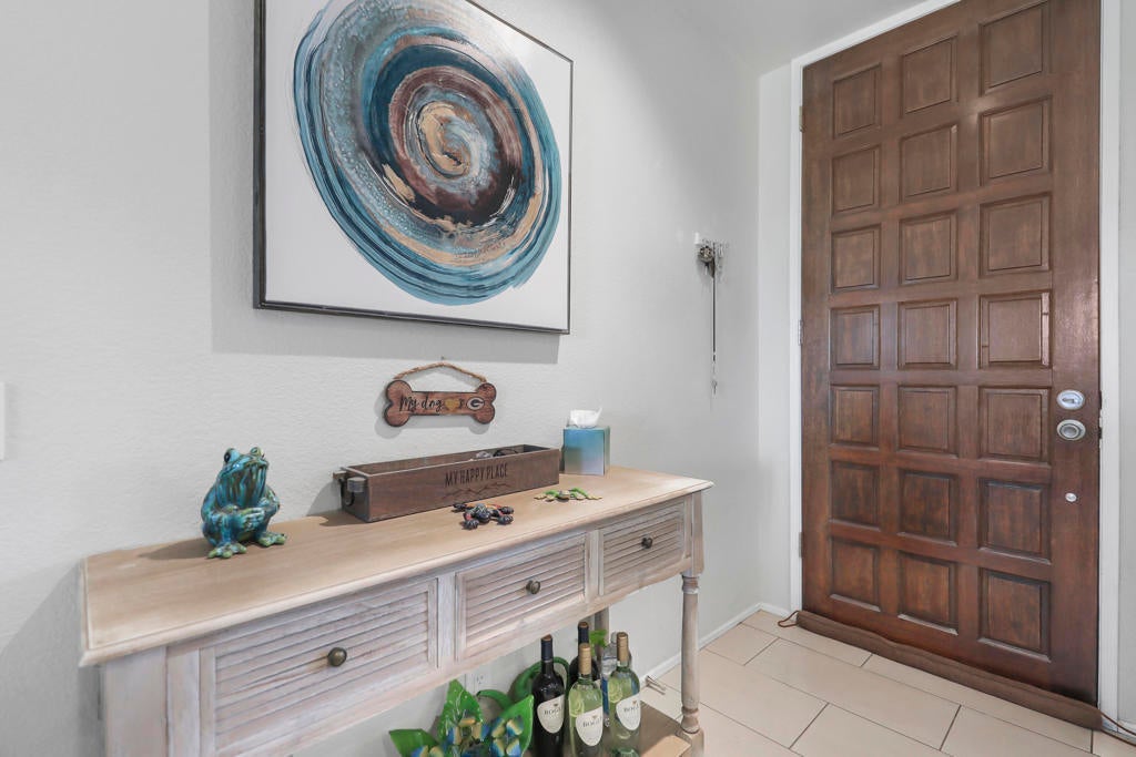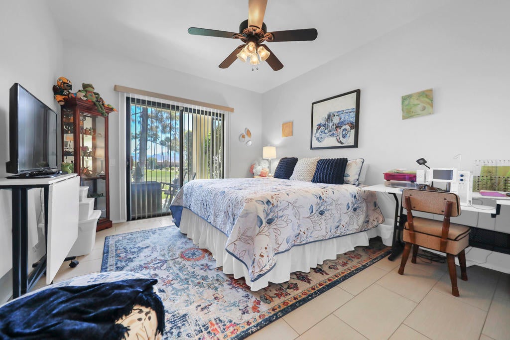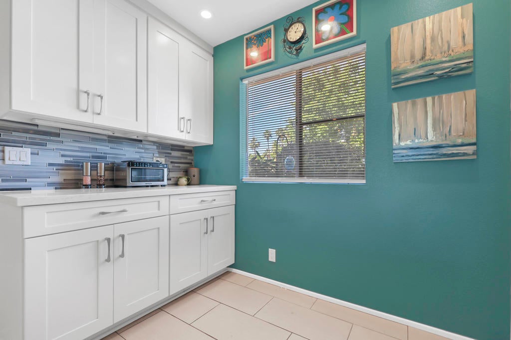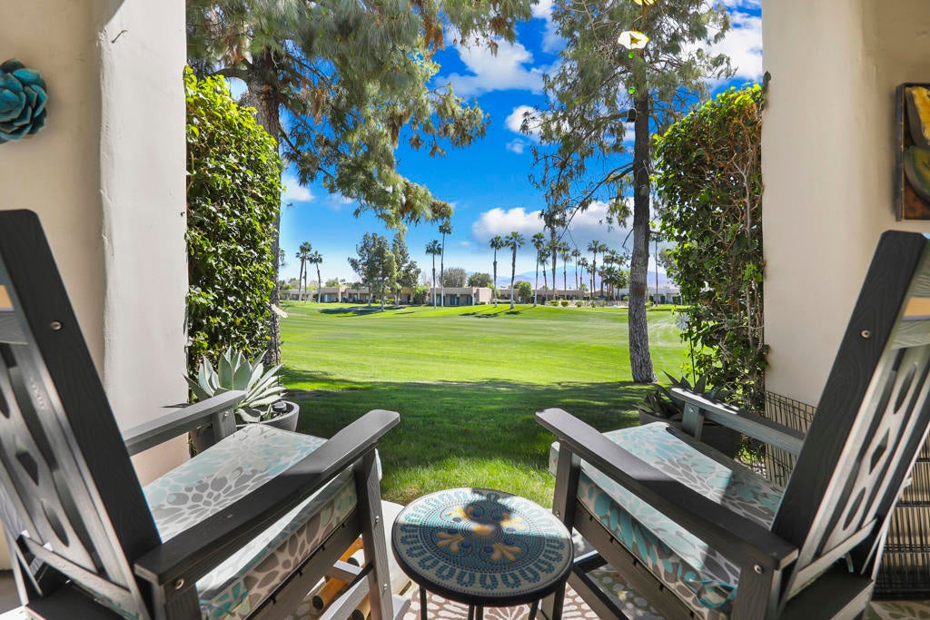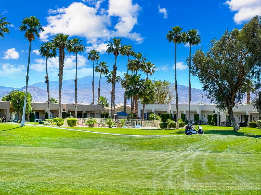 This beautifully updated condo features a clean, contemporary interior with tile flooring throughout and fresh paint for a cohesive look. The kitchen offers an open layout created by removing a dividing column, with updated cabinetry, pull-out storage, upgraded surfaces, and a built-in wine refrigerator, complemented by newer appliances and a modern ceiling fan in the main living area. Enhanced daily living includes a reverse osmosis system, updated primary bath counters, new fixtures, faucets, and toilets throughout, plus a new washer and dryer. The property includes a one-car garage with a retractable door and a soft water connection already in place. Enjoy privacy and quiet from a vantage overlooking Lago 5 greens not along the cart path, in a cul-de-sac setting with nearby access to multiple community pools, including a saltwater option. Monthly HOA dues provide value, covering television and high-speed internet, exterior maintenance to the entry, outdoor pest service upon request, and water service beyond the interior, along with a staffed 24-hour entrance, fitness center, and a range of recreational amenities. Ownership also includes preferred access and discounted rates at a well-regarded 27-hole championship golf course with no initiation fee. Located in a peaceful area and just minutes from Palm Springs, residents enjoy easy access to dining, shopping, entertainment, outdoor activities, cultural attractions and much more.