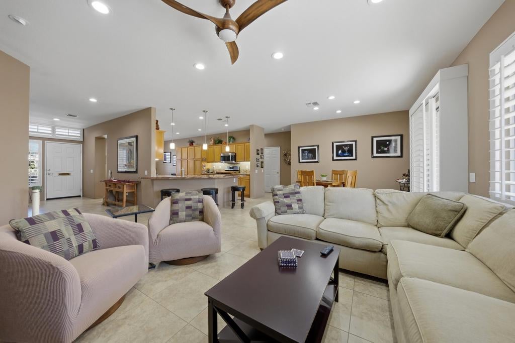 Sun City Palm Desert - Montego with Casita. This popular greatroom home offers the ideal blend of comfort, privacy, and flexibility with 3 bedrooms and 2 bathrooms in the main residence plus a detached 1 bedroom, 1 bathroom casita--perfect for guests or extended stays. Conveniently located just a short distance to both the Sunset View and Mountain View clubhouses, the home also enjoys an elevated east-facing rear yard that sits above neighboring homes, providing an open, airy, and private setting.Exceptional curb appeal begins with a gated front courtyard and desert landscaping. Inside, the home is beautifully appointed with tile flooring, shutters, and recessed lighting throughout. The greatroom features an electric fireplace and sliding glass doors that open to the rear patio, creating seamless indoor-outdoor living. The updated kitchen is designed for both style and function with slab granite counters, stainless steel appliances, under-cabinet lighting, pullout shelving, and a breakfast bar accented by pendant lighting.The spacious primary suite offers direct patio access and a large walk-in closet, while the ensuite bathroom includes a custom tile shower with a rimless glass enclosure and dual sink vanity. On the opposite side of the home, the guest wing provides two bedrooms and a bathroom with a quartz-topped vanity and a shower/tub with rain glass doors. The detached casita features its own bathroom with a stall shower and textured glass enclosure.Additional highlights include a laundry room with built-in storage and an extended two-car garage with additional built-in cabinetry. This well-maintained home is a perfect desert retreat with space for hosting and everyday living.