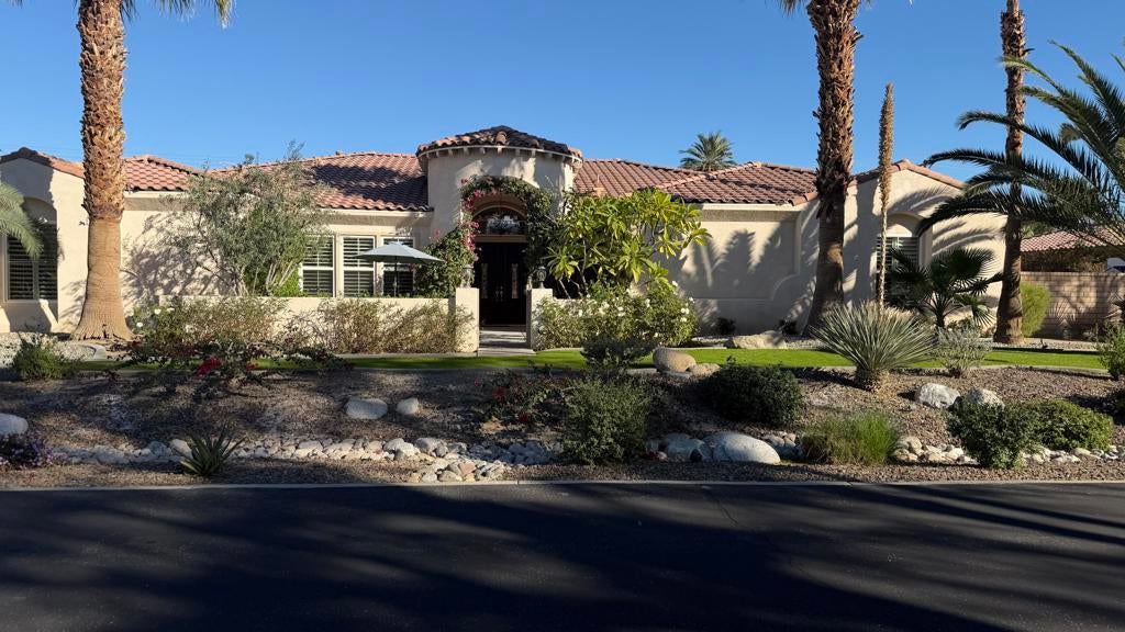 Major Price Drop! Seller is Super Motivated! Located in the gated community of Desert River Estates, this furnished 4 bedroom, 4 bath single-level home offers approx. 3,468 sq ft of living space on a rare 21,780 sq ft (approx. 1/2 acre) lot with exceptional privacy and no homes behind you. Ideally positioned between Indio and La Quinta and located within about a mile of the Coachella and Stagecoach festival grounds, the home blends comfort, scale and location in a way that works beautifully as a primary residence, desert retreat or entertainer's getaway. The east-facing orientation minimizes afternoon heat and creates a softer, more enjoyable year-round outdoor environment. The expansive lot includes desert landscaping, a 3-car garage and generous behind-the-wall parking suitable for additional vehicles or an RV, provided it remains screened from street view.The backyard is the heart of the property a true resort environment designed by a professional pool builder as his personal showpiece. The custom pool and spa feature multiple waterfalls, fire elements, bubblers, a dedicated swim-in-place system powered by multiple pumps, a rare in-floor self-cleaning system and extensive LED lighting that transforms the space at night. In addition to a traditional heater, the pool includes a heat-pump cooling system that keeps water at a refreshing temperature during the hot summer months. Outdoor living expands across a large covered patio with ceiling fans, a built-in BBQ/outdoor kitchen, multiple lounging zones, 12 mature date palms, lush landscaping including over 10 Fruit Bearing Trees, Cumquat, Fig, Guava, Pomegranate, Greapfruit, OrangeInside, the home offers a spacious great room with fireplace that opens to an island kitchen, creating the ideal hub for gatherings. Three ensuite guest bedrooms are located on one side of the home, while the private primary suite sits on the opposite side with a soaking tub, walk-in shower, dual vanities, a large walk-in closet and direct access to the rear patio and pool. Desert River Estates is known for its quiet elegance, wide streets, beautifully maintained landscaping and all half-acre lots, with limited turnover. Other amenities, putting green, Automatic Gate for behind the wall parking, Outdoor Kitchen with a Barbecue and Putting Green