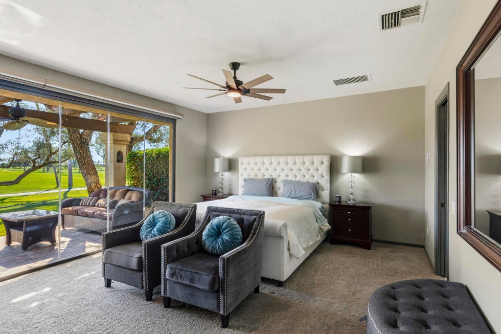 18th Hole Views & $120,000K in Designer Upgrades are yours in this pinnacle of desert living and impeccably upgraded residence at prestigious La Quinta Country Club. From the striking crystal and iron double front doors to the panoramic views of the 18th green, pond, and Santa Rosa National Monument mountains, every detail reflects a commitment to luxury and modern comfort. The heart of this home is designed for the ultimate indoor-outdoor lifestyle, featuring entire walls of foldable glass doors in both the Great Room and Primary Suite, spacious gourmet kitchen overlooking the greens, patio dining while enjoying the stunning views of the fountain, pond, and golf course. With over $120,000 in recent upgrades, home is offered fully furnished, making it a truly turnkey sanctuary. Premium features Include: Top-of-the-line Daikin HVAC system with recent new ducting, smart thermostats, an upgraded electrical panel, new water heater and plumbing updates in both bathrooms. Modern Tech: High-end motorized window shades and a dedicated EV car charger in the 2-car plus golf cart garage. Refined Design: Dual master suites, designer ceiling fans in every room, patios and a statement ''fandolier'' over the dining area for added comfort. The Location: Home is perfectly situated a short walk to La Quinta Country Clubs' Clubhouse, first hole and all club and membership ameneties. Across the street is historic and famed La Quinta Resort with beautiful gardens, dining, shops, and mountainviews. Just a short drive away or walk you will find chaming Old Town La Quinta with many boutique shops, fine dining, art shows and perfect for entertaining your friends, family or business associates. All this is ready for you to enjoy a new desert lifestyle wheather you are on the links enjoying a game with friends, hiking, biking or spending a restful day in your new home!