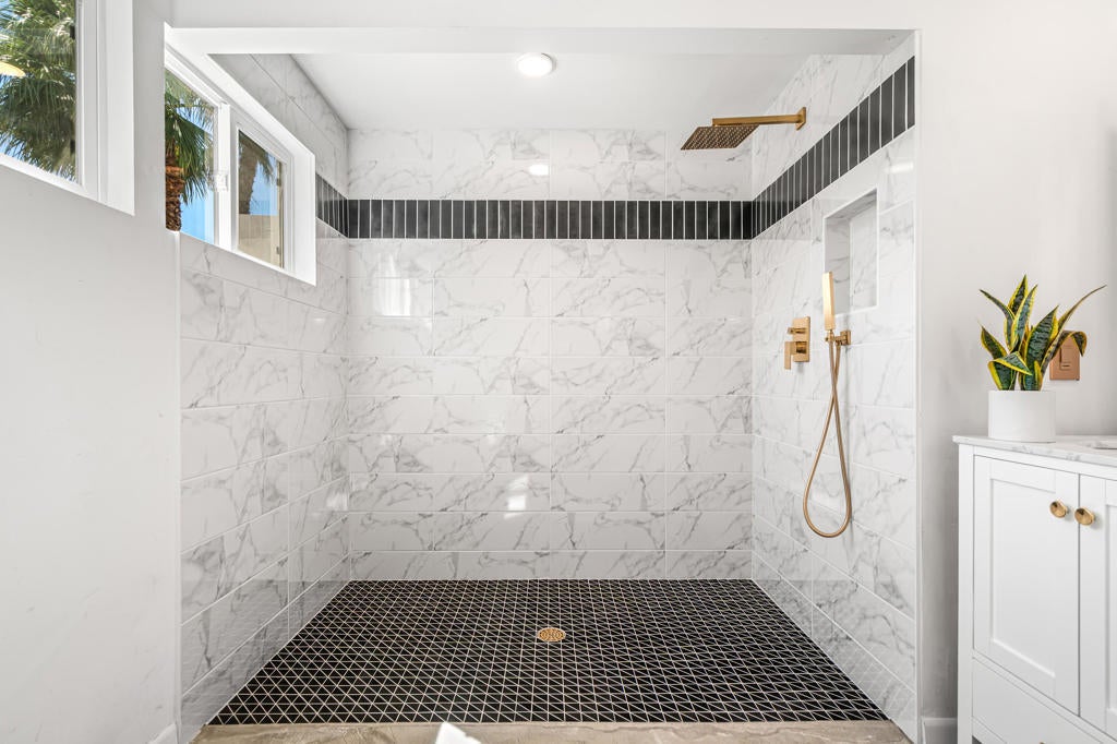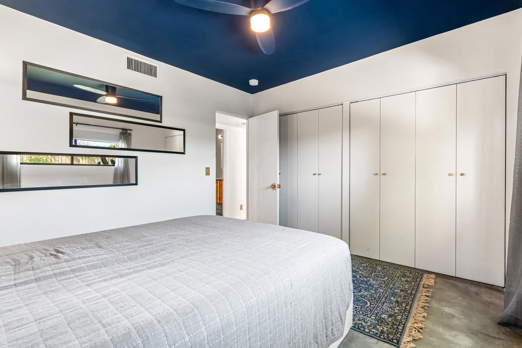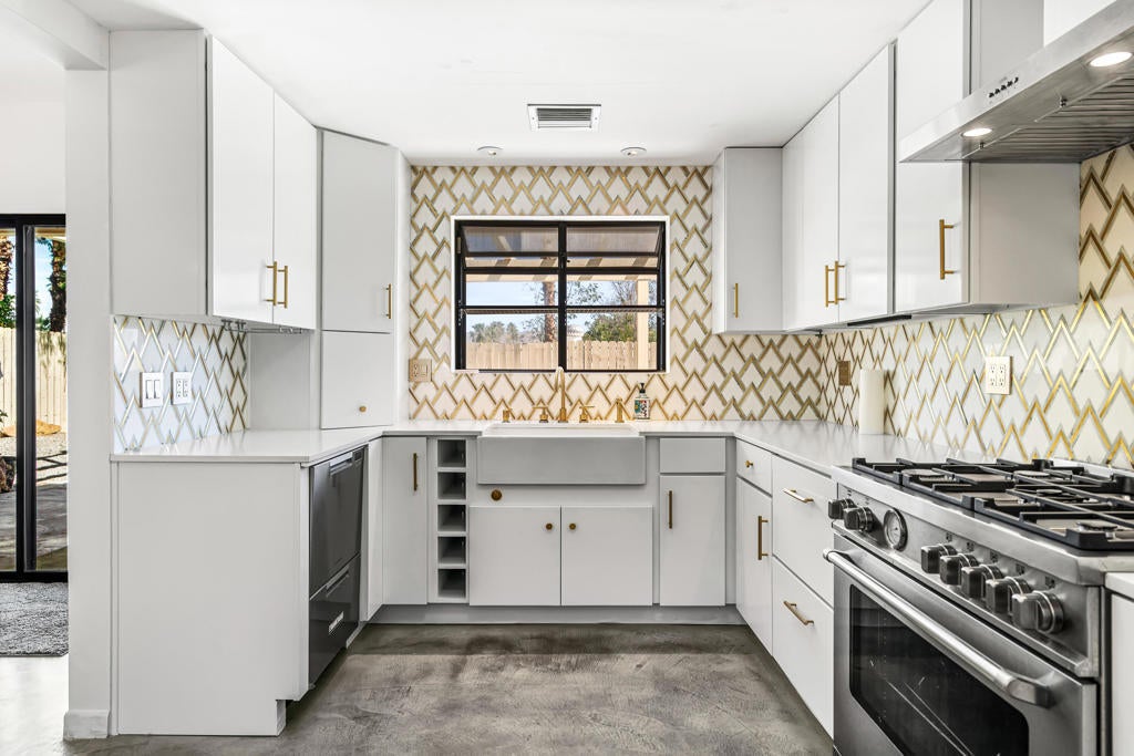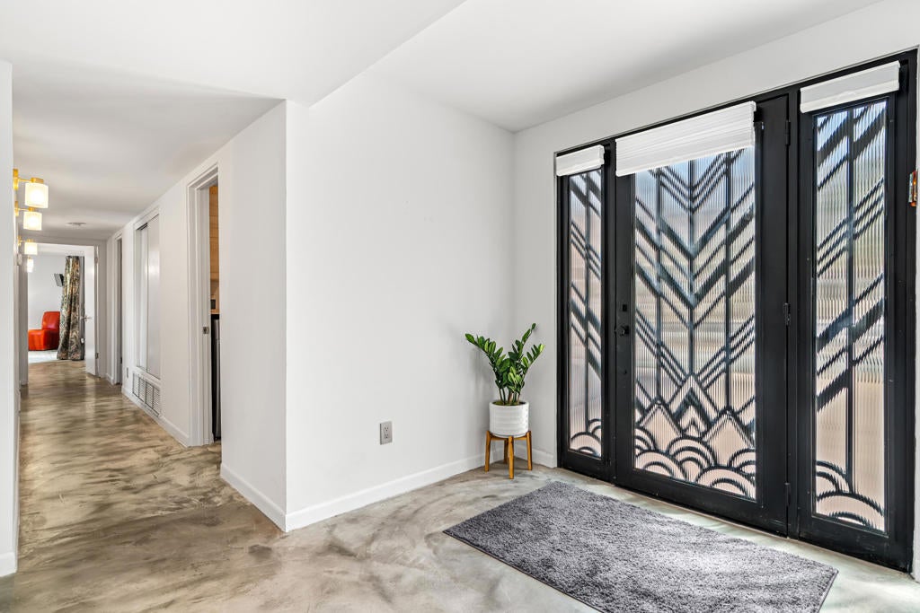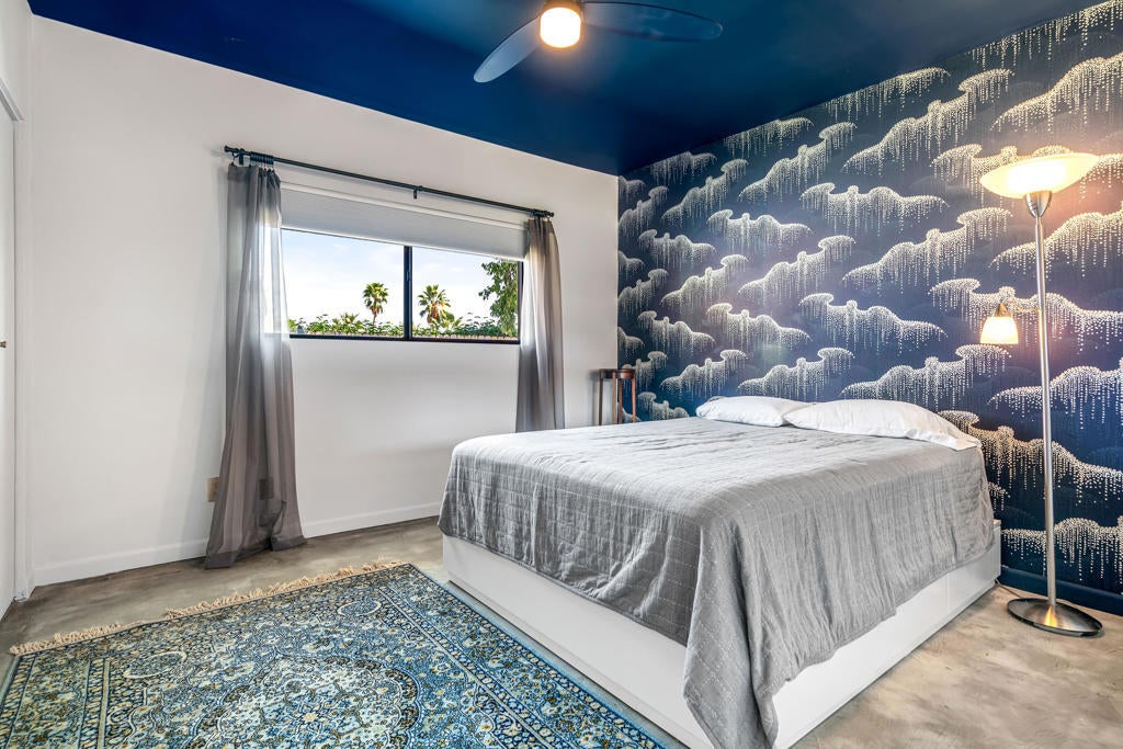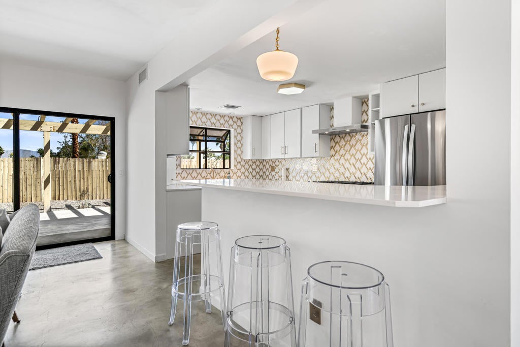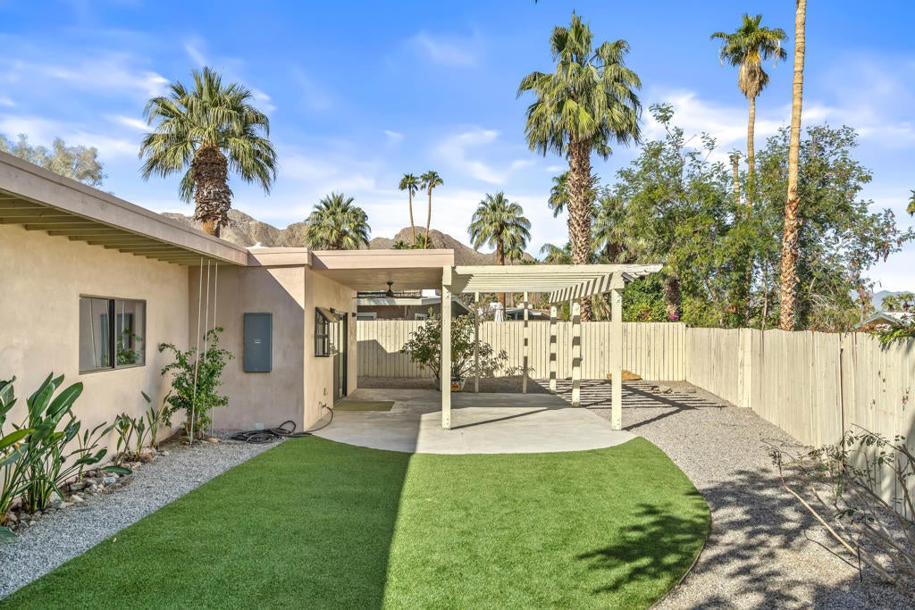 This renovated Mid-Century residence in the well-located Magnesia Falls neighborhood offers a welcoming open-concept interior and two private outdoor entertainment areas, with mountain cove views enjoyed from the patio off the primary bedroom.The current owner has thoughtfully improved the property, including stained concrete flooring, retextured interior walls, and a custom-designed iron front door. The kitchen has been upgraded with a European-inspired design, featuring new cabinetry, a designer tile backsplash, stainless steel appliances with range hood, and sleek stone countertops.The remodeled bathrooms include a brand-new spacious walk-in shower in the primary suite, a tiled guest bath, upgraded hardware, and newer vanities. The open living and dining areas are anchored by a striking rock fireplace with an extended tile facade reaching to the ceiling.Outdoor spaces are designed for low maintenance, with artificial turf, mature trees, patio coverage, and room for gardening. Additional features include a two-car garage with an expansive driveway, a dedicated laundry room, and two guest bedrooms.Magnesia Falls is ideally located just south of Historic Highway 111, offering convenient access to dining, shopping, and daily amenities, all with the benefit of no HOA.