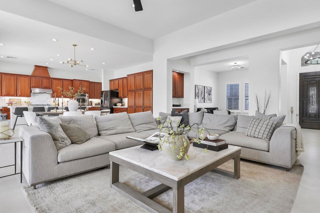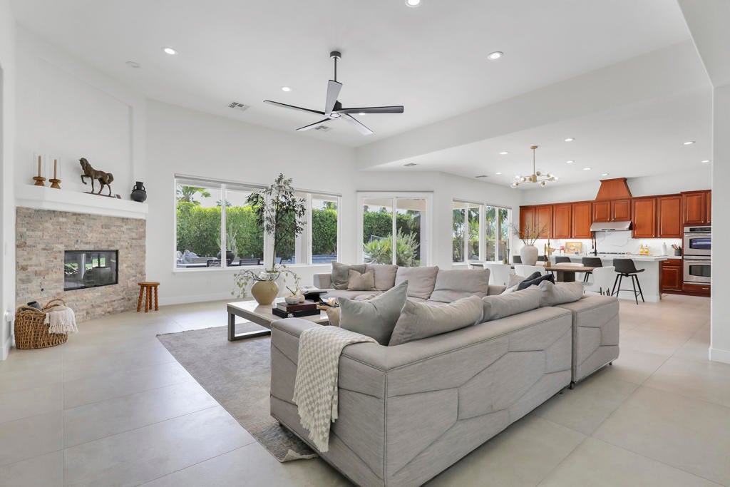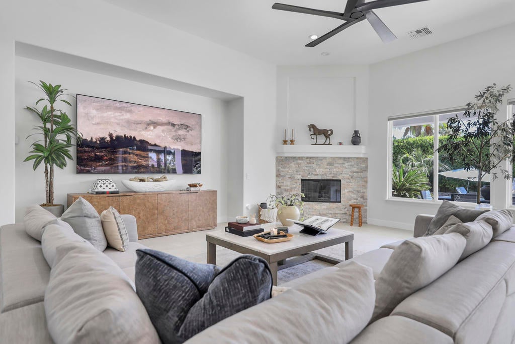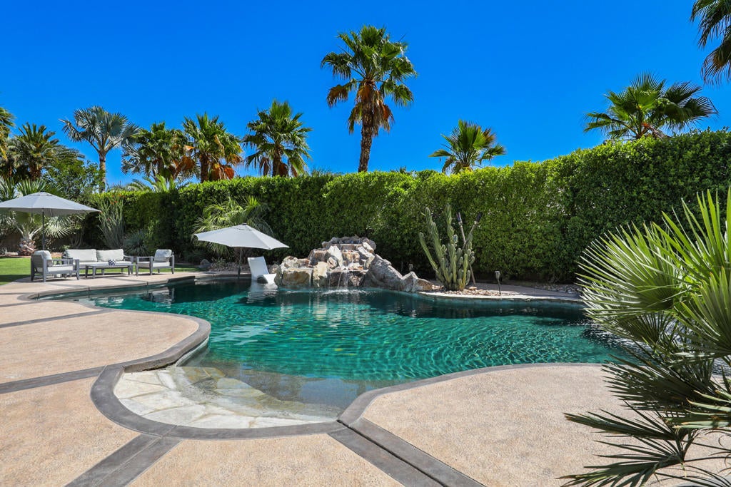 Modernized Desert River Estate | 22,216 SF Private Interior Compound. Sophistication, scale, and rare utility define this 2023-transformed residence. Situated on a premier interior lot within the tranquil, non-STR gates of Desert River Estates, this 3,150 SF estate offers a level of peace and versatility that is increasingly rare in the desert.The property's refined exterior maintains its classic Spanish architectural integrity, updated with a crisp white finish and natural stone accents. A gated entry courtyard features a traditional gas fireplace--the perfect setting for an intimate evening under the desert stars.The High-Capacity Social Core Designed for the host who values flow and connectivity, is the heart of the home and features:Massive 5-Person Island: A central quartz-topped anchor that bridges the kitchen and the expansive Great Room.Architectural Volume: High ceilings and walls of glass frame the resort-style pool/spa and rock waterfall.Designer Utility: Upgraded with 2' x 4' tile flooring and premium quartz surfaces for a cohesive, modern aesthetic.Resort-Style Saltwater Oasis. The backyard is a private sanctuary featuring a saltwater pool and spa. Designed with a gradual beach entrance and tanning shelf, it offers a true 'resort' feel, perfect for lounging or cooling off in the desert sun.Unmatched Logistics & Estate Potential. The hallmark of this property is its 22,216 SF interior footprint and exceptional infrastructure:70-Foot Driveway: Exceptional depth for multiple vehicles or a luxury RV (a rarity in gated communities), plus a large 3-car garage.Dual Side Yards: Unparalleled clearance for a future Casita, ADU, or sports court.Long-Term Privacy: In a community that does not allow short-term rentals, you are guaranteed a quiet, stable neighborhood environment.Versatile Layout with Primary suite separated from other bedrooms by the office.Primary Sanctuary: A dedicated retreat with dual walk-in closets (featuring combo locks) and a spa-inspired bath with a freestanding soaking tub.Multi-Use Wing: Three generous guest rooms plus a dedicated office which offers the flexibility for a 5th bedroom, an executive workspace, gym, or studio.Showing Information: To maintain the privacy and exclusivity of this residence, private tours are available by appointment only for pre-approved buyers.