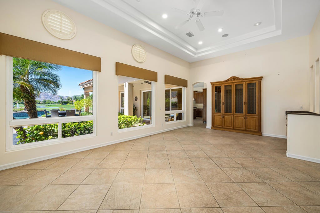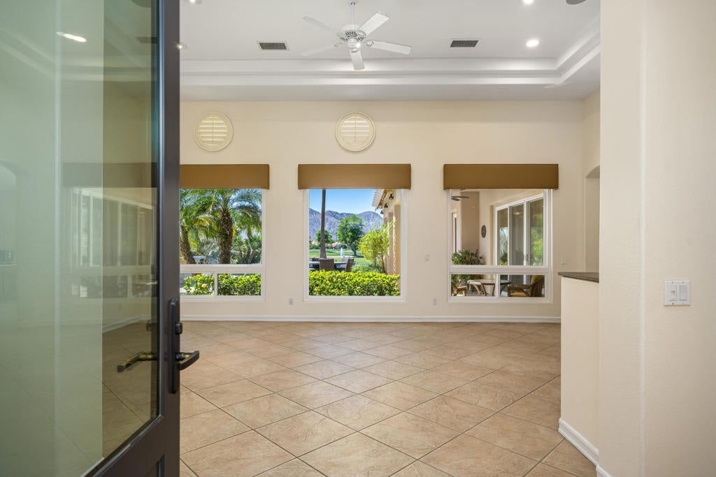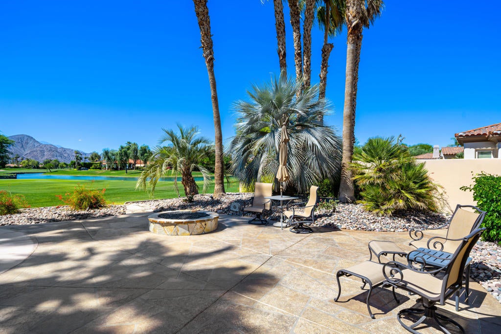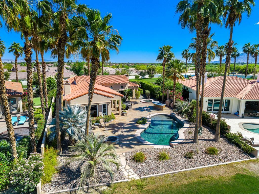 Perfectly positioned within The Citrus Club, this beautifully upgraded Trovita 2 residence offers refined desert living on an oversized 13,000+ square foot premium lot. Enjoy your morning coffee on your expansive patio with sweeping double fairway views and panoramic vistas of the Santa Rosa Mountains. At the heart of the home, a custom-renovated kitchen with stainless steel appliances and a walk-in pantry opens to the family room, while a wall of glass sliders invites the outdoors in. Designed with comfort and flexibility in mind, each bedroom offers its own en suite bath, ideal for visiting guests. The third guest bedroom is currently configured as an office with a built-in workspace. The property has been meticulously maintained and boasts remote controlled window coverings and exterior retractable awnings. The formal living and dining area feature a custom built-in, temperature-controlled wine cabinet. Multiple seating and gathering areas create the perfect environment for hosting friends or simply enjoying the peaceful desert surroundings. Enjoy your private gazebo in the afternoons or take in the sunset by your firepit in the evenings overlooking both the 13th and 14th fairways of the Pete Dye designed golf course. A rare opportunity to own one of the most desirable view properties in The Citrus. Close proximity to the Desert International Horse Park, SilverRock Golf Course, Old Town La Quinta, El Dorado and Empire Polo, Thermal Race Track, Thermal Airport and more. HOA inc cable/wifi, front landscaping, 24/7 guard gate.